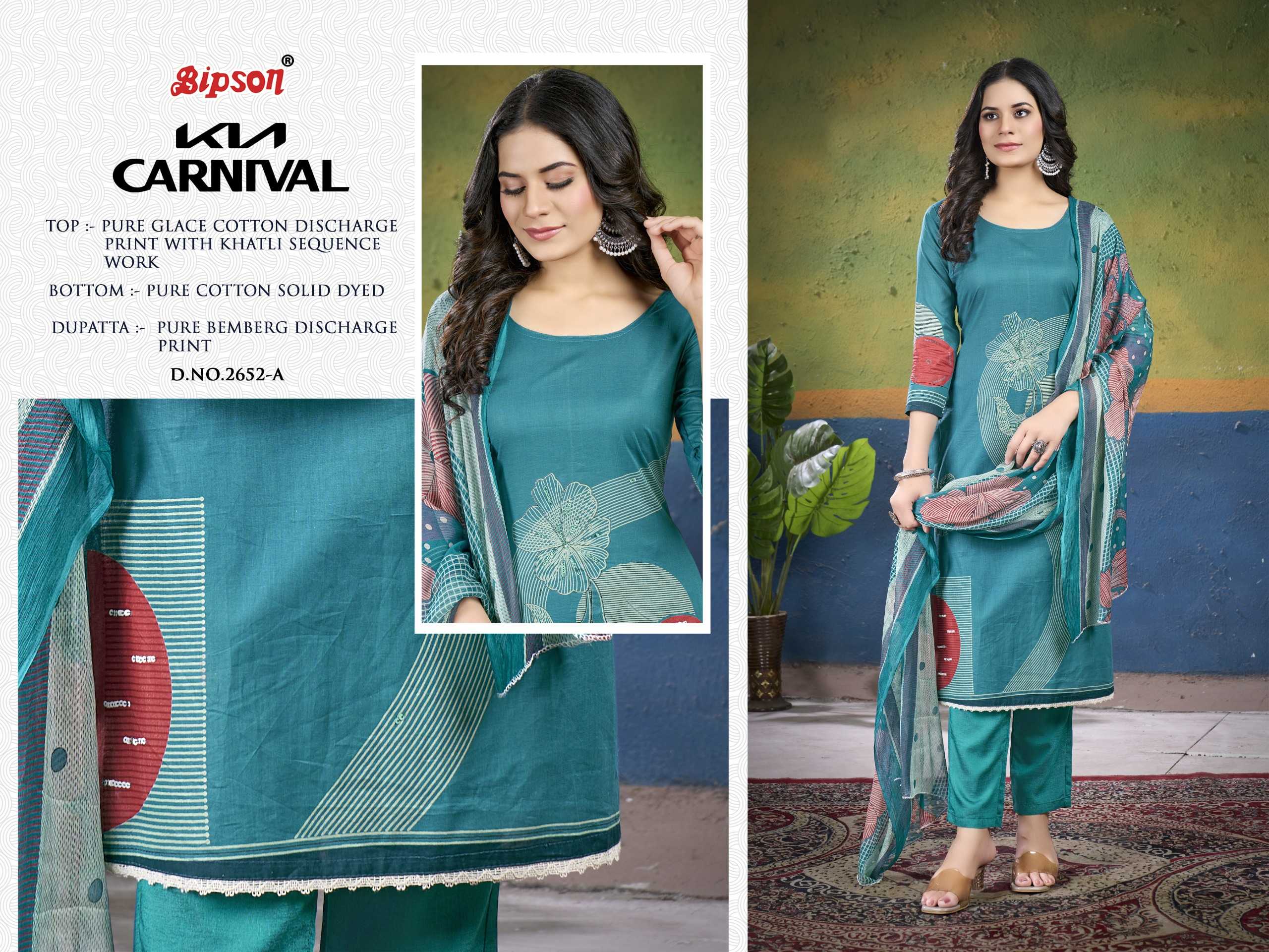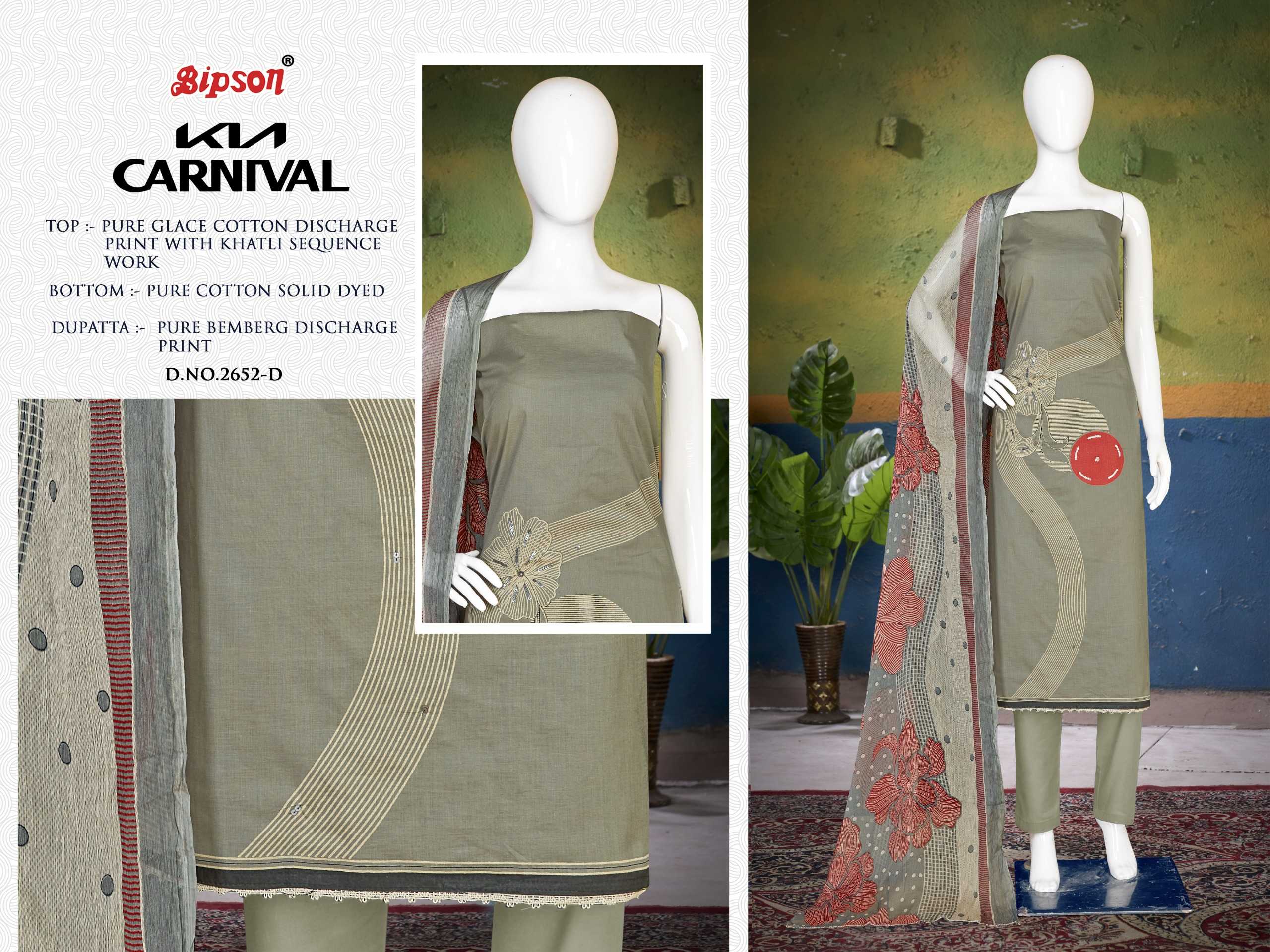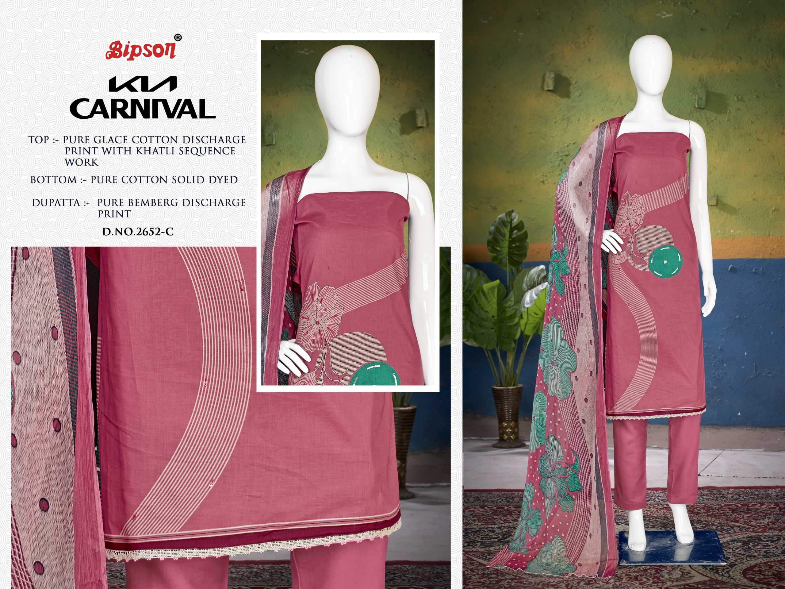 Looking for bipson prints kia carnival 2652 fancy comfortable salwar suit material exports Full Catalouge at Best Price? Buy Now bipson prints kia carnival 2652 fancy comfortable salwar suit material exports at Wholesale Rate of Rs 2900 with Total 4 Pcs from authroized dealer and supplier of Bipson Fashion Brand. Cost of Each piece is just only Rs 725 which is very low and affordable price to resale the product in your retail store. rrgandhi is Surat based Wholesale Supplier & Dealer of Bipson Fashion Brand. Click on Brand name to Know more about Brand's products.