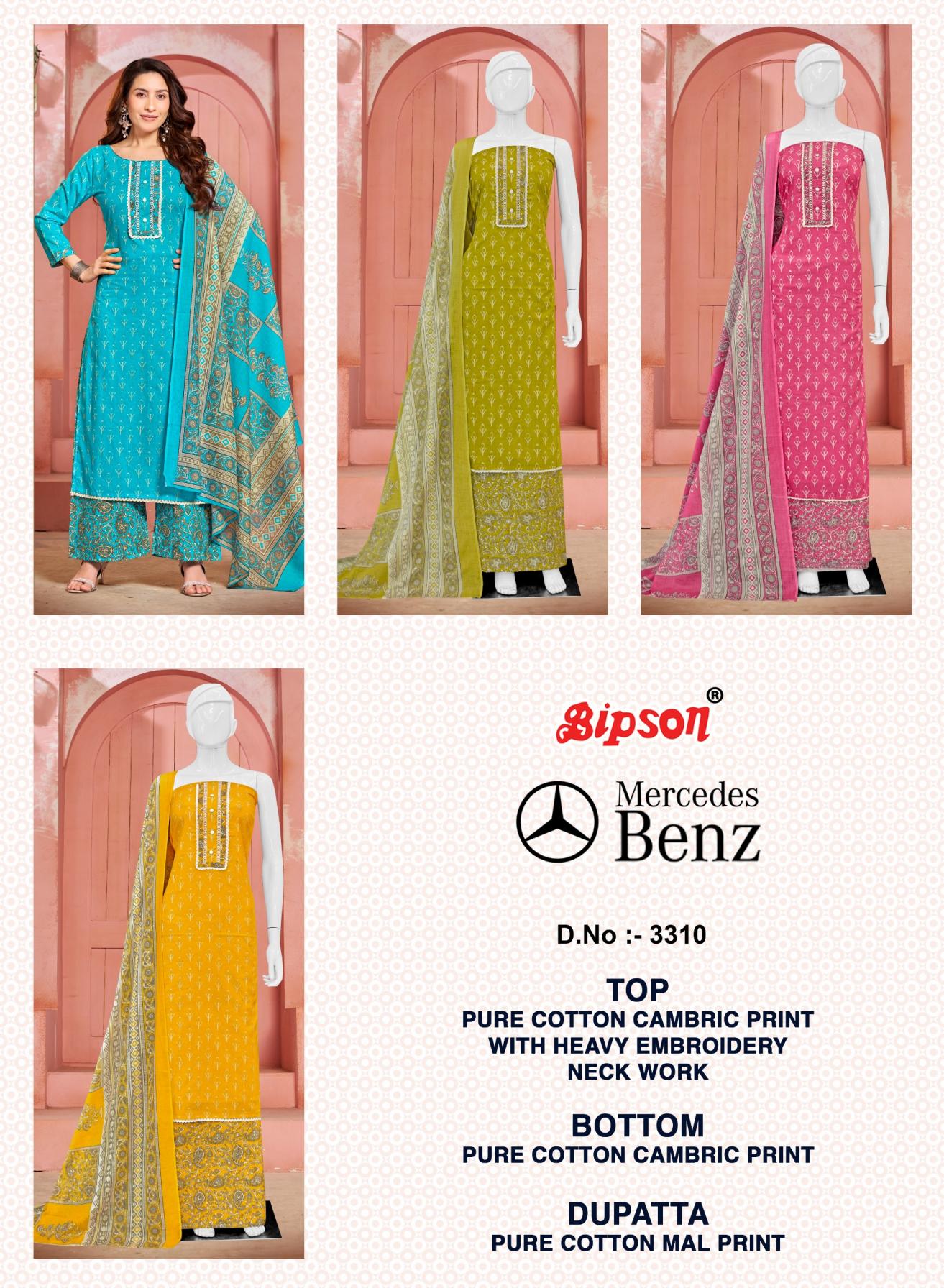 Looking for BIPSON PRINTS MERCEDES 3310 COTTON 3PCS DRESS Full Catalouge at Best Price? Buy Now BIPSON PRINTS MERCEDES 3310 COTTON 3PCS DRESS at Wholesale Rate of Rs 2380 with Total 4 Pcs from authroized dealer and supplier of Bipson Fashion Brand. Cost of Each piece is just only Rs 595 which is very low and affordable price to resale the product in your retail store. rrgandhi is Surat based Wholesale Supplier & Dealer of Bipson Fashion Brand. Click on Brand name to Know more about Brand's products.