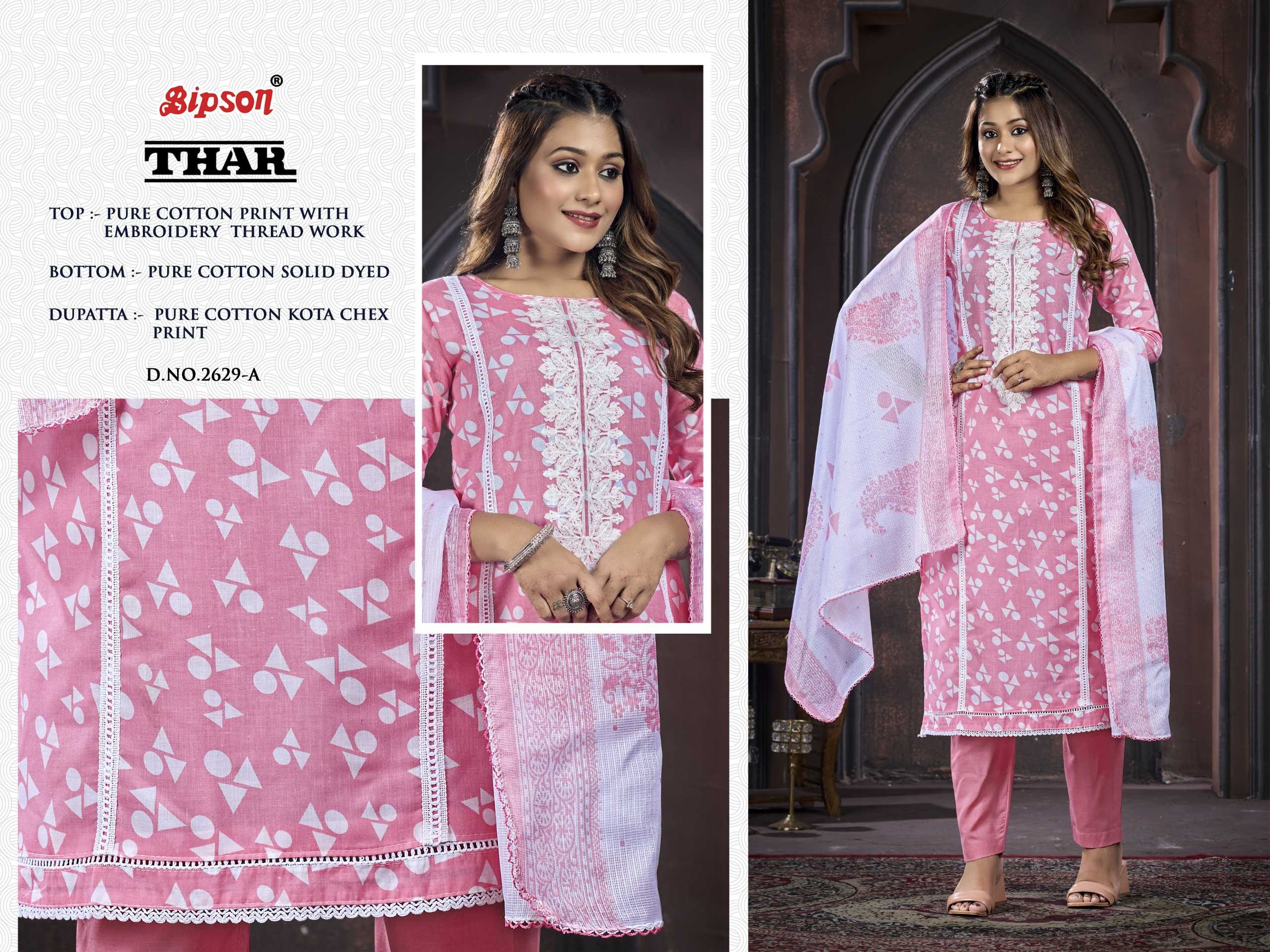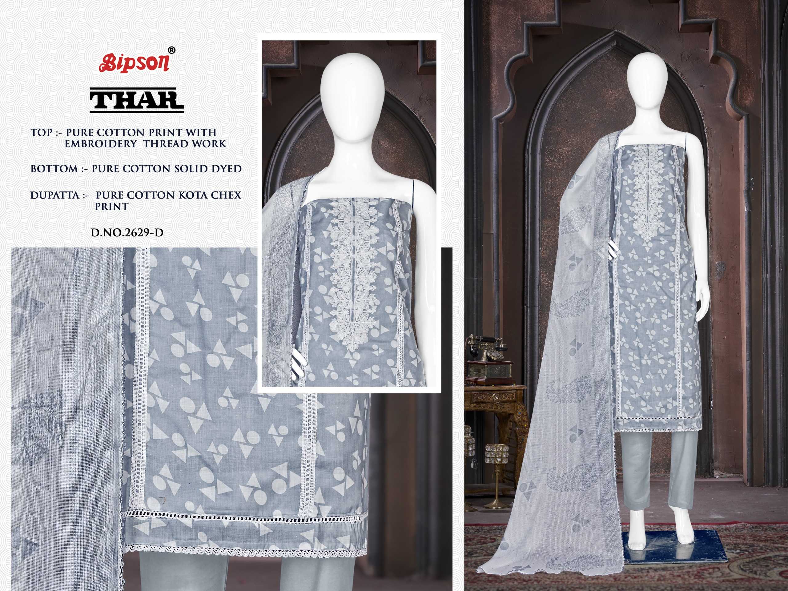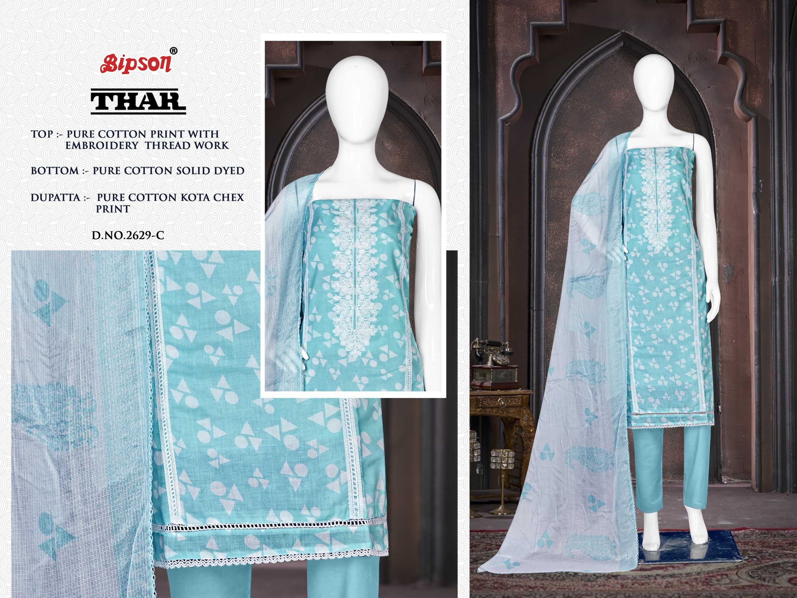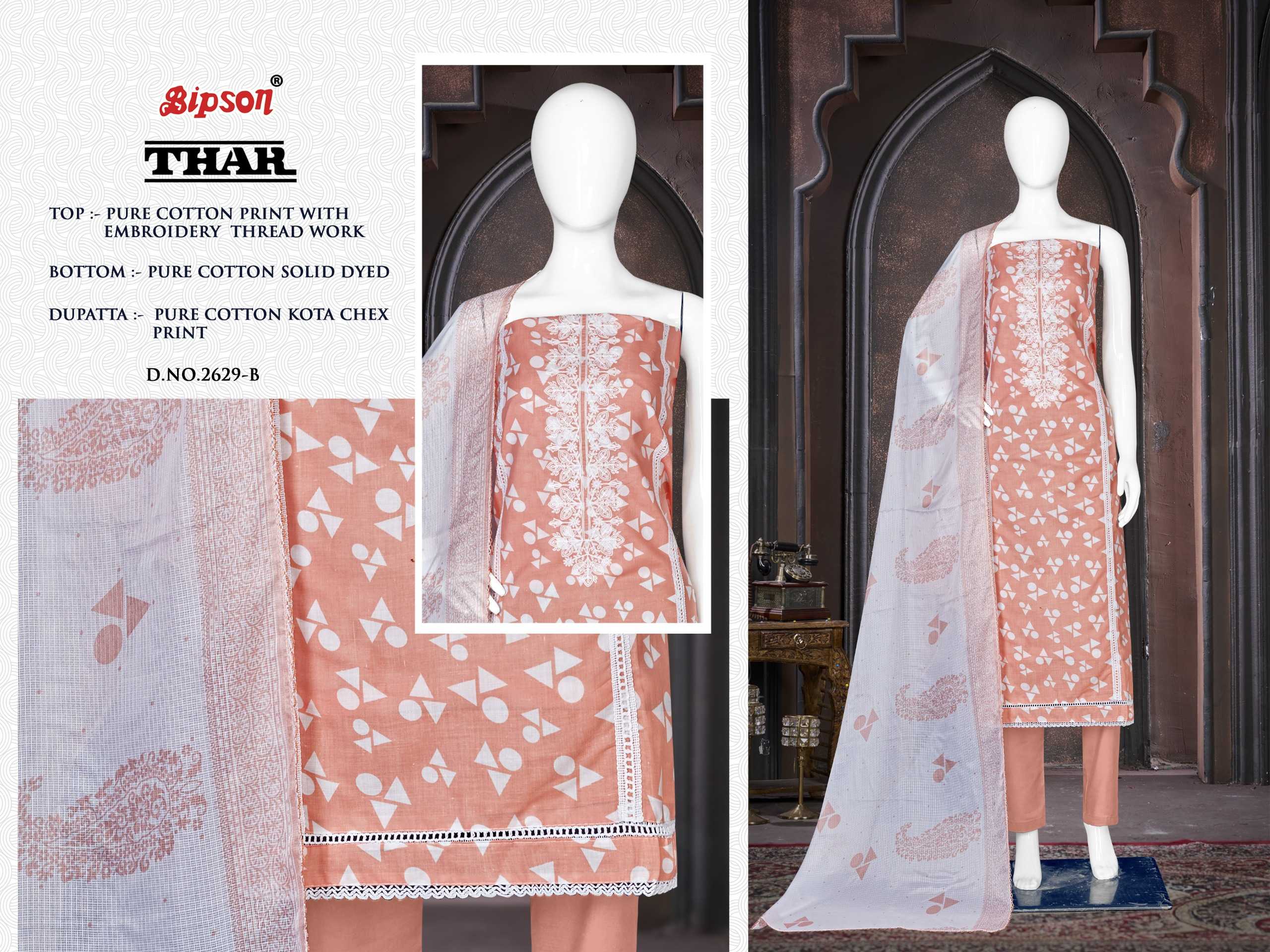 Looking for bipson prints presents thar 2629 fancy cotton salwar suit material supplier Full Catalouge at Best Price? Buy Now bipson prints presents thar 2629 fancy cotton salwar suit material supplier at Wholesale Rate of Rs 2220 with Total 4 Pcs from authroized dealer and supplier of Bipson Fashion Brand. Cost of Each piece is just only Rs 555 which is very low and affordable price to resale the product in your retail store. rrgandhi is Surat based Wholesale Supplier & Dealer of Bipson Fashion Brand. Click on Brand name to Know more about Brand's products.