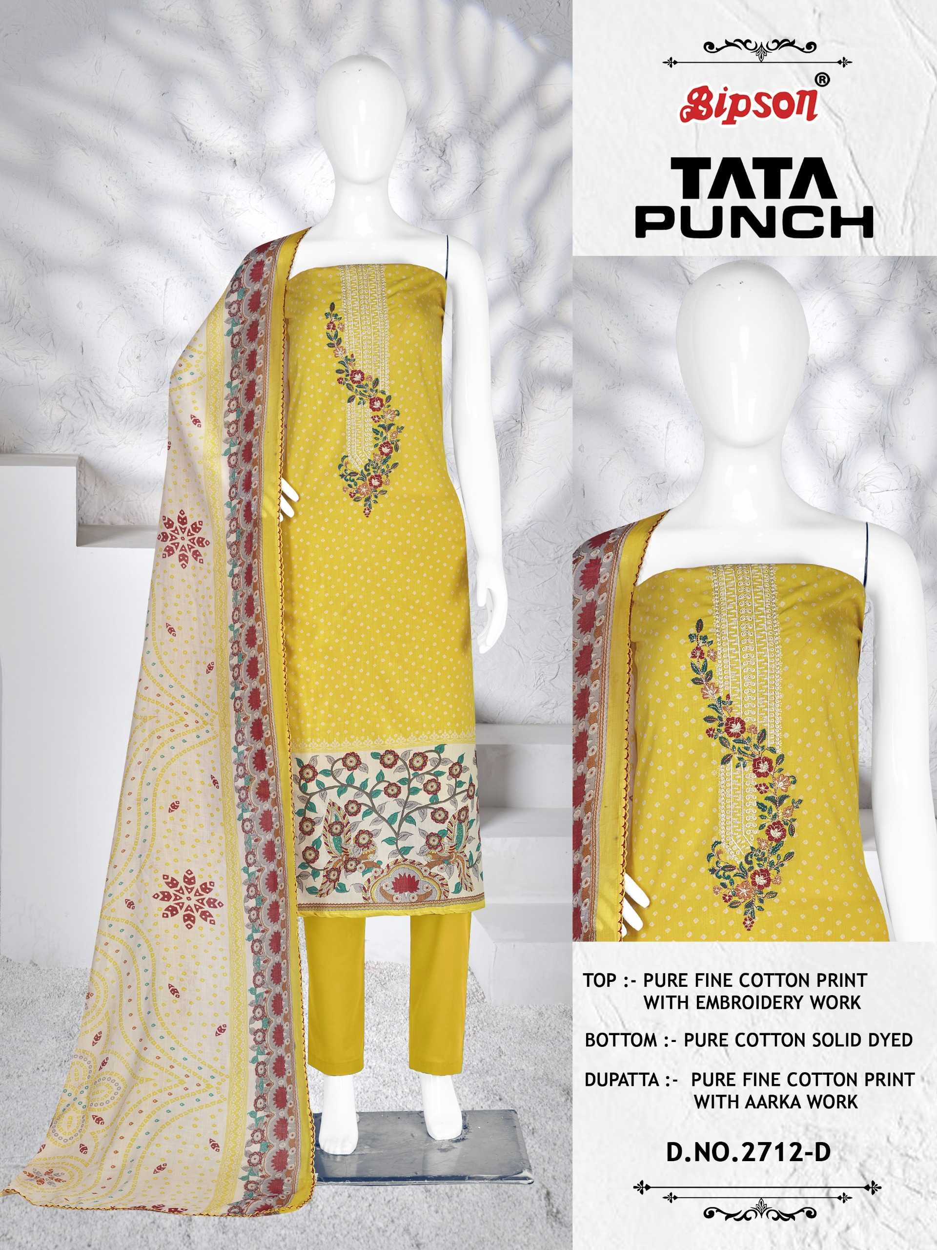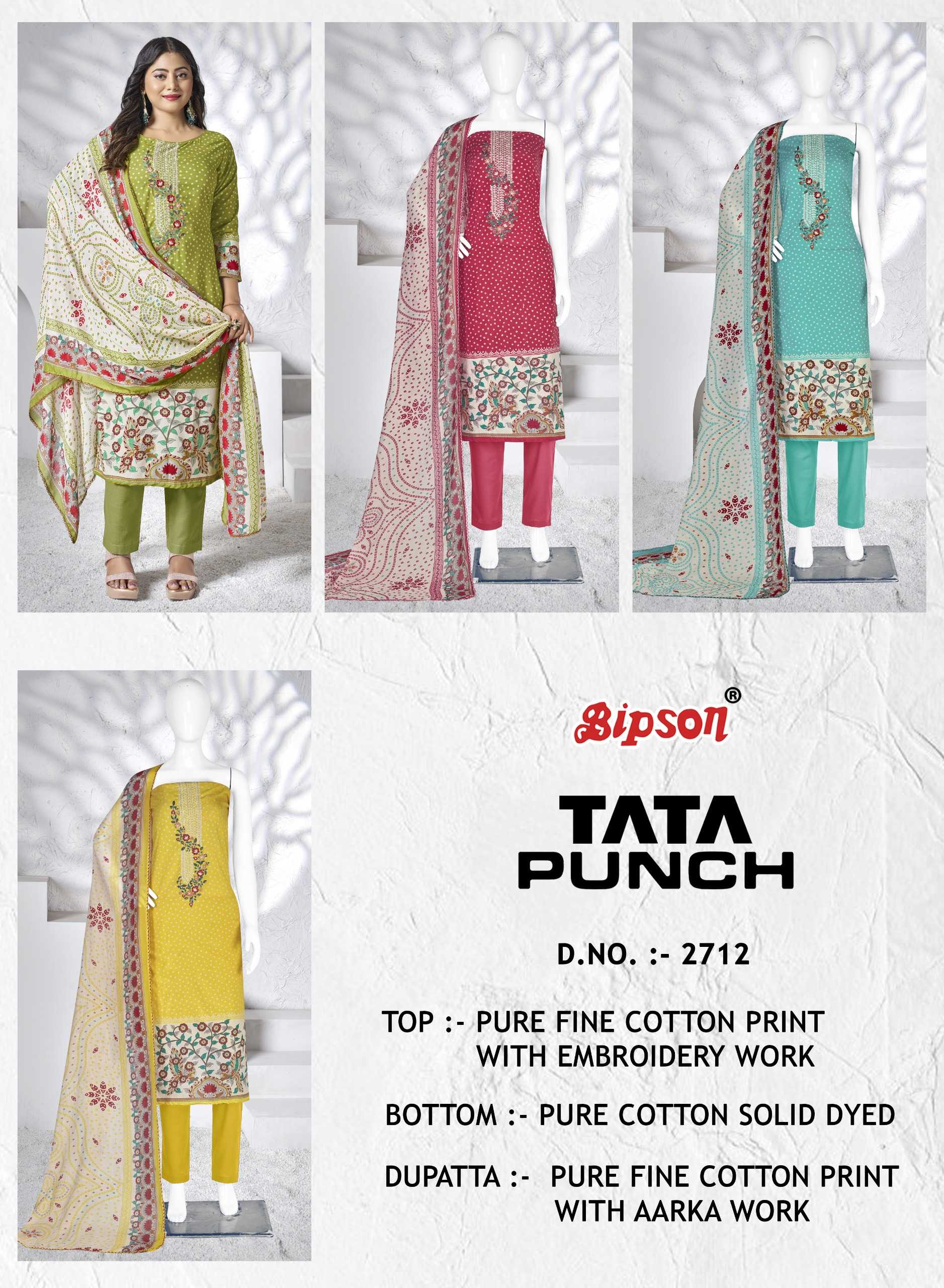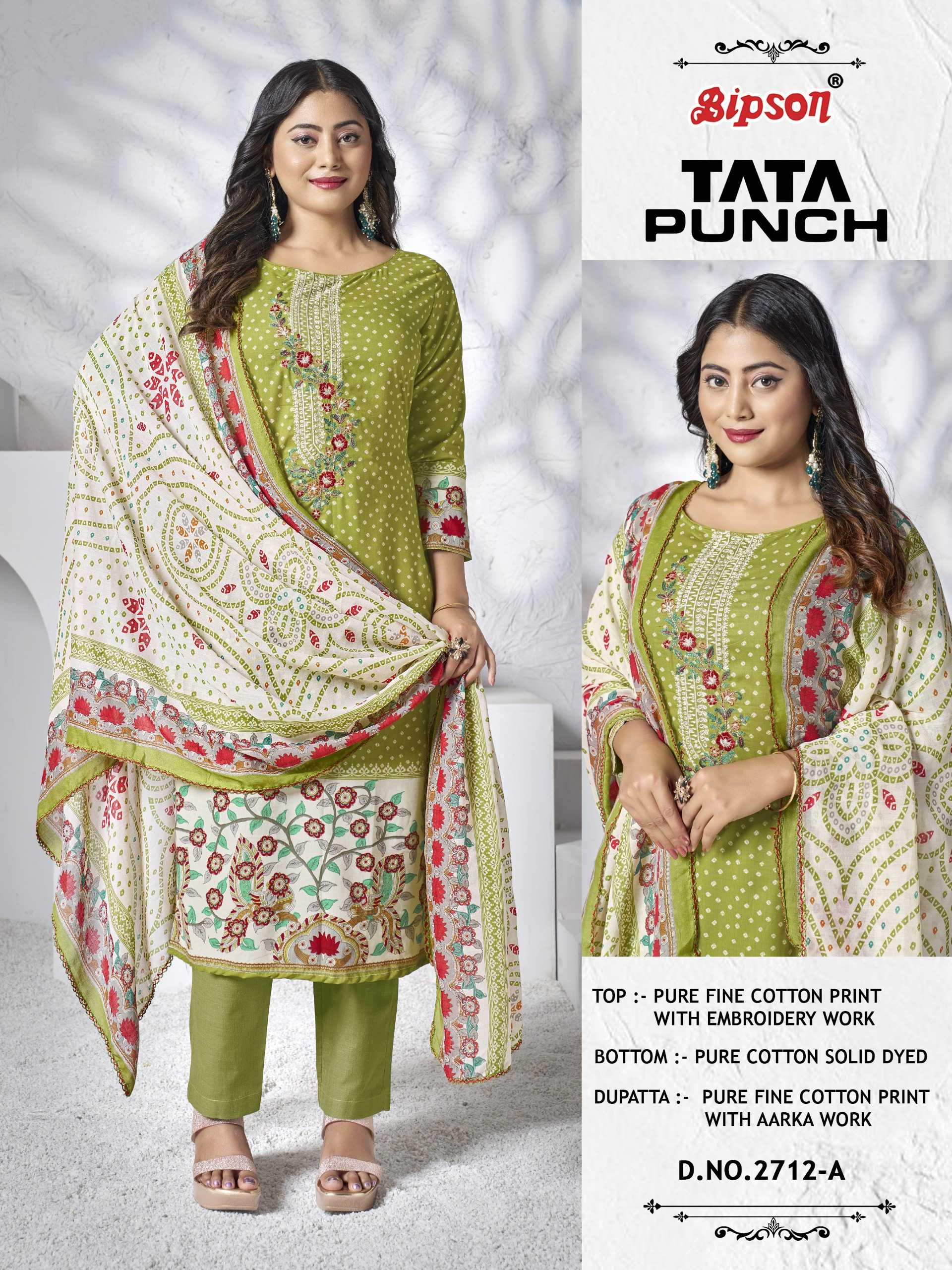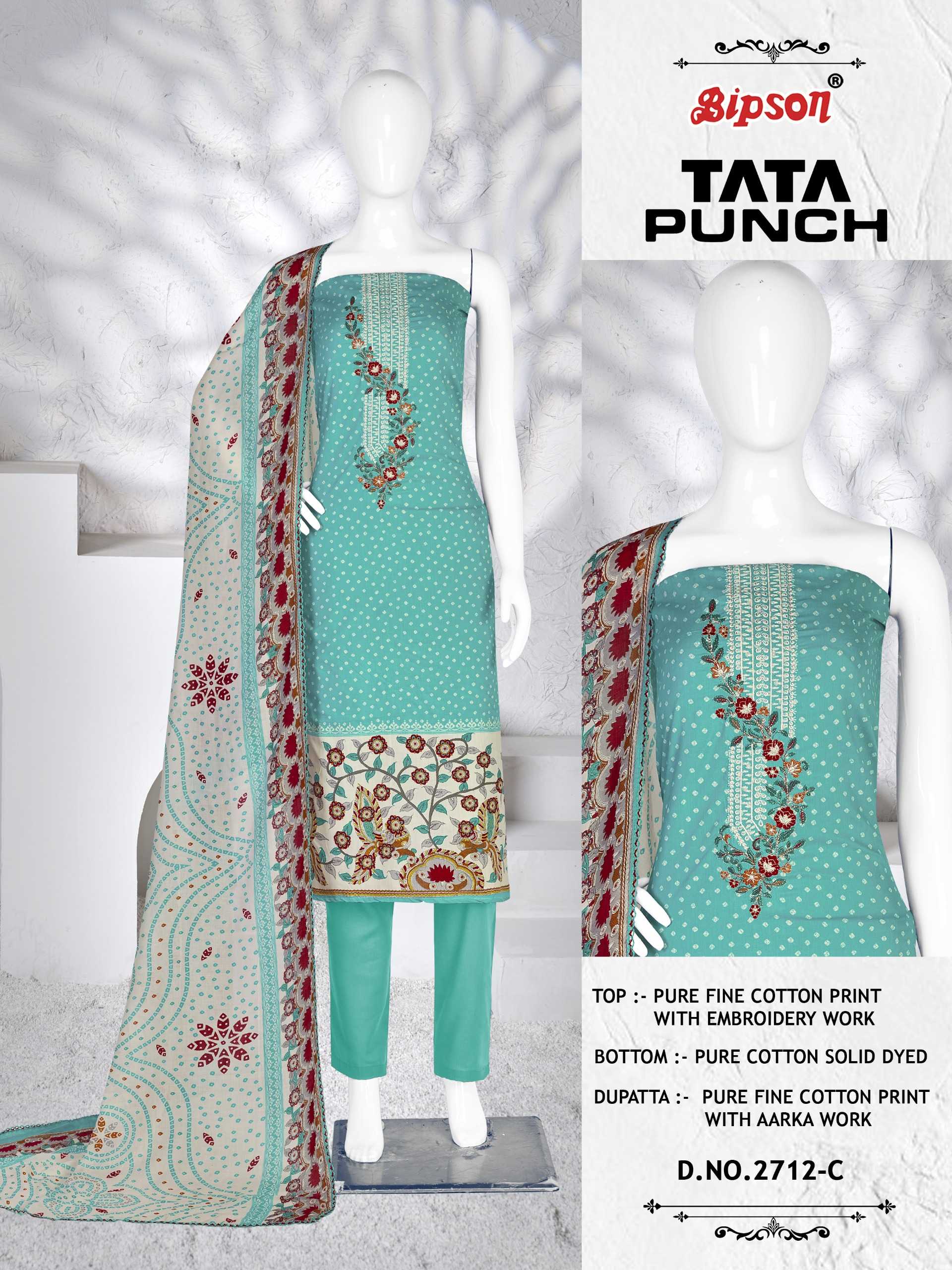 Looking for bipson prints tata punch 2712 cotton casual fancy print salwar suit Full Catalouge at Best Price? Buy Now bipson prints tata punch 2712 cotton casual fancy print salwar suit at Wholesale Rate of Rs 2220 with Total 4 Pcs from authroized dealer and supplier of Bipson Fashion Brand. Cost of Each piece is just only Rs 555 which is very low and affordable price to resale the product in your retail store. rrgandhi is Surat based Wholesale Supplier & Dealer of Bipson Fashion Brand. Click on Brand name to Know more about Brand's products.