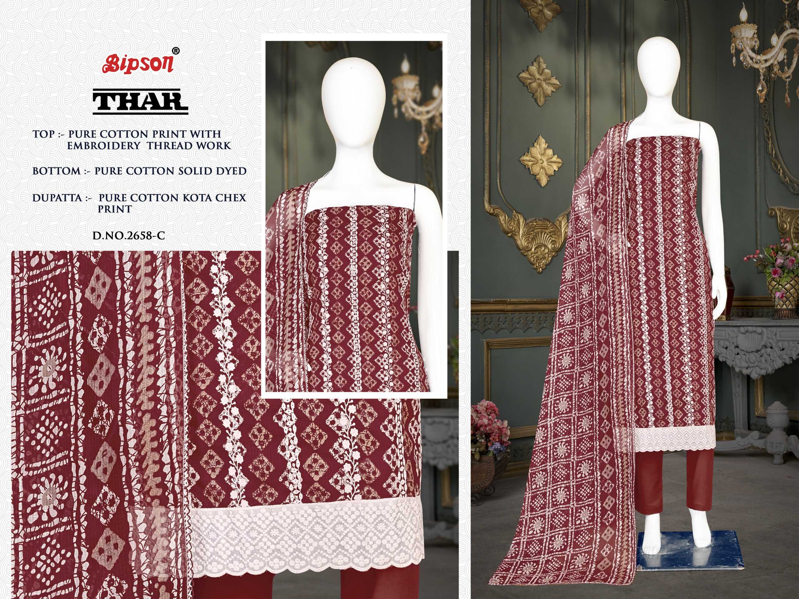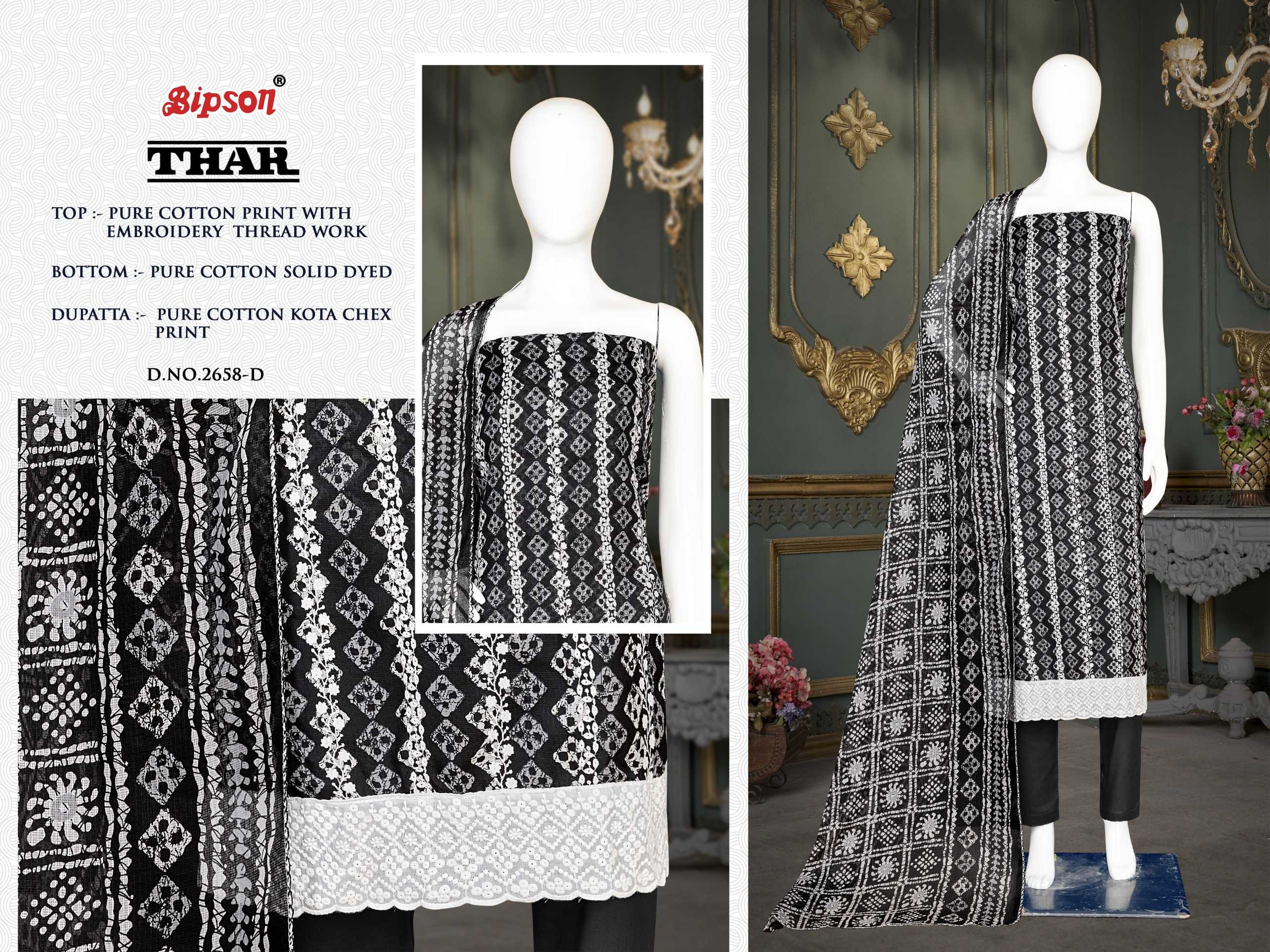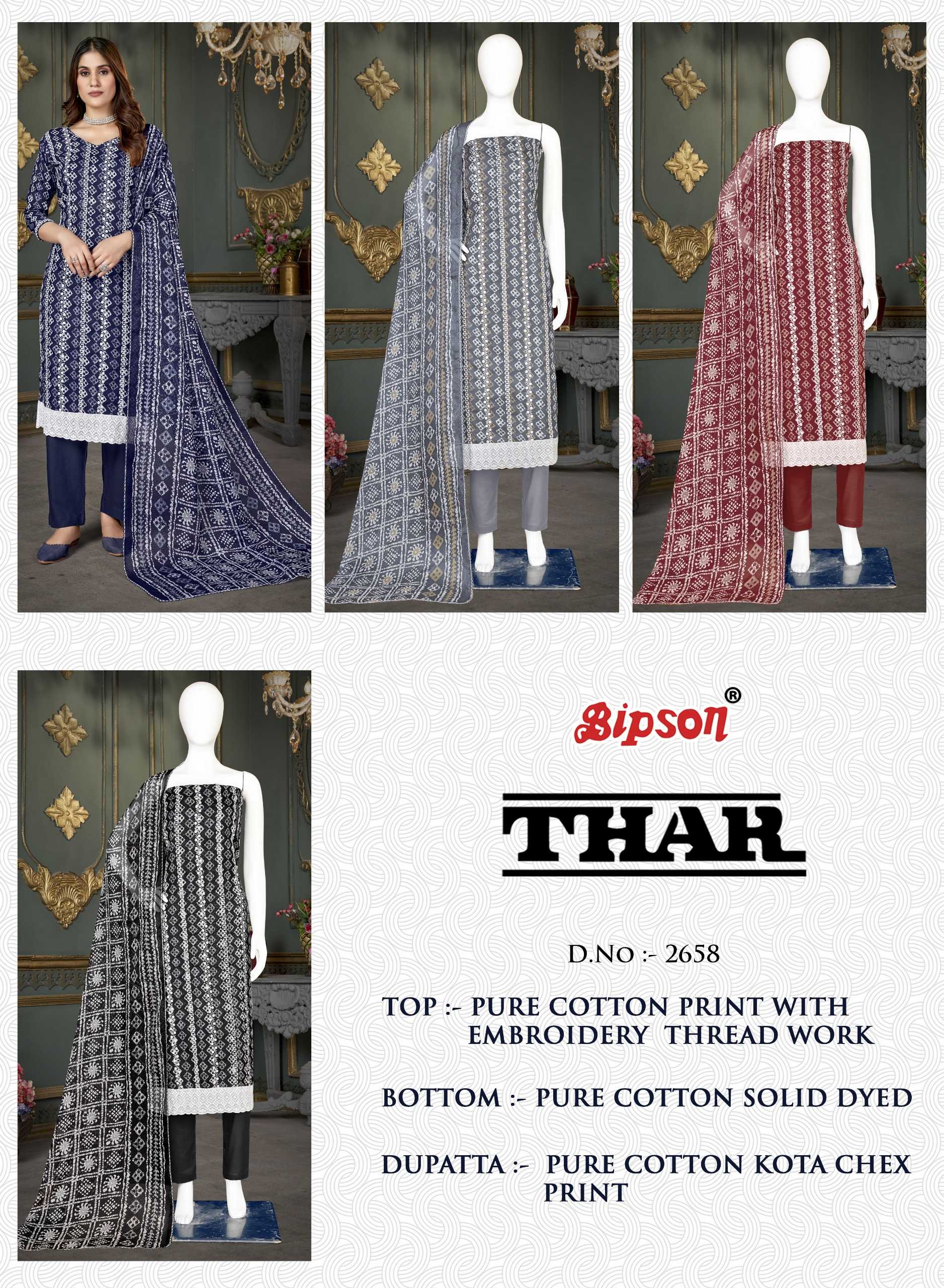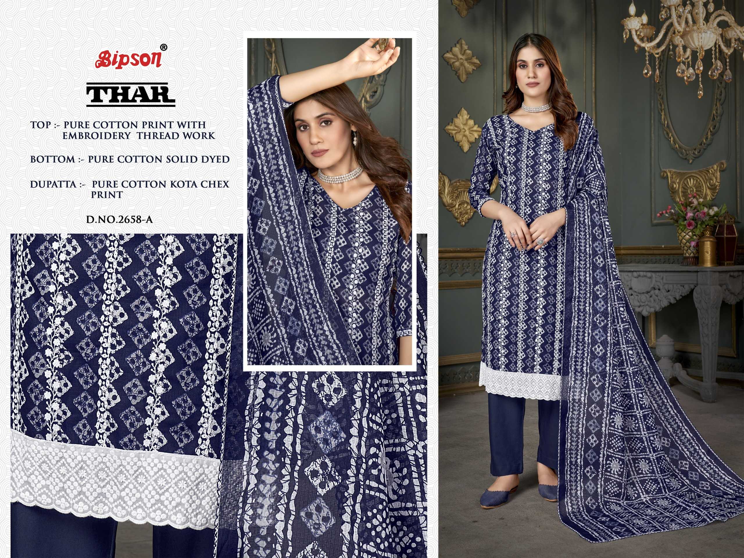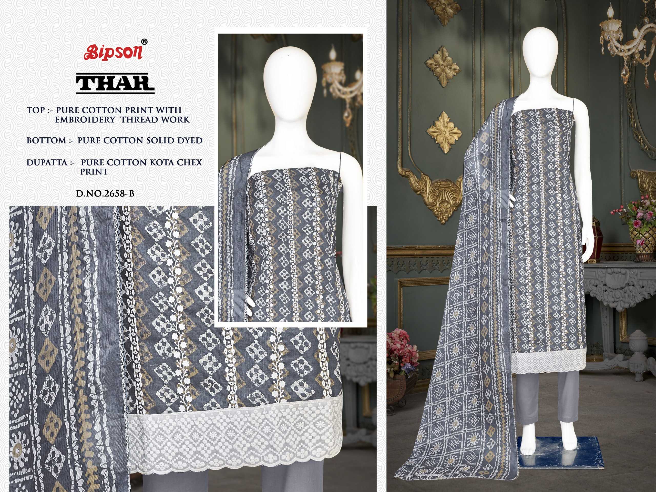 Looking for bipson prints thar 2658 launching cotton comfortable salwar suit material Full Catalouge at Best Price? Buy Now bipson prints thar 2658 launching cotton comfortable salwar suit material at Wholesale Rate of Rs 2220 with Total 4 Pcs from authroized dealer and supplier of Bipson Fashion Brand. Cost of Each piece is just only Rs 555 which is very low and affordable price to resale the product in your retail store. rrgandhi is Surat based Wholesale Supplier & Dealer of Bipson Fashion Brand. Click on Brand name to Know more about Brand's products.