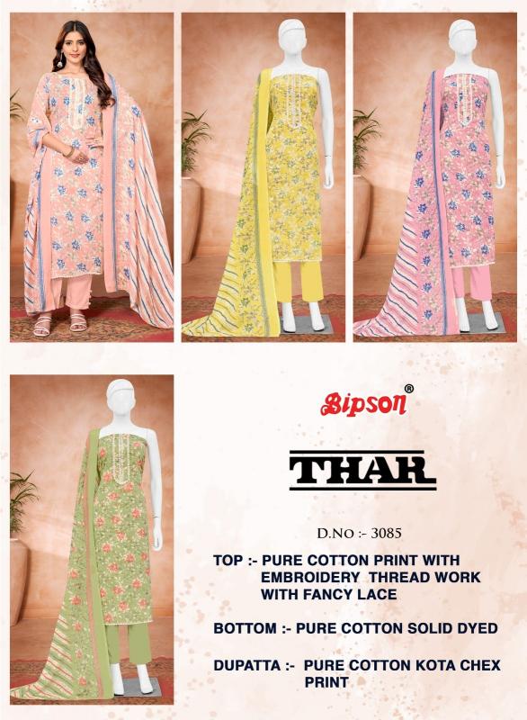 Looking for bipson prints thar 3085 cotton comfortable unstitch suit Full Catalouge at Best Price? Buy Now bipson prints thar 3085 cotton comfortable unstitch suit at Wholesale Rate of Rs 2220 with Total 4 Pcs from authroized dealer and supplier of Bipson Fashion Brand. Cost of Each piece is just only Rs 555 which is very low and affordable price to resale the product in your retail store. rrgandhi is Surat based Wholesale Supplier & Dealer of Bipson Fashion Brand. Click on Brand name to Know more about Brand's products.