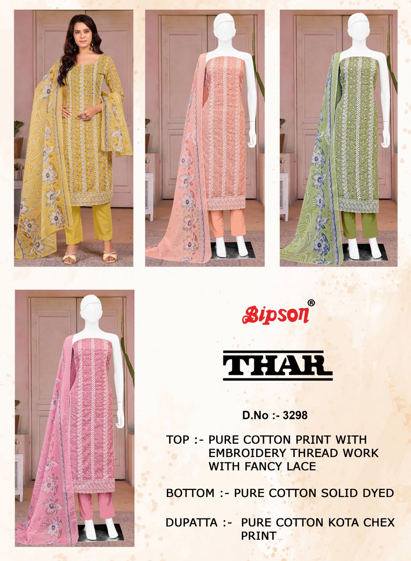 Looking for BIPSON PRINTS THAR 3298 COTTON ETHNIC SUIT FOR WOMENS Full Catalouge at Best Price? Buy Now BIPSON PRINTS THAR 3298 COTTON ETHNIC SUIT FOR WOMENS at Wholesale Rate of Rs 2140 with Total 4 Pcs from authroized dealer and supplier of Bipson Fashion Brand. Cost of Each piece is just only Rs 535 which is very low and affordable price to resale the product in your retail store. rrgandhi is Surat based Wholesale Supplier & Dealer of Bipson Fashion Brand. Click on Brand name to Know more about Brand's products.