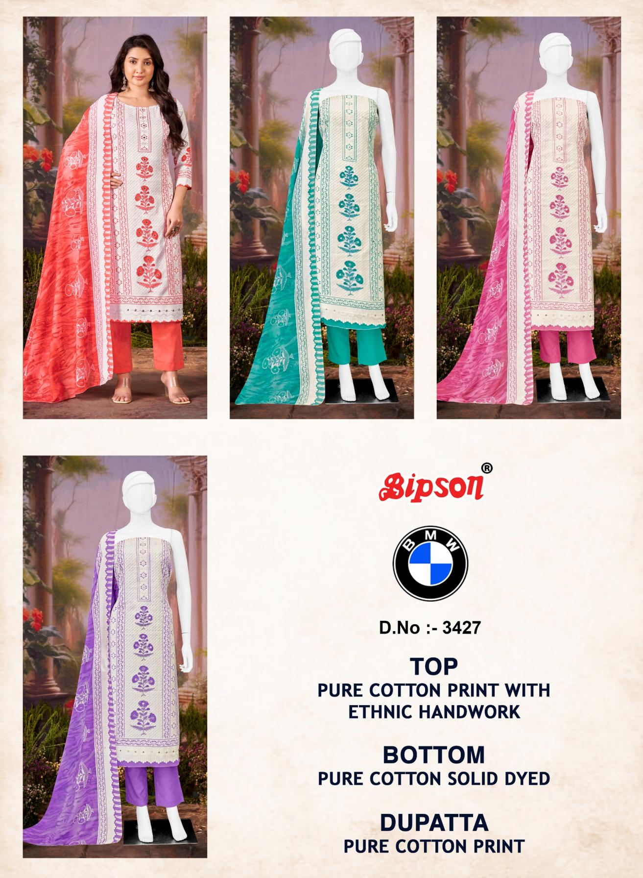 Looking for BMW 3427 BY BIPSON PRINTS COTTON PRETTY SALWAR KAMEEZ Full Catalouge at Best Price? Buy Now BMW 3427 BY BIPSON PRINTS COTTON PRETTY SALWAR KAMEEZ at Wholesale Rate of Rs 1980 with Total 4 Pcs from authroized dealer and supplier of Bipson Fashion Brand. Cost of Each piece is just only Rs 495 which is very low and affordable price to resale the product in your retail store. rrgandhi is Surat based Wholesale Supplier & Dealer of Bipson Fashion Brand. Click on Brand name to Know more about Brand's products.