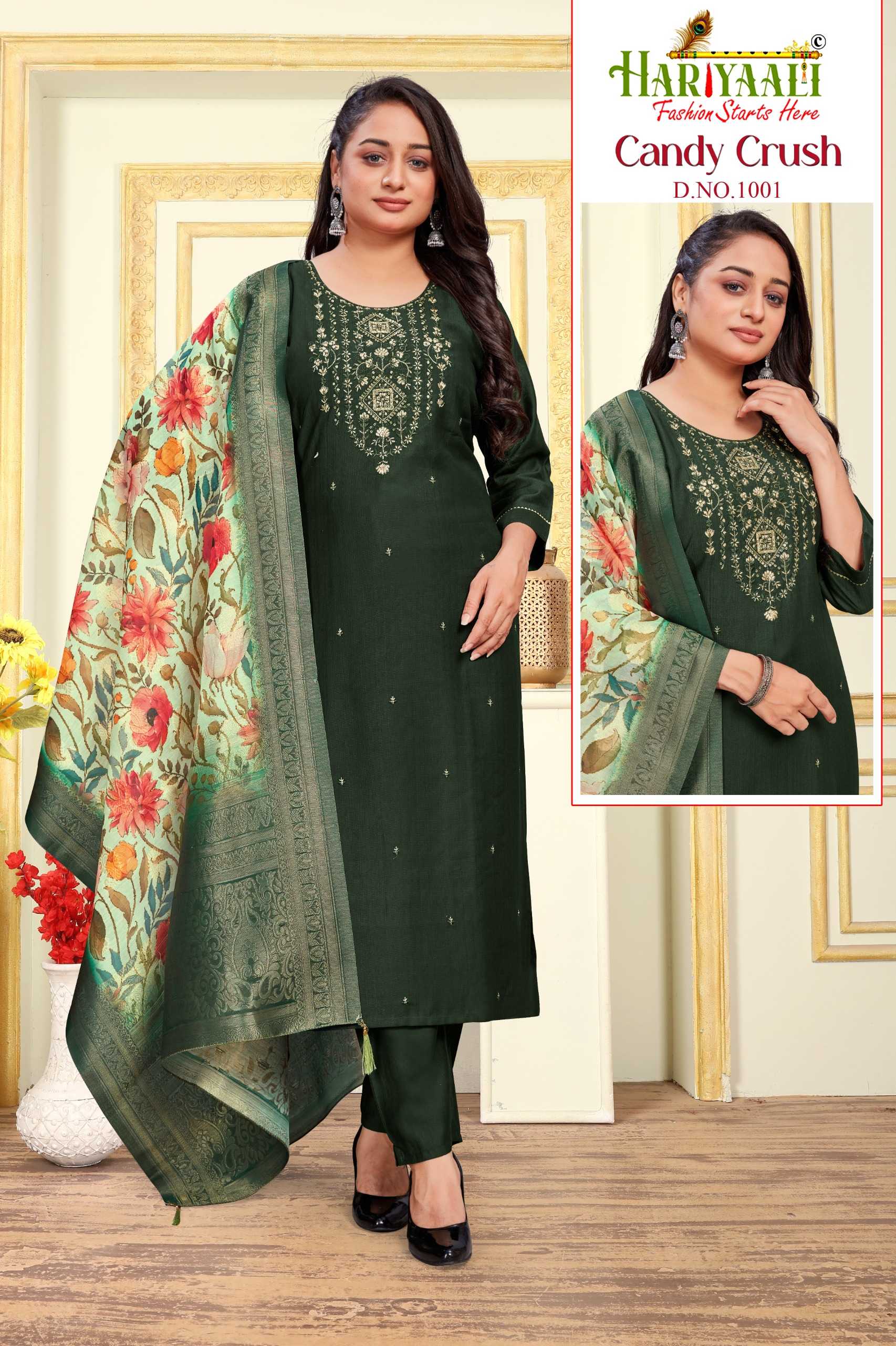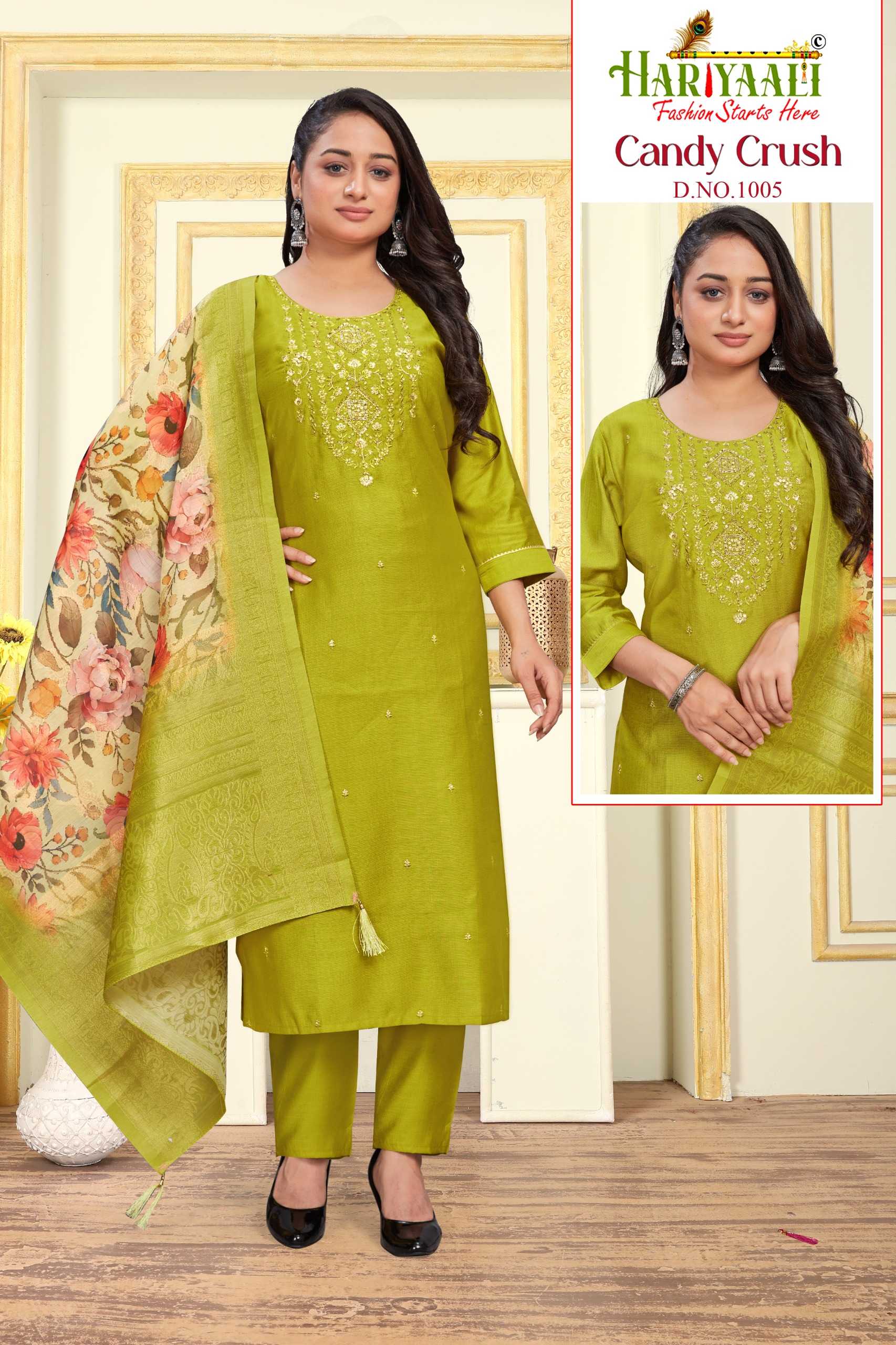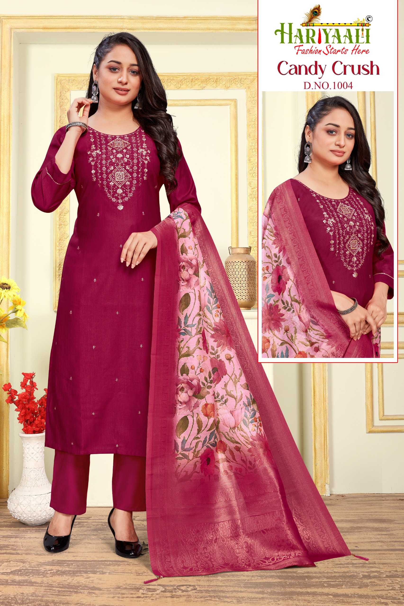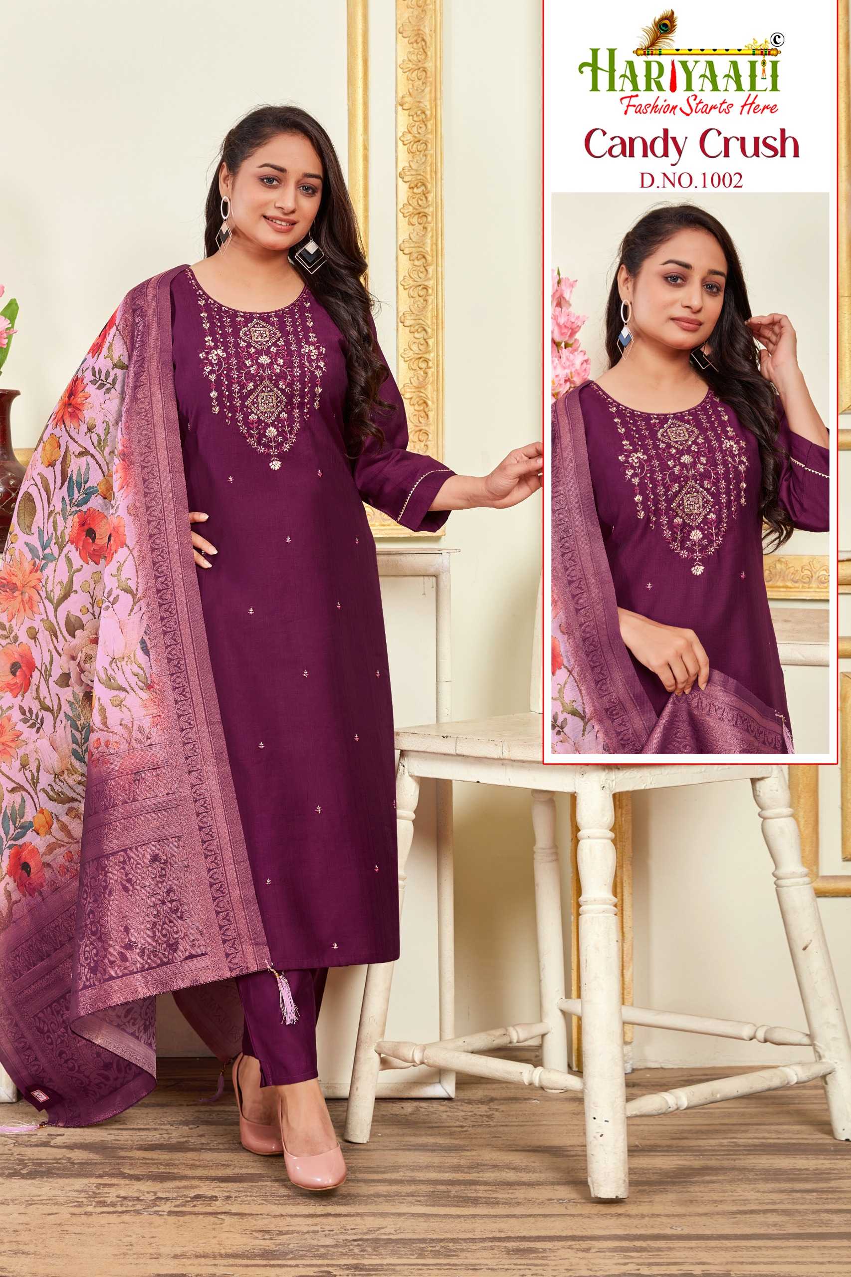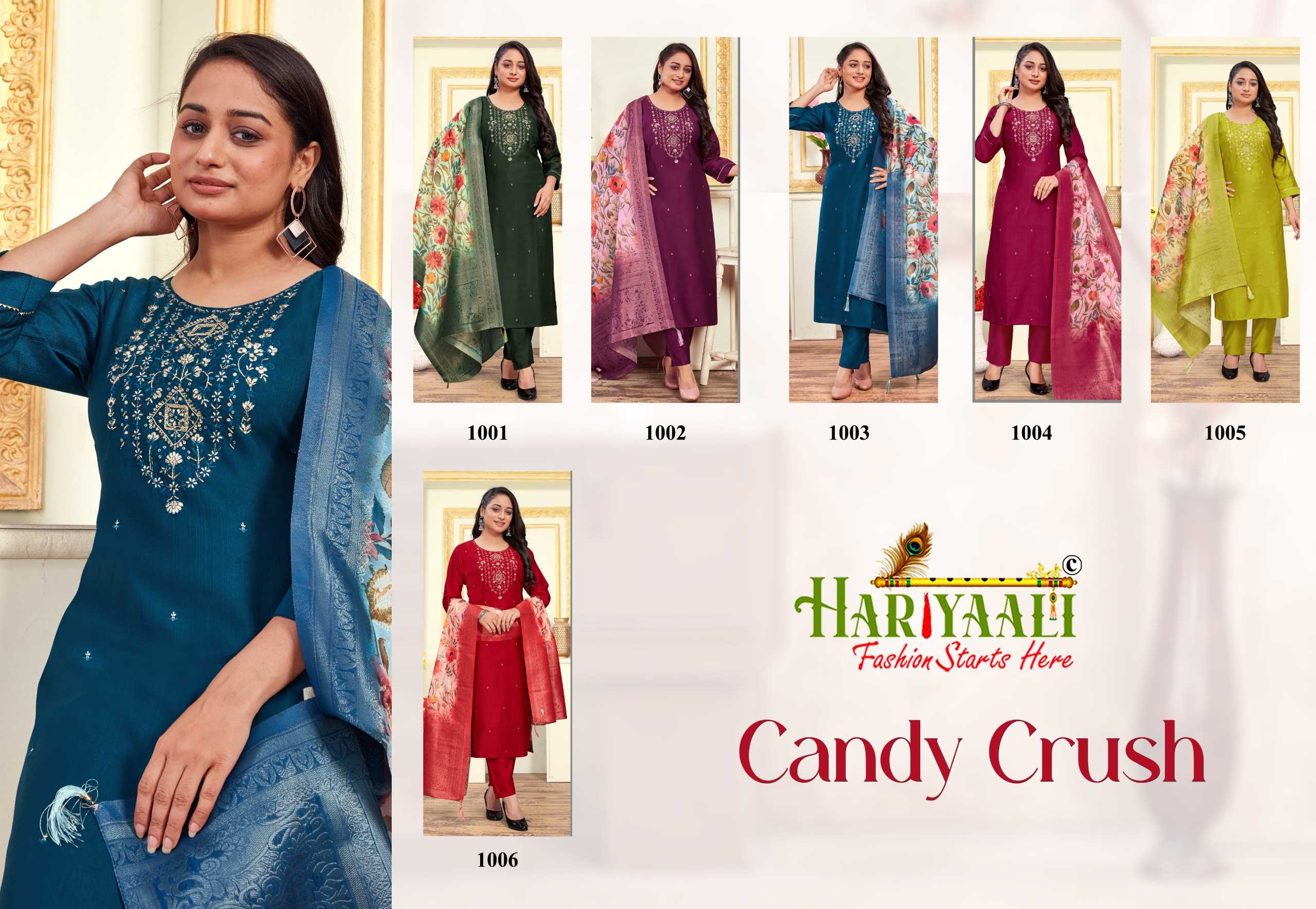 Looking for candy crush vol 1 by hariyaali vetican silk amazing work fully stitch combo set 3pcs dress Full Catalouge at Best Price? Buy Now candy crush vol 1 by hariyaali vetican silk amazing work fully stitch combo set 3pcs dress at Wholesale Rate of Rs 29040 with Total 24 Pcs from authroized dealer and supplier of Hariyaali Brand. Cost of Each piece is just only Rs 1210 which is very low and affordable price to resale the product in your retail store. rrgandhi is Surat based Wholesale Supplier & Dealer of Hariyaali Brand. Click on Brand name to Know more about Brand's products.