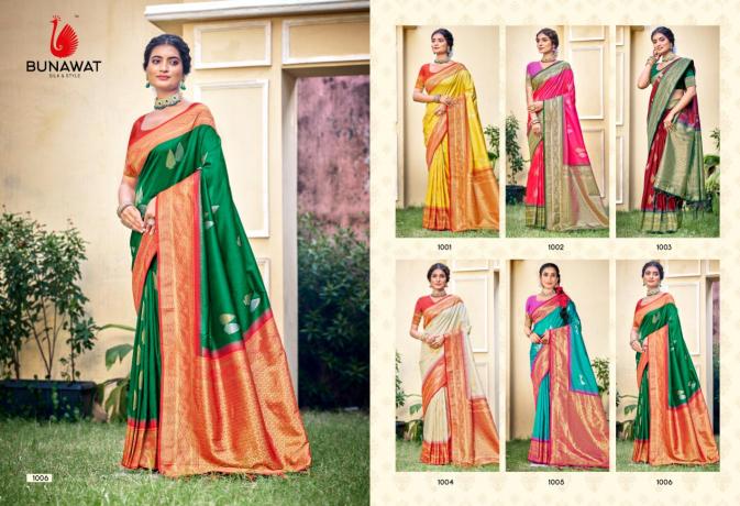 Looking for CHITRAGANDHA SILK BY BUNAWAT WEDDING FESTIVAL WEAR SILK FABRIC SAREE COLLECTION Full Catalouge at Best Price? Buy Now CHITRAGANDHA SILK BY BUNAWAT WEDDING FESTIVAL WEAR SILK FABRIC SAREE COLLECTION at Wholesale Rate of Rs 8388 with Total 6 Pcs from authroized dealer and supplier of Bunawat Brand. Cost of Each piece is just only Rs 1398 which is very low and affordable price to resale the product in your retail store. rrgandhi is Surat based Wholesale Supplier & Dealer of Bunawat Brand. Click on Brand name to Know more about Brand's products.