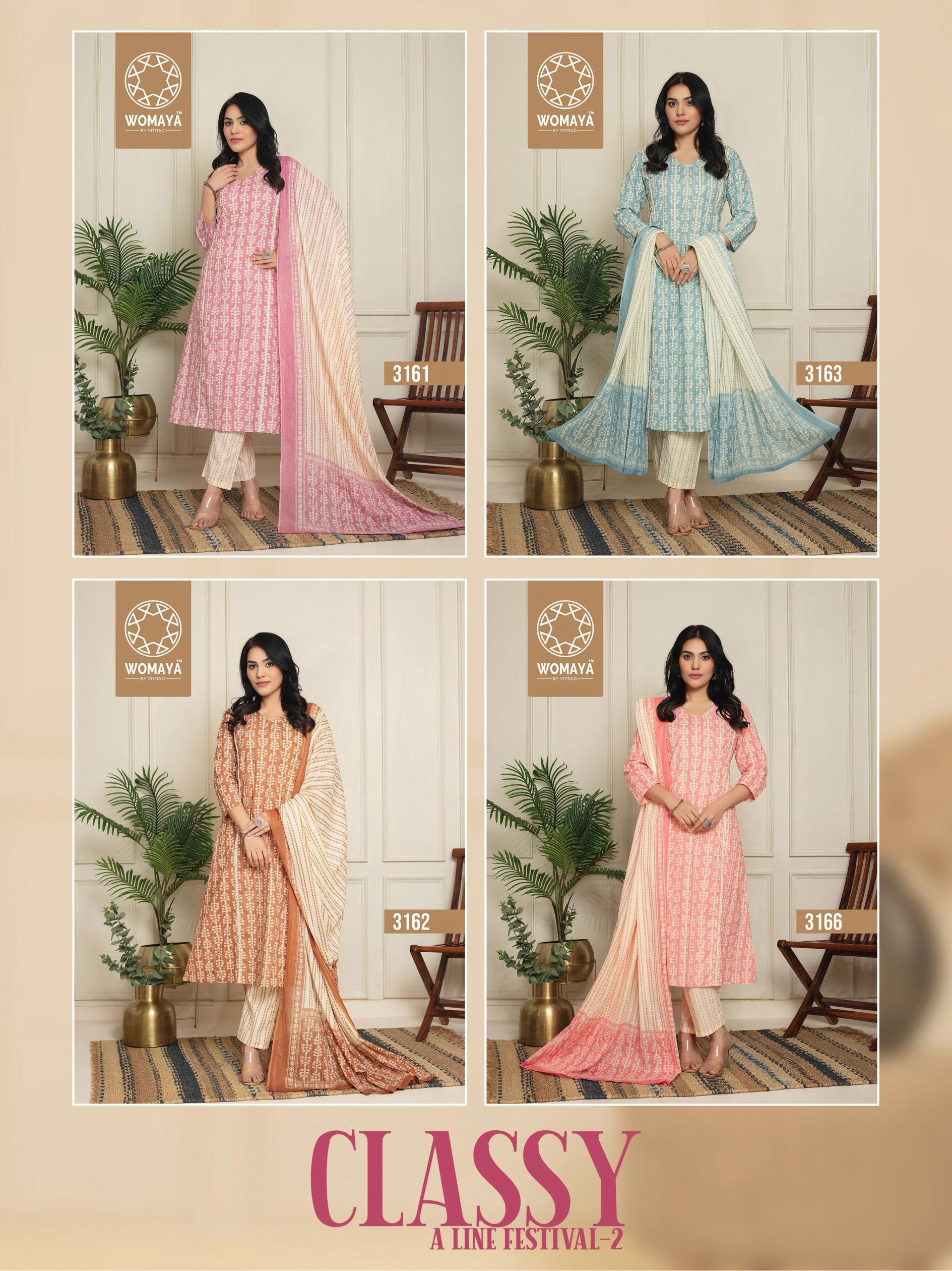 Looking for CLASSY A LINE FESTIVAL VOL 2 BY WOMAYAS COTTON READYMADE COMBO SUITS Full Catalouge at Best Price? Buy Now CLASSY A LINE FESTIVAL VOL 2 BY WOMAYAS COTTON READYMADE COMBO SUITS at Wholesale Rate of Rs 19900 with Total 20 Pcs from authroized dealer and supplier of Womaya Kurtis Brand. Cost of Each piece is just only Rs 995 which is very low and affordable price to resale the product in your retail store. rrgandhi is Surat based Wholesale Supplier & Dealer of Womaya Kurtis Brand. Click on Brand name to Know more about Brand's products.