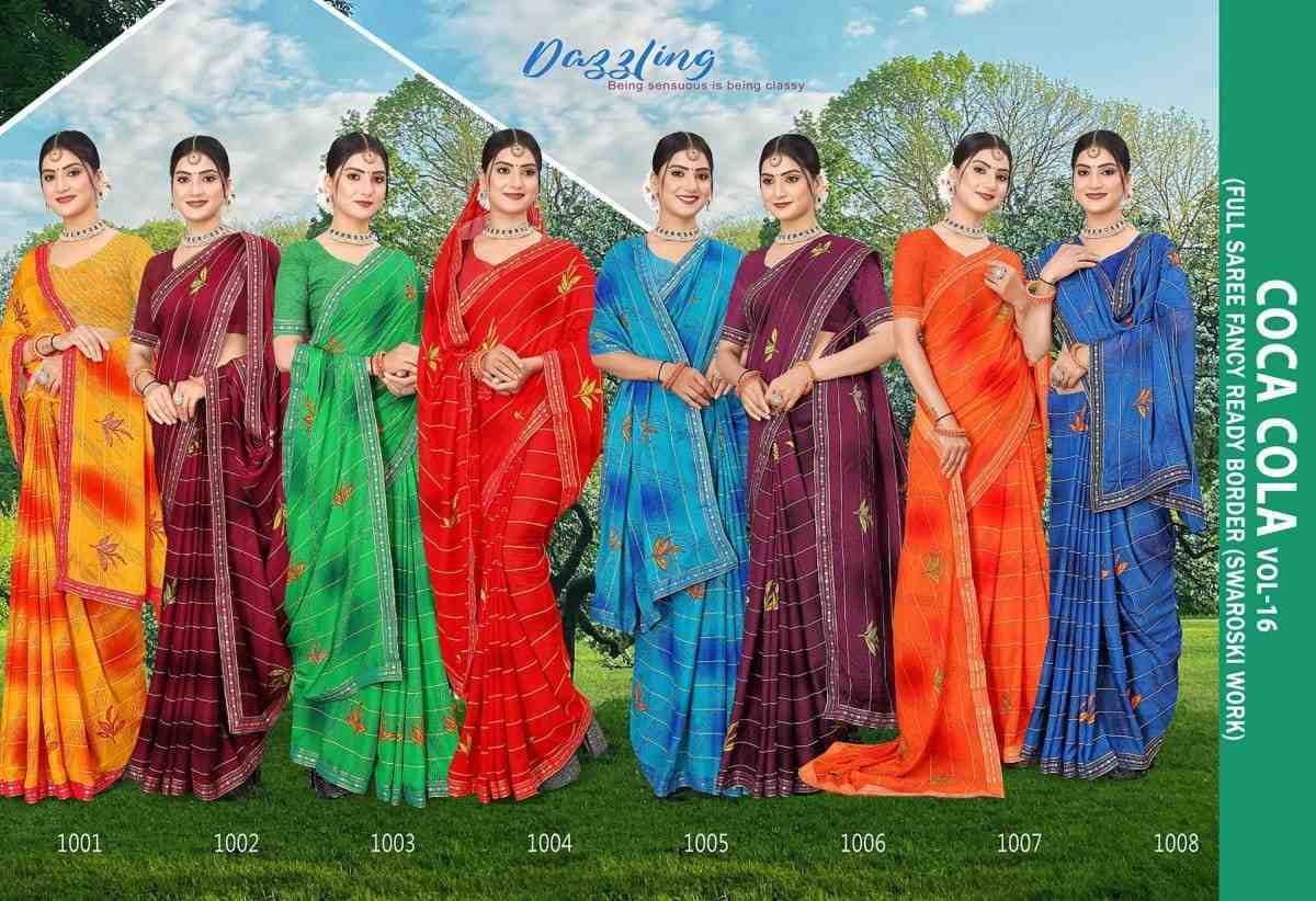 Looking for coca cola vol 16 by madhupriya swaroski work reniyal regular wear saree Full Catalouge at Best Price? Buy Now coca cola vol 16 by madhupriya swaroski work reniyal regular wear saree at Wholesale Rate of Rs 2000 with Total 8 Pcs from authroized dealer and supplier of Vallabhi Prints Brand. Cost of Each piece is just only Rs 250 which is very low and affordable price to resale the product in your retail store. rrgandhi is Surat based Wholesale Supplier & Dealer of Vallabhi Prints Brand. Click on Brand name to Know more about Brand's products.
