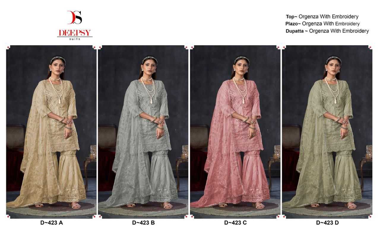 Looking for deepsy suits 423 launch hit design organza full stitch pakistani top gharara dupatta Full Catalouge at Best Price? Buy Now deepsy suits 423 launch hit design organza full stitch pakistani top gharara dupatta at Wholesale Rate of Rs 13592 with Total 8 Pcs from authroized dealer and supplier of Deepsy Suits Brand. Cost of Each piece is just only Rs 1699 which is very low and affordable price to resale the product in your retail store. rrgandhi is Surat based Wholesale Supplier & Dealer of Deepsy Suits Brand. Click on Brand name to Know more about Brand's products.