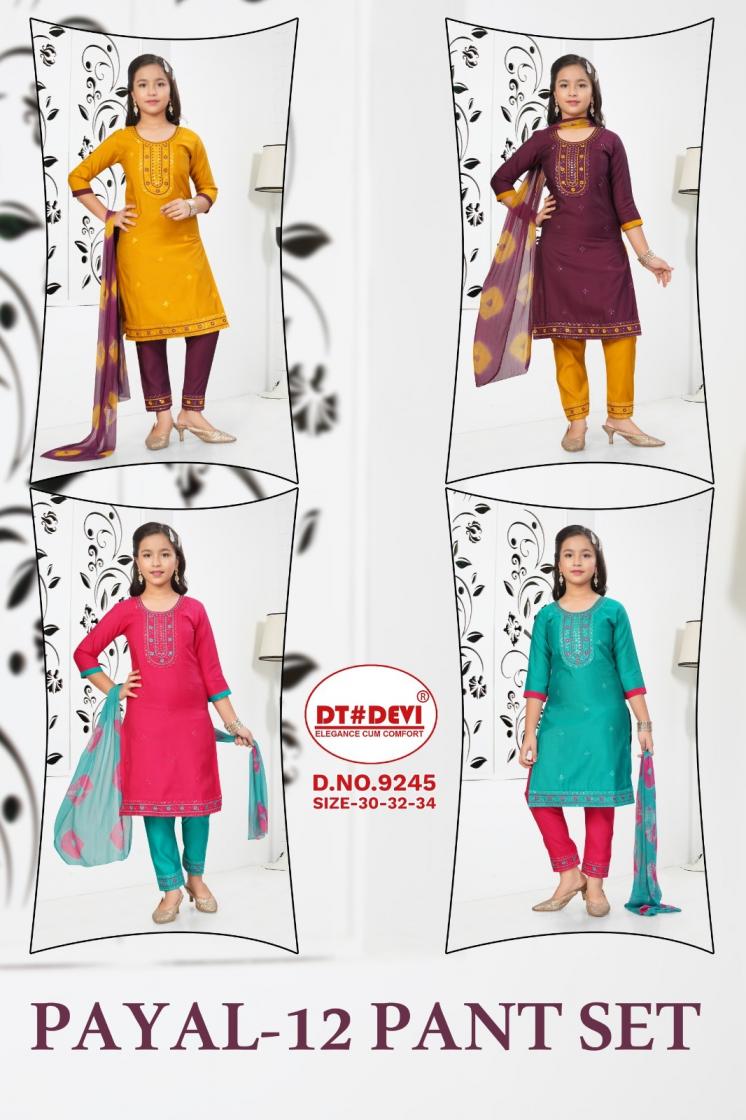 Looking for DT DEVI PAYAL VOL 12 ROMAN SILK 9245 READYMADE FANCY COMBO 3PCS KIDS DRESS Full Catalouge at Best Price? Buy Now DT DEVI PAYAL VOL 12 ROMAN SILK 9245 READYMADE FANCY COMBO 3PCS KIDS DRESS at Wholesale Rate of Rs 6780 with Total 12 Pcs from authroized dealer and supplier of Dt Devi Brand. Cost of Each piece is just only Rs 565 which is very low and affordable price to resale the product in your retail store. rrgandhi is Surat based Wholesale Supplier & Dealer of Dt Devi Brand. Click on Brand name to Know more about Brand's products.