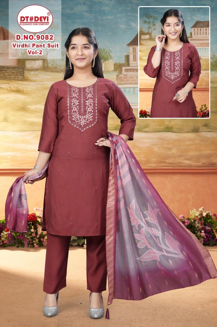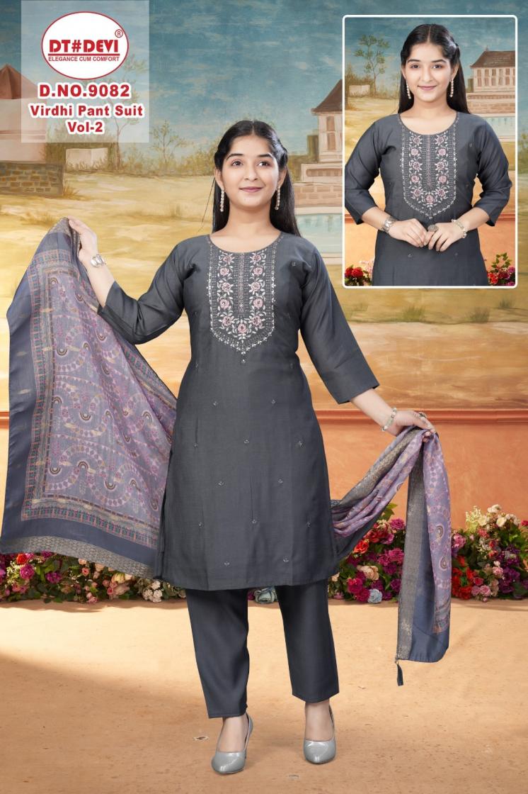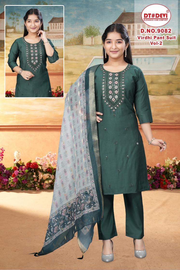Looking for DT DEVI VIRDHI PANT SUIT VOL 2 9082 FANCY ROMAN SILK FULL STITCH KIDS DRESS Full Catalouge at Best Price? Buy Now DT DEVI VIRDHI PANT SUIT VOL 2 9082 FANCY ROMAN SILK FULL STITCH KIDS DRESS at Wholesale Rate of Rs 7980 with Total 12 Pcs from authroized dealer and supplier of Dt Devi Brand. Cost of Each piece is just only Rs 665 which is very low and affordable price to resale the product in your retail store. rrgandhi is Surat based Wholesale Supplier & Dealer of Dt Devi Brand. Click on Brand name to Know more about Brand's products.