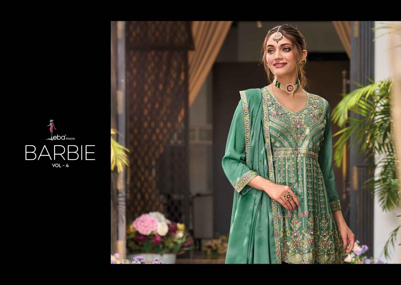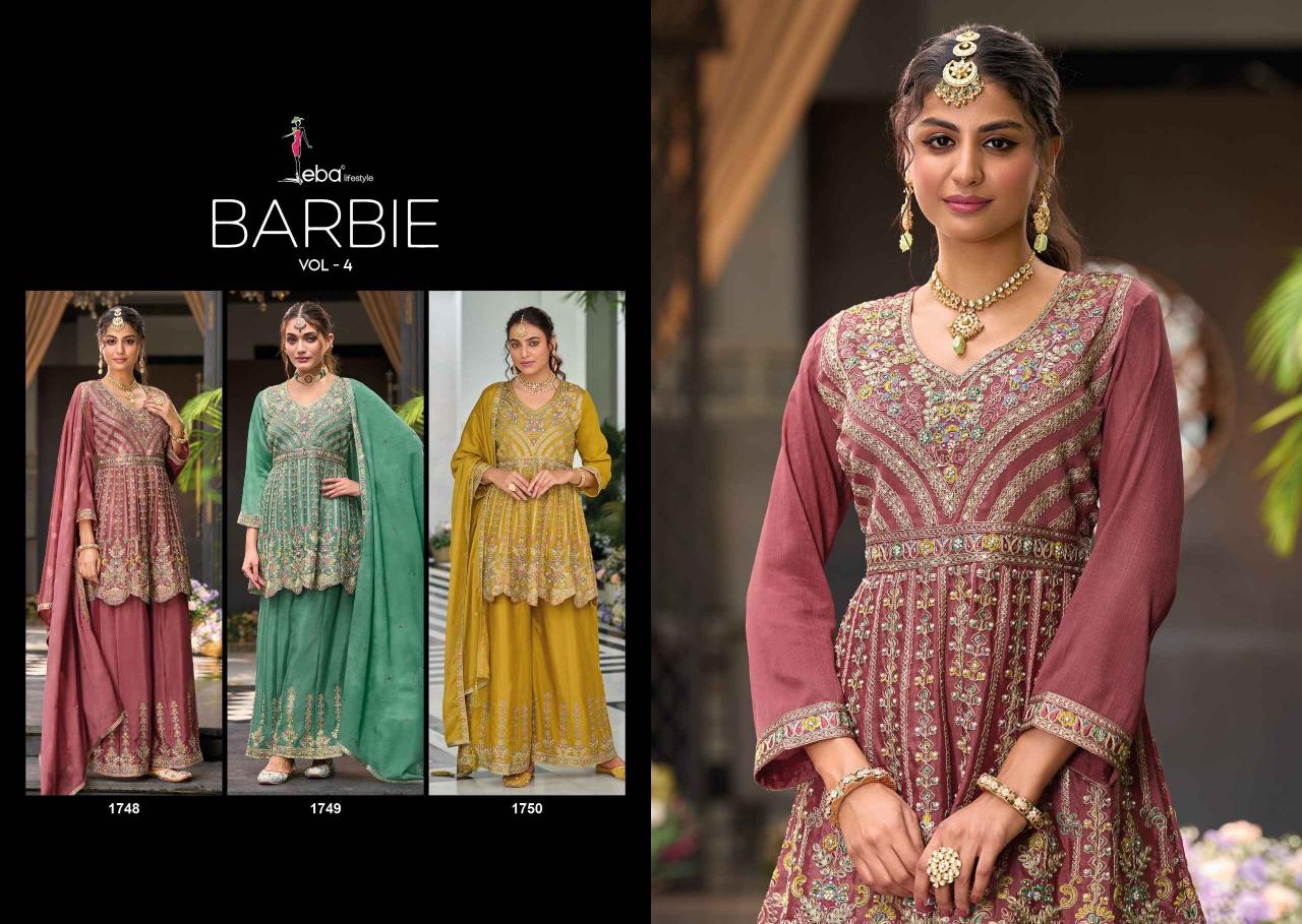 Looking for eba lifestyle barbie vol 4 embroidery work fullstitch chinon suits Full Catalouge at Best Price? Buy Now eba lifestyle barbie vol 4 embroidery work fullstitch chinon suits at Wholesale Rate of Rs 7197 with Total 3 Pcs from authroized dealer and supplier of Eba Lifestyle Brand. Cost of Each piece is just only Rs 2399 which is very low and affordable price to resale the product in your retail store. rrgandhi is Surat based Wholesale Supplier & Dealer of Eba Lifestyle Brand. Click on Brand name to Know more about Brand's products.