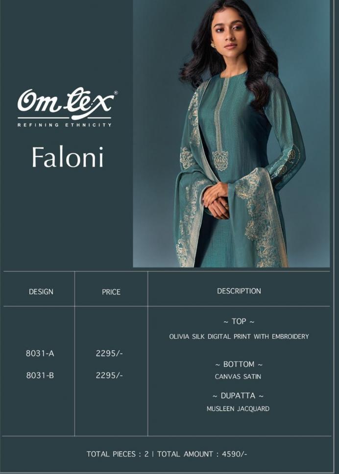 Looking for FALONI BY OMTEX OLIVIA SILK DIGITAL PRINT FANCY DRESS MATERIALS Full Catalouge at Best Price? Buy Now FALONI BY OMTEX OLIVIA SILK DIGITAL PRINT FANCY DRESS MATERIALS at Wholesale Rate of Rs 4590 with Total 2 Pcs from authroized dealer and supplier of Om Tex Brand. Cost of Each piece is just only Rs 2295 which is very low and affordable price to resale the product in your retail store. rrgandhi is Surat based Wholesale Supplier & Dealer of Om Tex Brand. Click on Brand name to Know more about Brand's products.