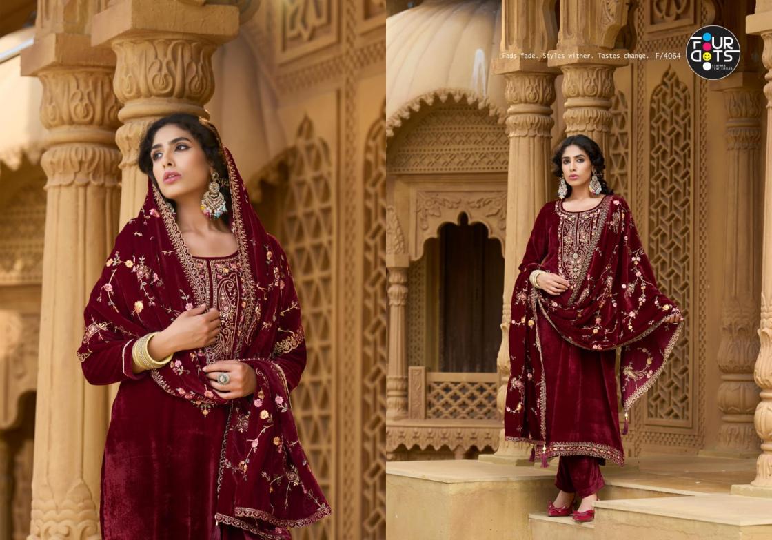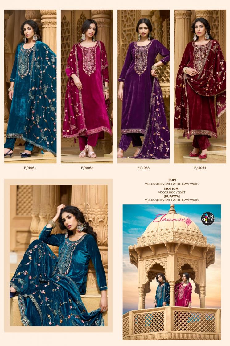 Looking for FOURDOTS ELEANOR VISCOSE VELVET AMAZING DRESS MATERILAS ONLINE Full Catalouge at Best Price? Buy Now FOURDOTS ELEANOR VISCOSE VELVET AMAZING DRESS MATERILAS ONLINE at Wholesale Rate of Rs 6396 with Total 4 Pcs from authroized dealer and supplier of Fourdots Brand. Cost of Each piece is just only Rs 1599 which is very low and affordable price to resale the product in your retail store. rrgandhi is Surat based Wholesale Supplier & Dealer of Fourdots Brand. Click on Brand name to Know more about Brand's products.