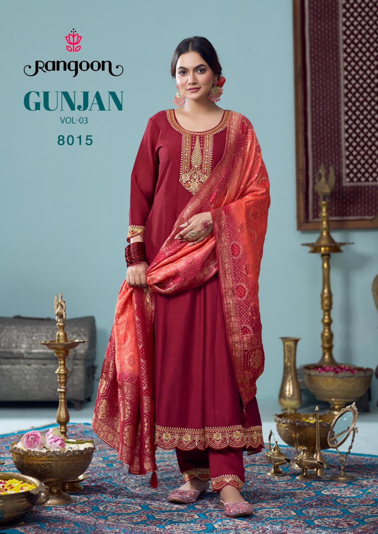 Looking for GUNJAN VOL 3 BY RANGOON FULL STITCH ANARKALI STYLE SILK SUITS ONLINE Full Catalouge at Best Price? Buy Now GUNJAN VOL 3 BY RANGOON FULL STITCH ANARKALI STYLE SILK SUITS ONLINE at Wholesale Rate of Rs 8394 with Total 6 Pcs from authroized dealer and supplier of Rangoon Brand. Cost of Each piece is just only Rs 1399 which is very low and affordable price to resale the product in your retail store. rrgandhi is Surat based Wholesale Supplier & Dealer of Rangoon Brand. Click on Brand name to Know more about Brand's products.