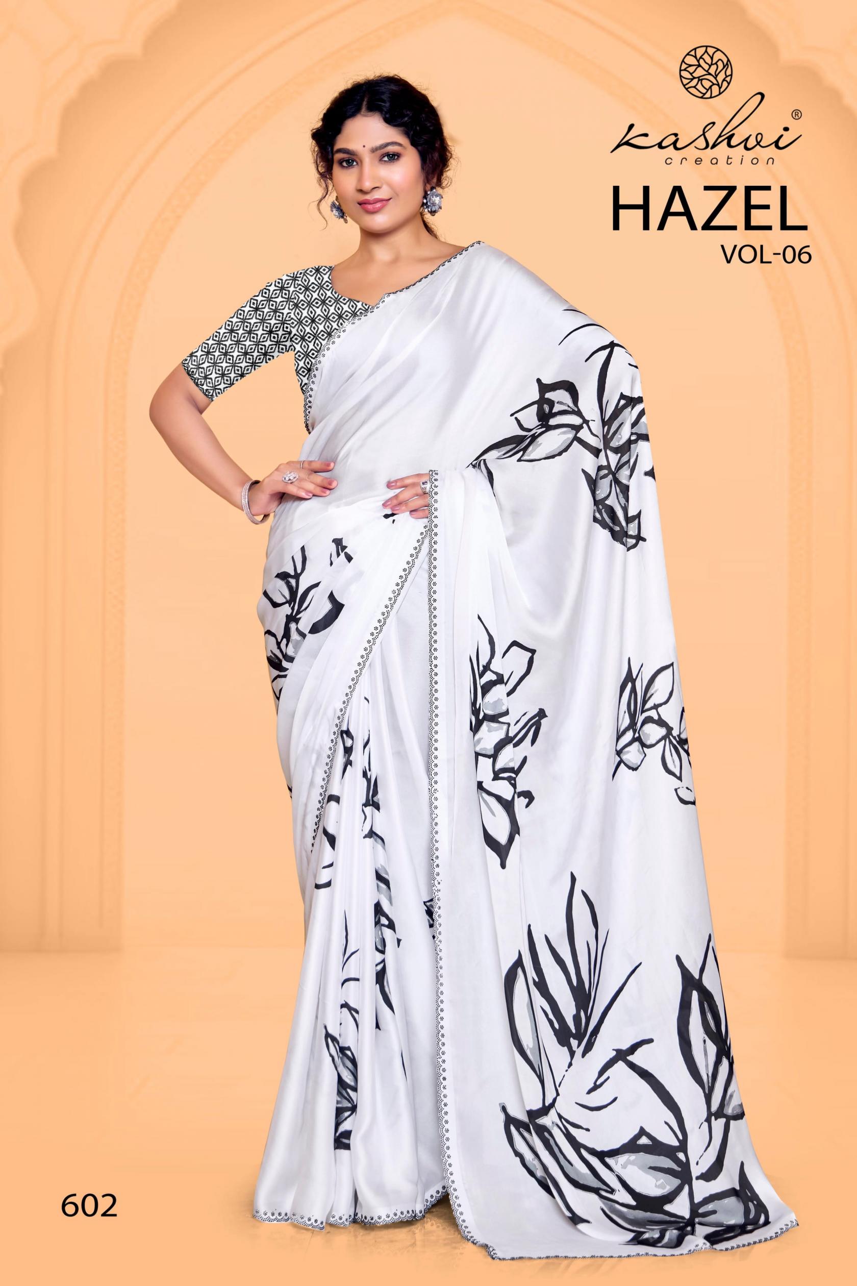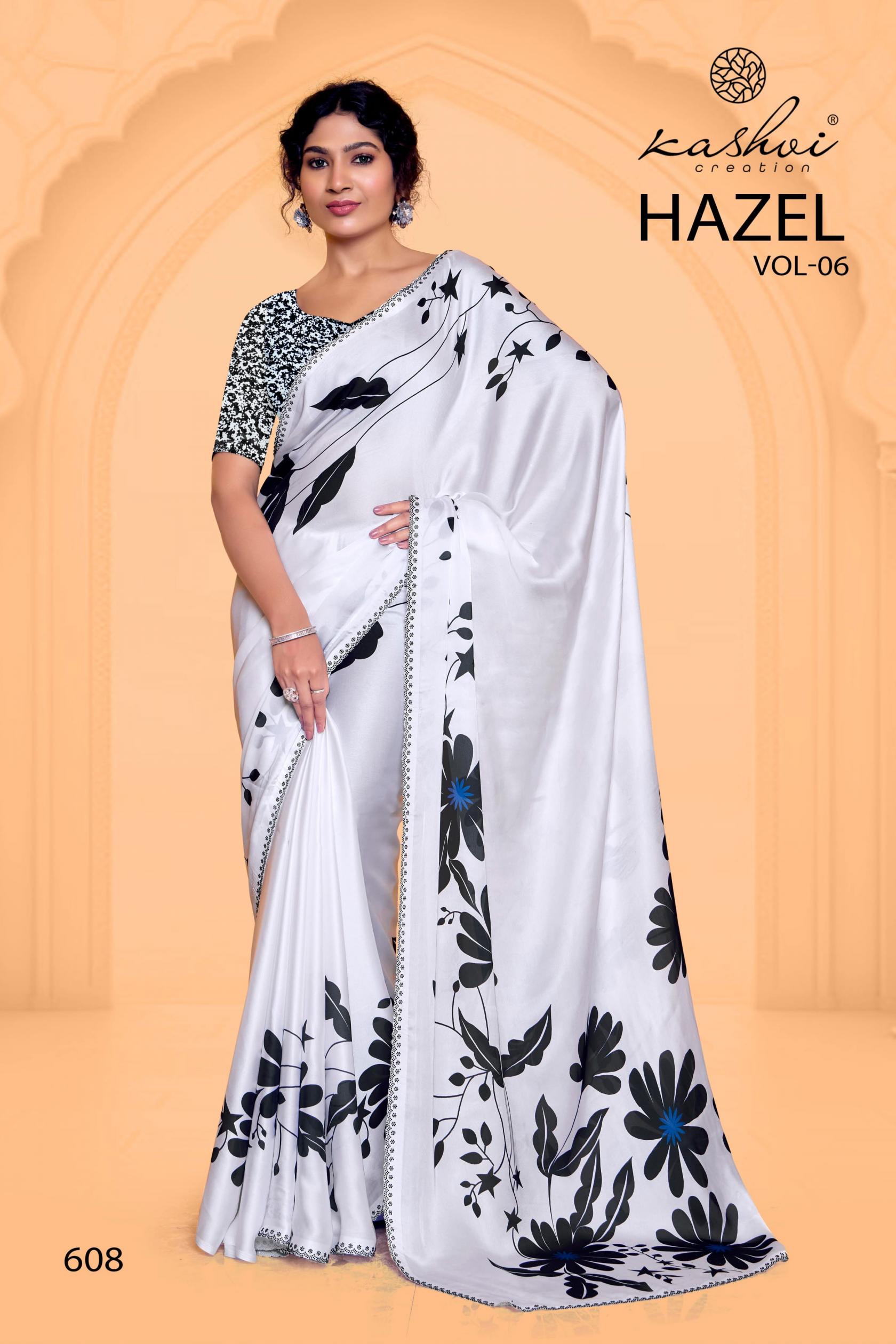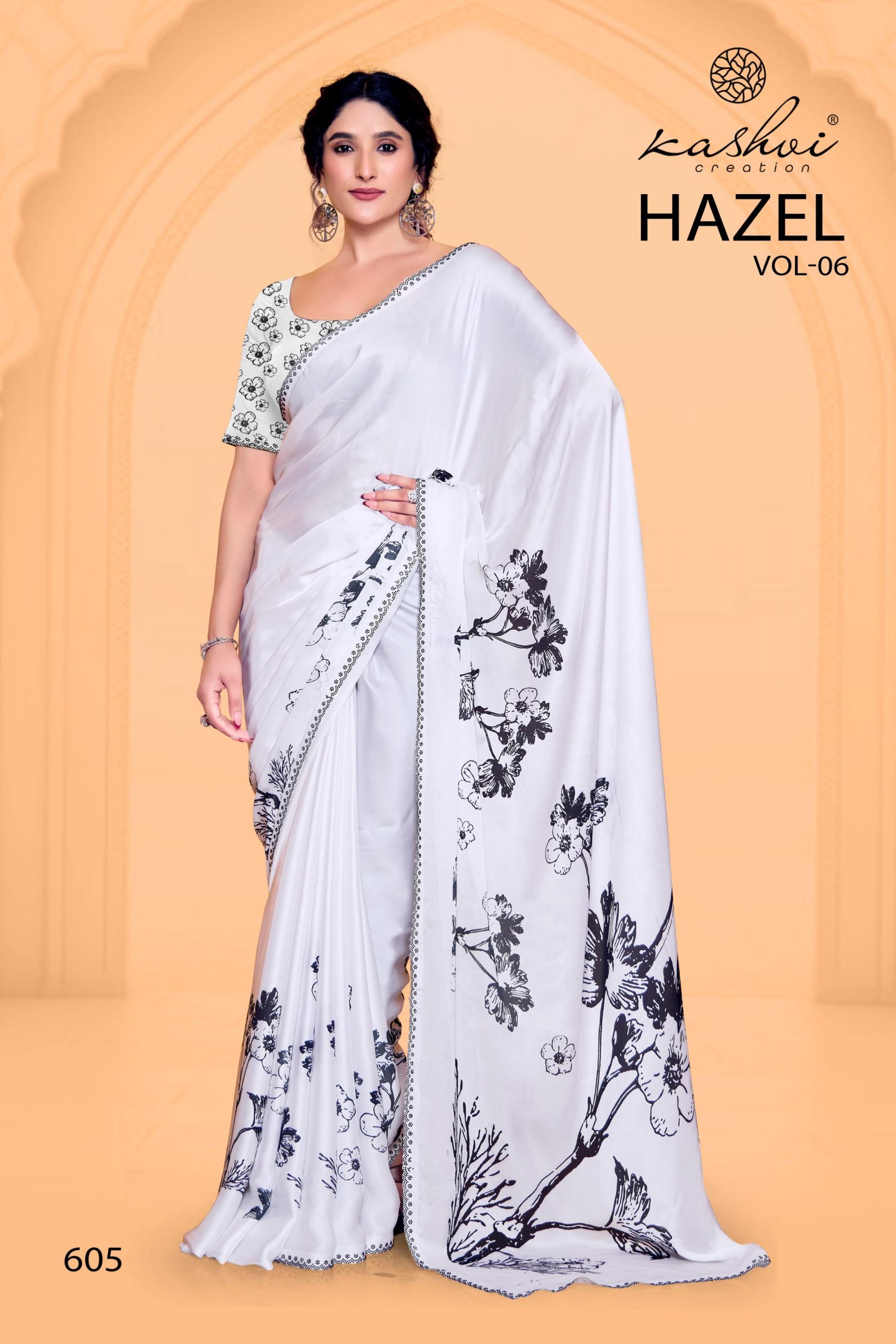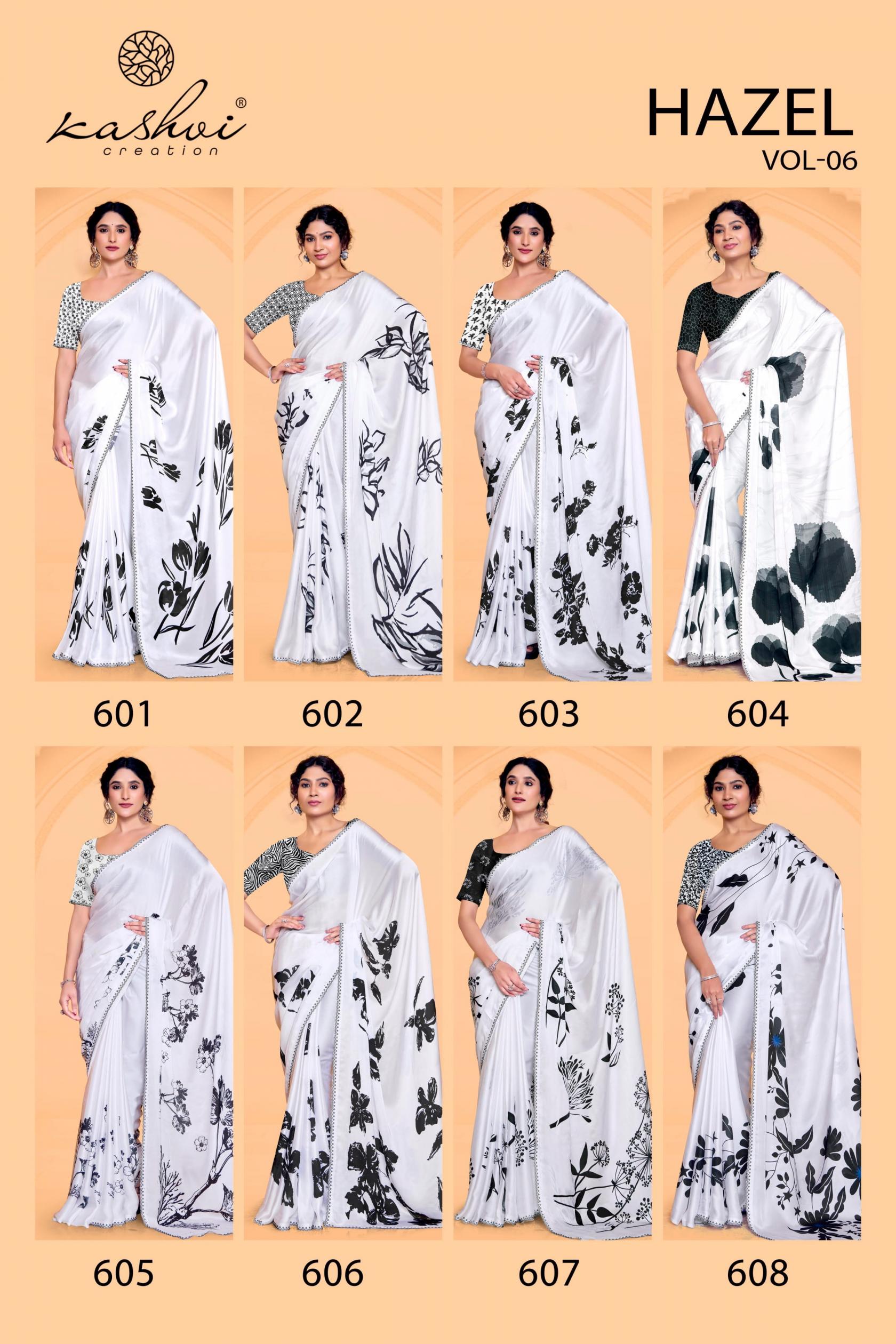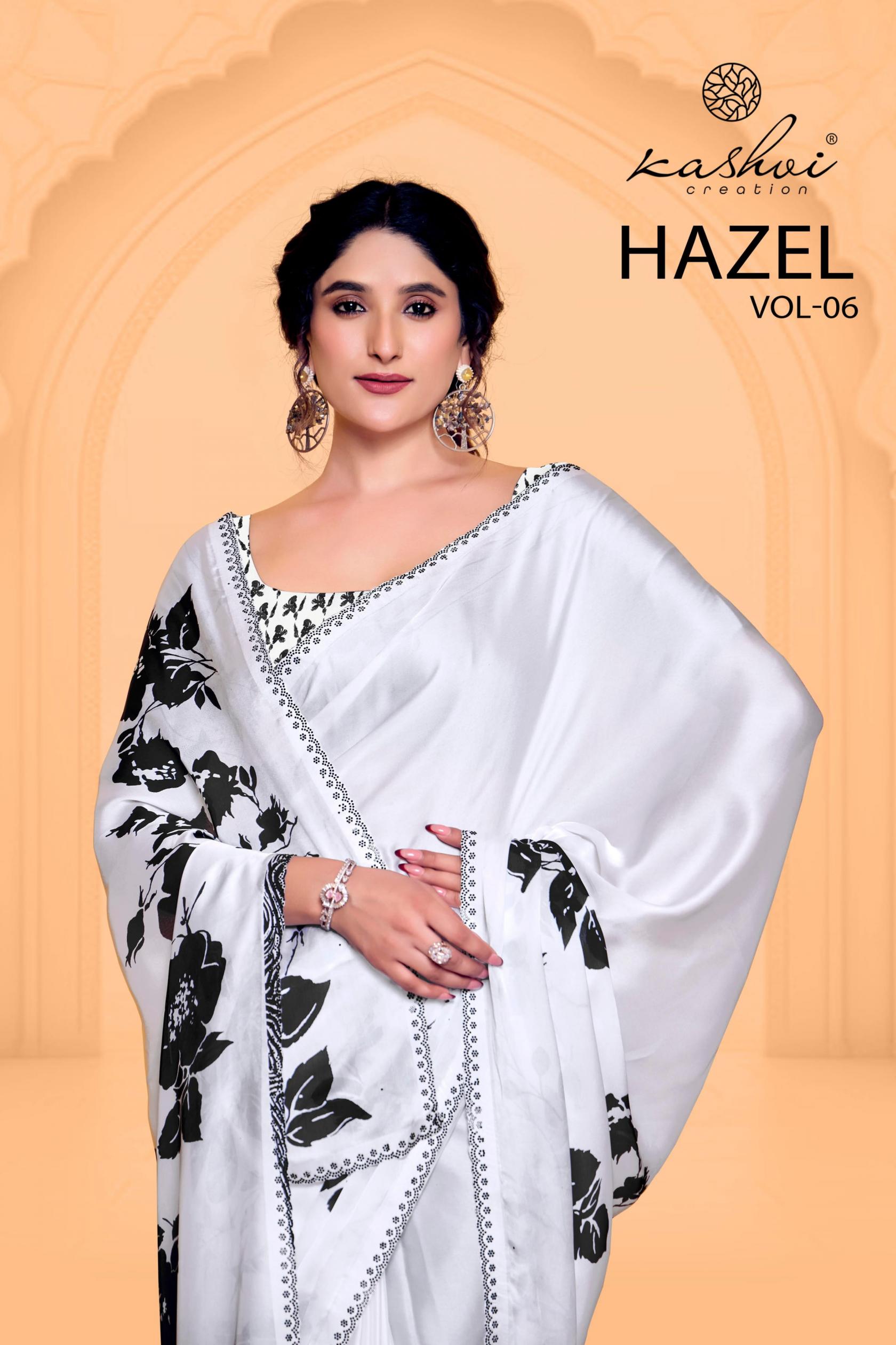 Looking for HAZEL VOL 6 BY KASHVI CREATION SATIN GEORGETTE PRETTY SAREE ONLINE Full Catalouge at Best Price? Buy Now HAZEL VOL 6 BY KASHVI CREATION SATIN GEORGETTE PRETTY SAREE ONLINE at Wholesale Rate of Rs 7960 with Total 8 Pcs from authroized dealer and supplier of Kashvi Creation Brand. Cost of Each piece is just only Rs 995 which is very low and affordable price to resale the product in your retail store. rrgandhi is Surat based Wholesale Supplier & Dealer of Kashvi Creation Brand. Click on Brand name to Know more about Brand's products.