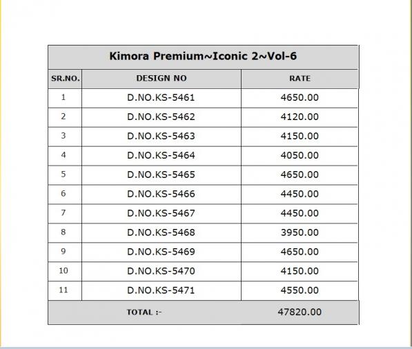 Looking for ICONIC 2 VOL 6 BY KIMORA SEQUENCE KHATLI WORK SAREE EXPORTS Full Catalouge at Best Price? Buy Now ICONIC 2 VOL 6 BY KIMORA SEQUENCE KHATLI WORK SAREE EXPORTS at Wholesale Rate of Rs 47850 with Total 11 Pcs from authroized dealer and supplier of KIMORA Brand. Cost of Each piece is just only Rs 4350 which is very low and affordable price to resale the product in your retail store. rrgandhi is Surat based Wholesale Supplier & Dealer of KIMORA Brand. Click on Brand name to Know more about Brand's products.