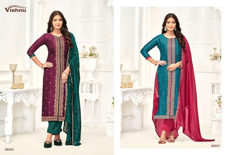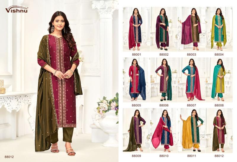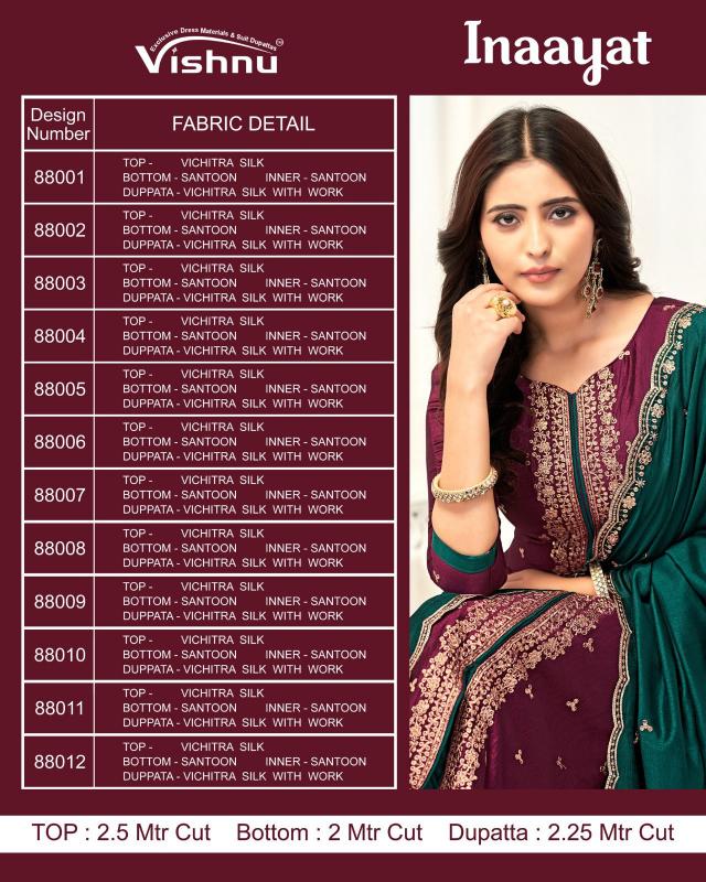 Looking for inaayat vol 1 by vishnu hit design vichitra silk unstitch salwar suit set Full Catalouge at Best Price? Buy Now inaayat vol 1 by vishnu hit design vichitra silk unstitch salwar suit set at Wholesale Rate of Rs 9000 with Total 12 Pcs from authroized dealer and supplier of Vishnu Brand. Cost of Each piece is just only Rs 750 which is very low and affordable price to resale the product in your retail store. rrgandhi is Surat based Wholesale Supplier & Dealer of Vishnu Brand. Click on Brand name to Know more about Brand's products.