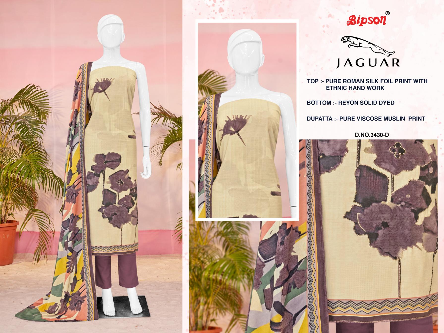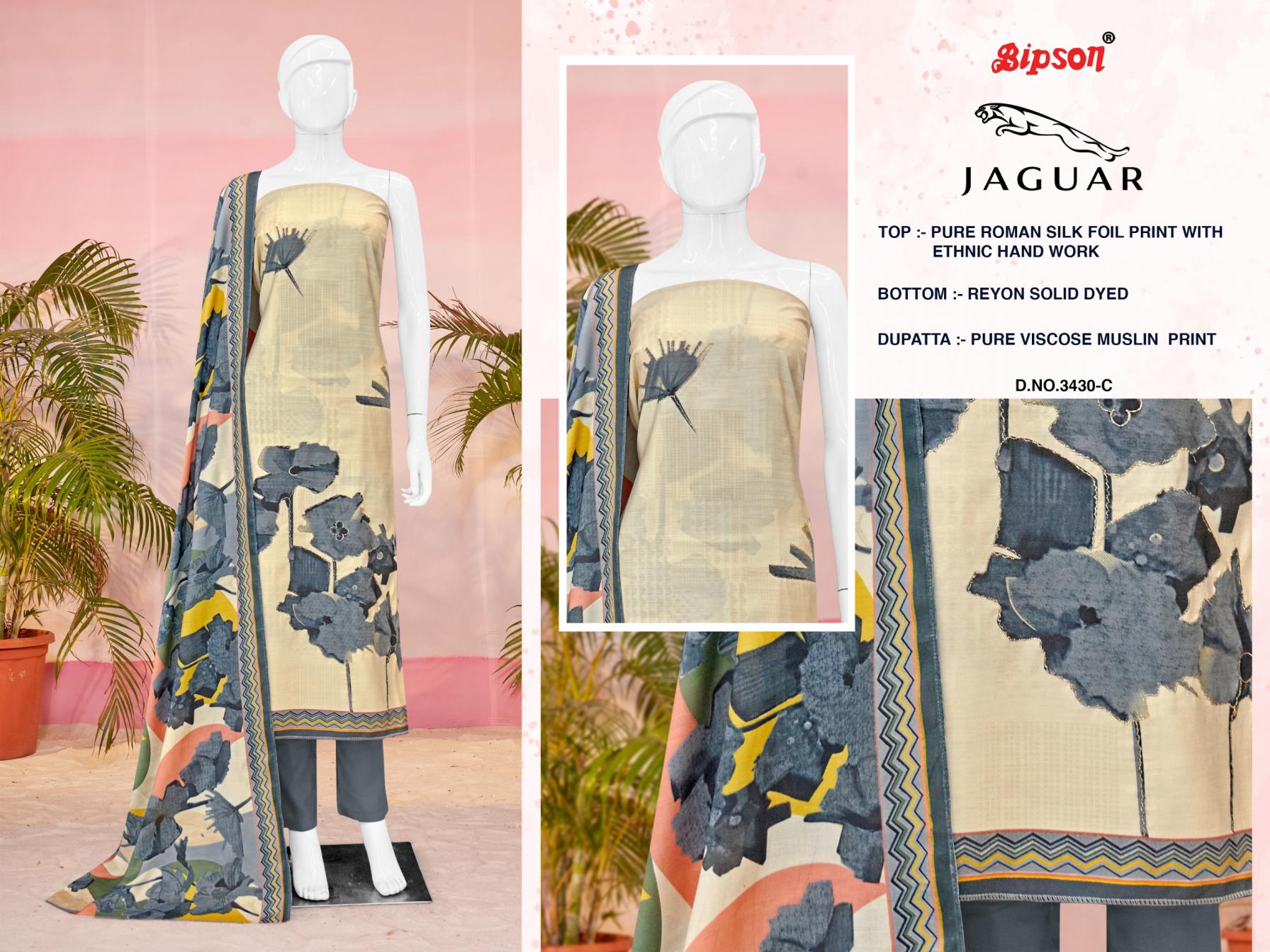 Looking for JAGUAR 3430 BY BIPSON PRINTS ROMAN SILK UNSTITCH SUIT FOR WOMENS Full Catalouge at Best Price? Buy Now JAGUAR 3430 BY BIPSON PRINTS ROMAN SILK UNSTITCH SUIT FOR WOMENS at Wholesale Rate of Rs 3244 with Total 4 Pcs from authroized dealer and supplier of Bipson Fashion Brand. Cost of Each piece is just only Rs 811 which is very low and affordable price to resale the product in your retail store. rrgandhi is Surat based Wholesale Supplier & Dealer of Bipson Fashion Brand. Click on Brand name to Know more about Brand's products.