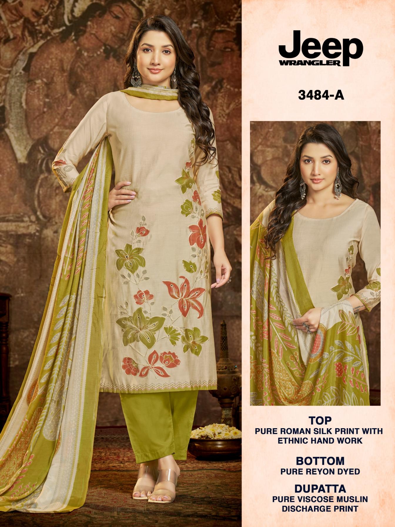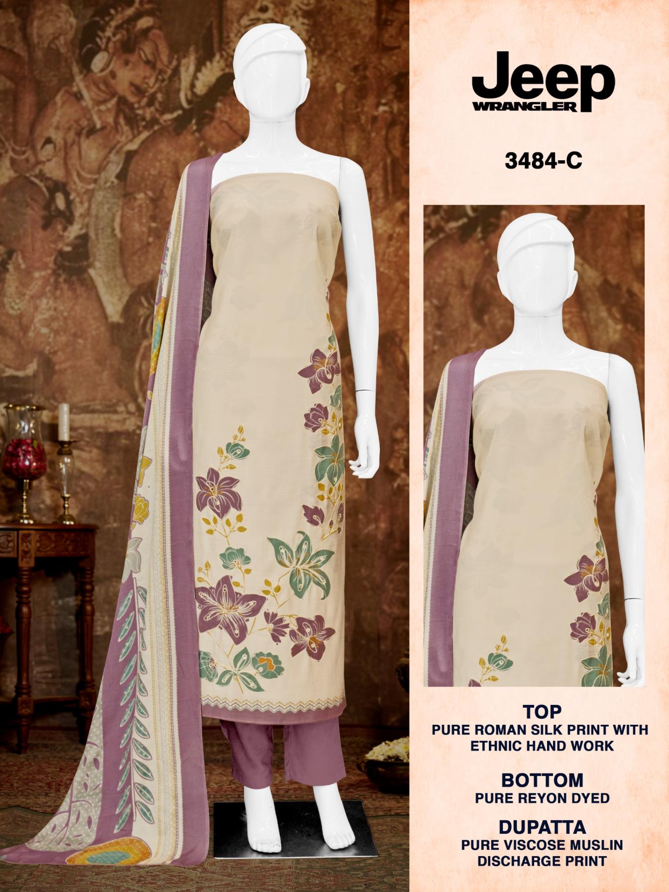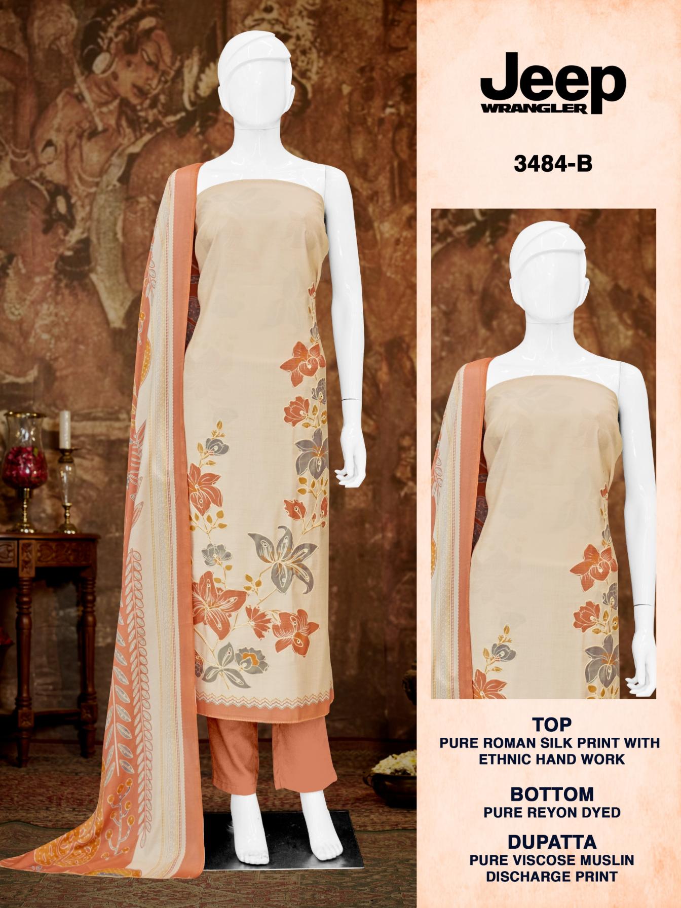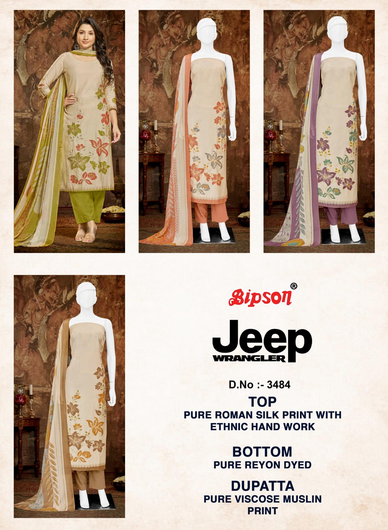 Looking for JEEP WRANGLAR 3484 BY BIPSON PRINTS ROMAN SILK UNSTITCH SUITS Full Catalouge at Best Price? Buy Now JEEP WRANGLAR 3484 BY BIPSON PRINTS ROMAN SILK UNSTITCH SUITS at Wholesale Rate of Rs 2980 with Total 4 Pcs from authroized dealer and supplier of Bipson Fashion Brand. Cost of Each piece is just only Rs 745 which is very low and affordable price to resale the product in your retail store. rrgandhi is Surat based Wholesale Supplier & Dealer of Bipson Fashion Brand. Click on Brand name to Know more about Brand's products.