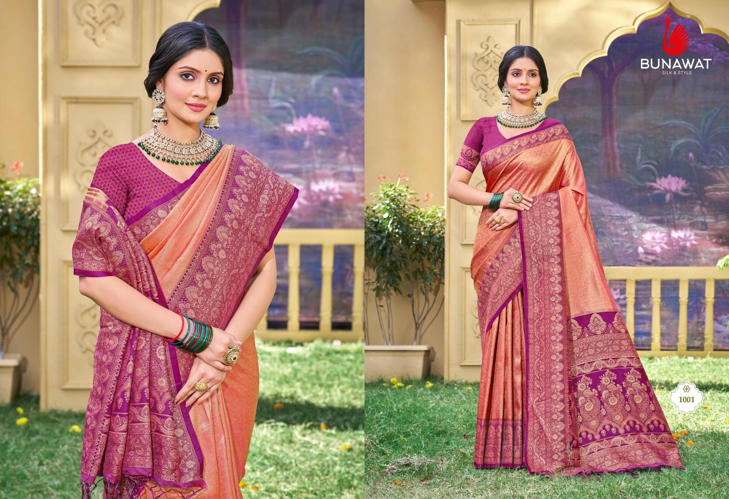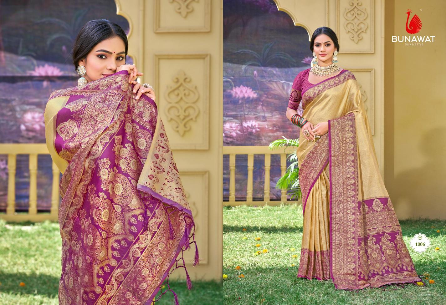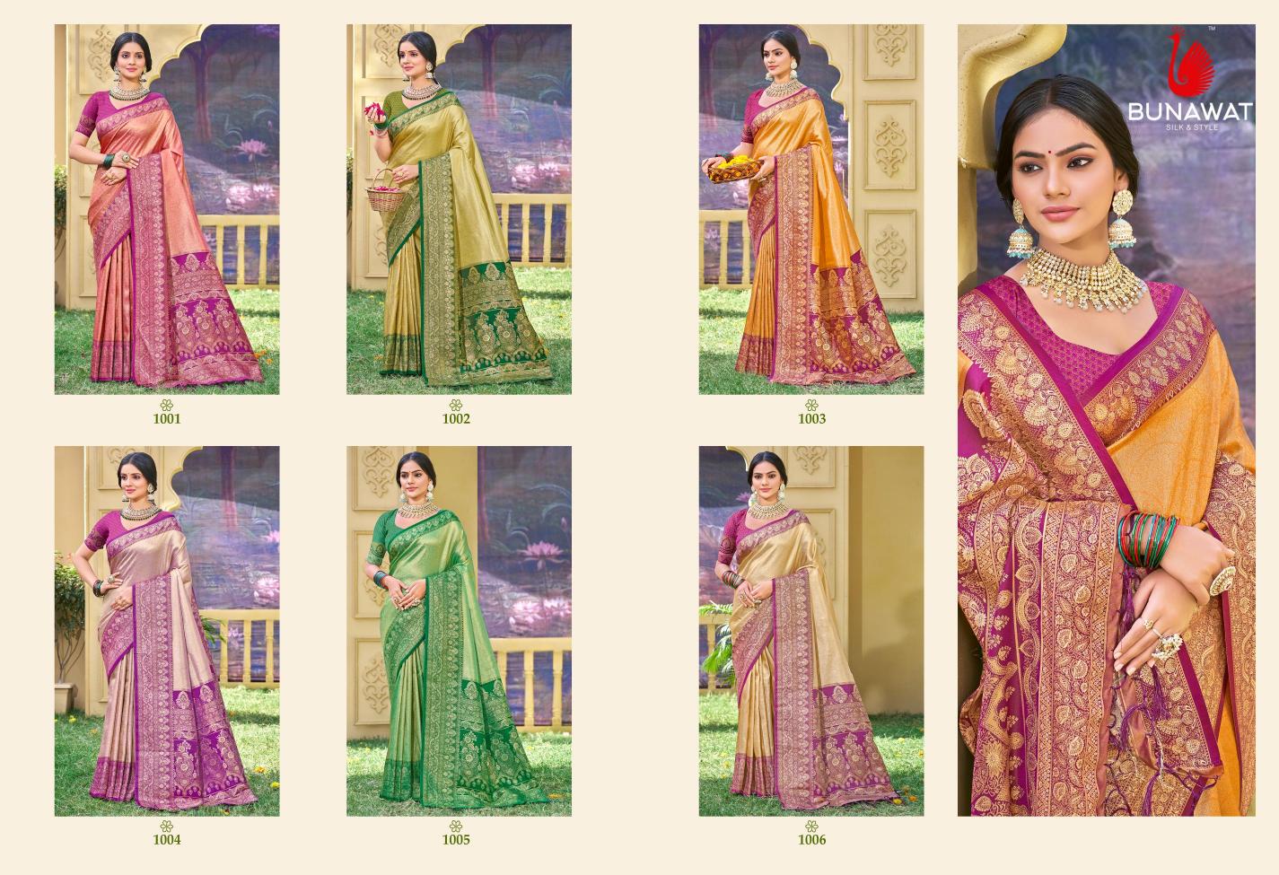 Looking for Jhumer Silk By Bunawat Banarasi Silk Sarees Latest Collection For Wedding Full Catalouge at Best Price? Buy Now Jhumer Silk By Bunawat Banarasi Silk Sarees Latest Collection For Wedding at Wholesale Rate of Rs 8400 with Total 6 Pcs from authroized dealer and supplier of Bunawat Brand. Cost of Each piece is just only Rs 1400 which is very low and affordable price to resale the product in your retail store. rrgandhi is Surat based Wholesale Supplier & Dealer of Bunawat Brand. Click on Brand name to Know more about Brand's products.