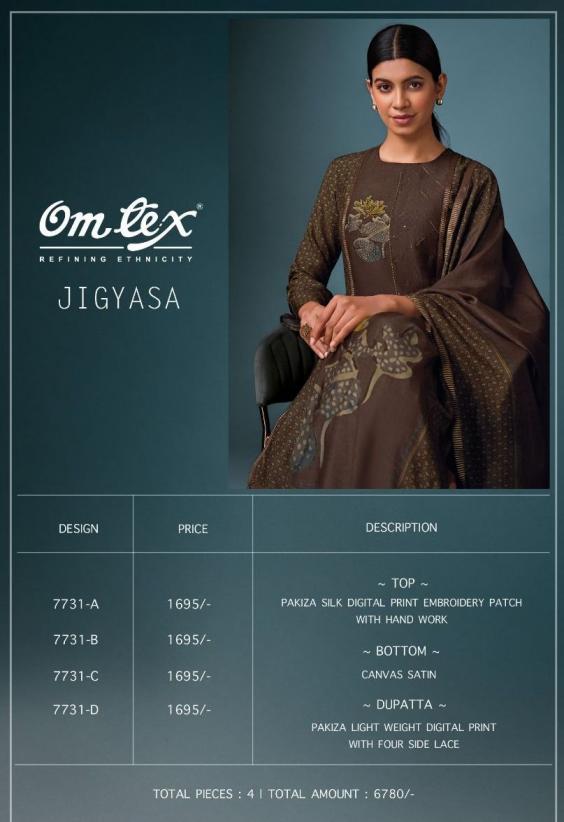 Looking for JIGYASA BY OMTEX PAKIZA SILK STYLISH SALWAR KAMEEZ Full Catalouge at Best Price? Buy Now JIGYASA BY OMTEX PAKIZA SILK STYLISH SALWAR KAMEEZ at Wholesale Rate of Rs 6780 with Total 4 Pcs from authroized dealer and supplier of Om Tex Brand. Cost of Each piece is just only Rs 1695 which is very low and affordable price to resale the product in your retail store. rrgandhi is Surat based Wholesale Supplier & Dealer of Om Tex Brand. Click on Brand name to Know more about Brand's products.