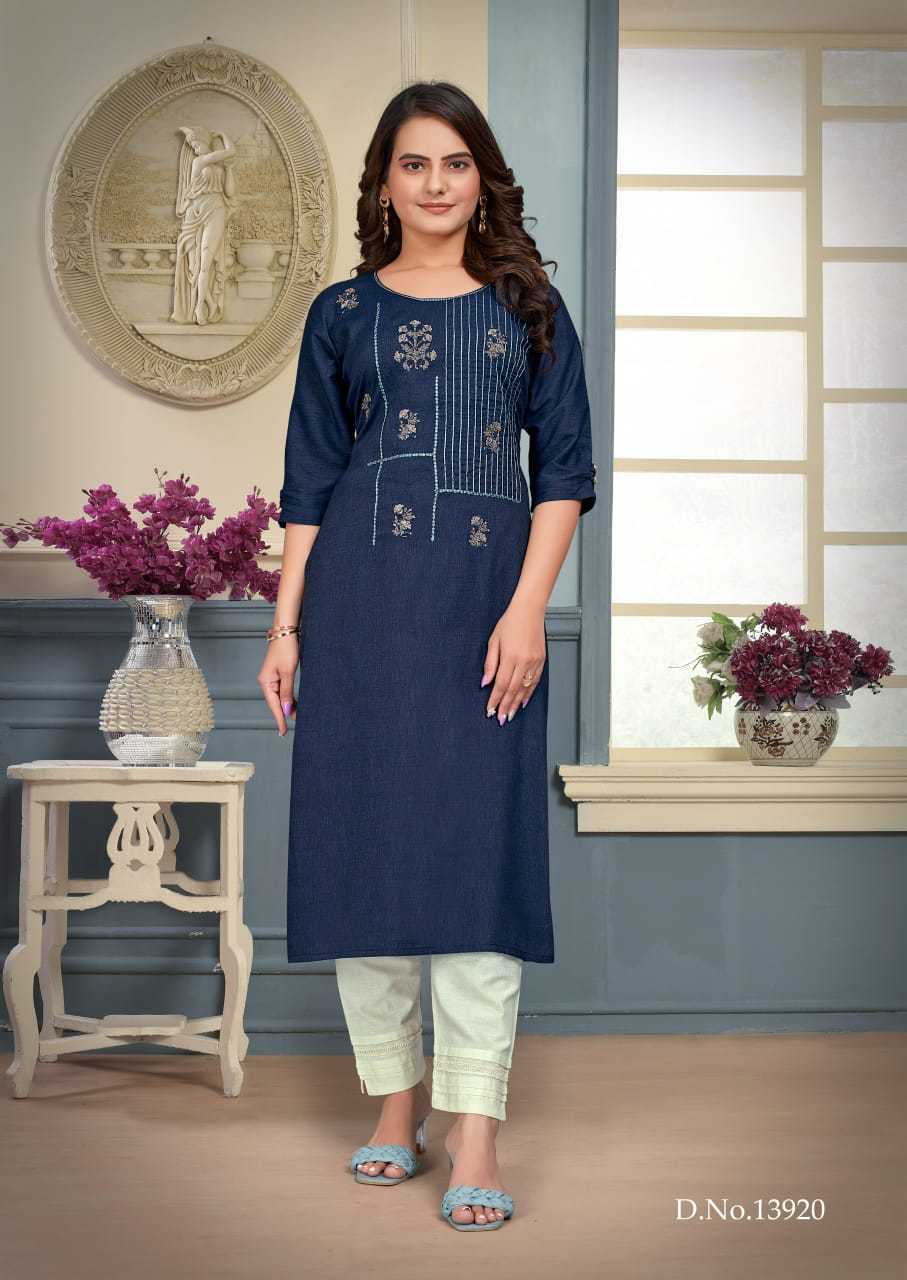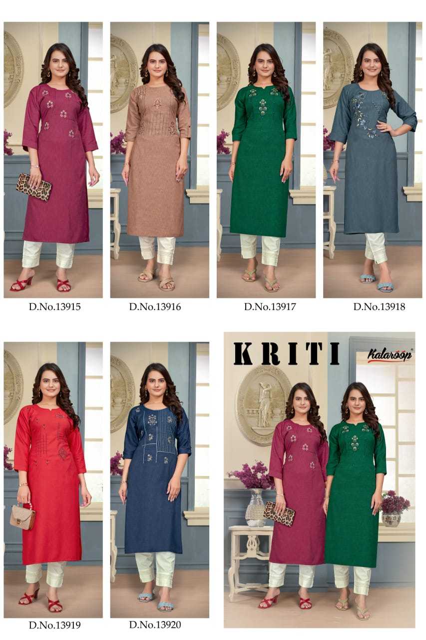 Looking for kalaroop kajree kriti viscose embroidery work stylish full stitch long kurti Full Catalouge at Best Price? Buy Now kalaroop kajree kriti viscose embroidery work stylish full stitch long kurti at Wholesale Rate of Rs 2100 with Total 6 Pcs from authroized dealer and supplier of Brand. Cost of Each piece is just only Rs 350 which is very low and affordable price to resale the product in your retail store. rrgandhi is Surat based Wholesale Supplier & Dealer of Brand. Click on Brand name to Know more about Brand's products.