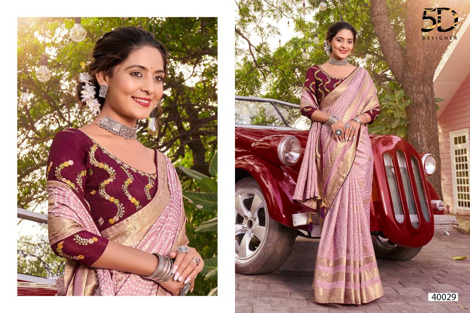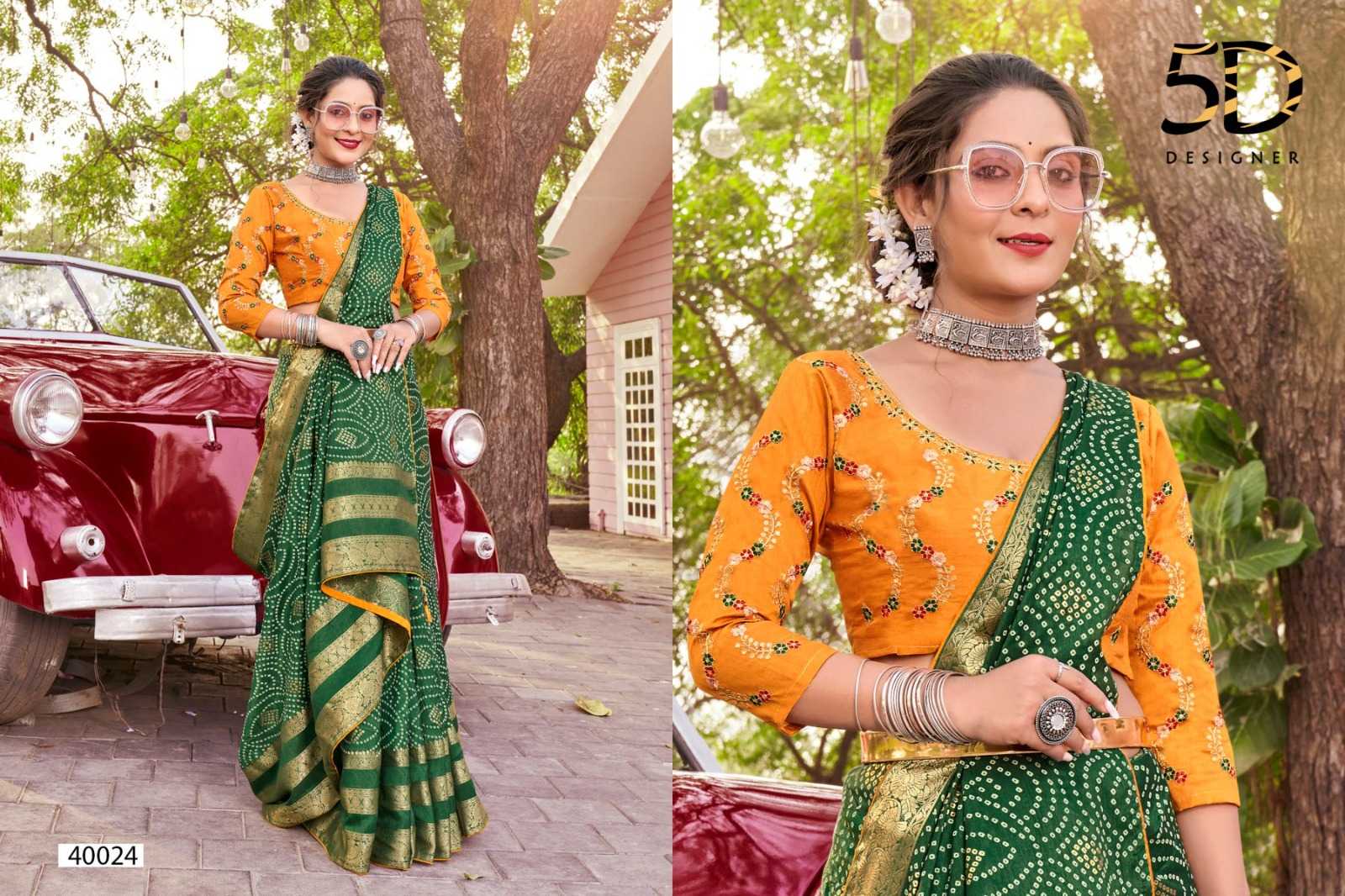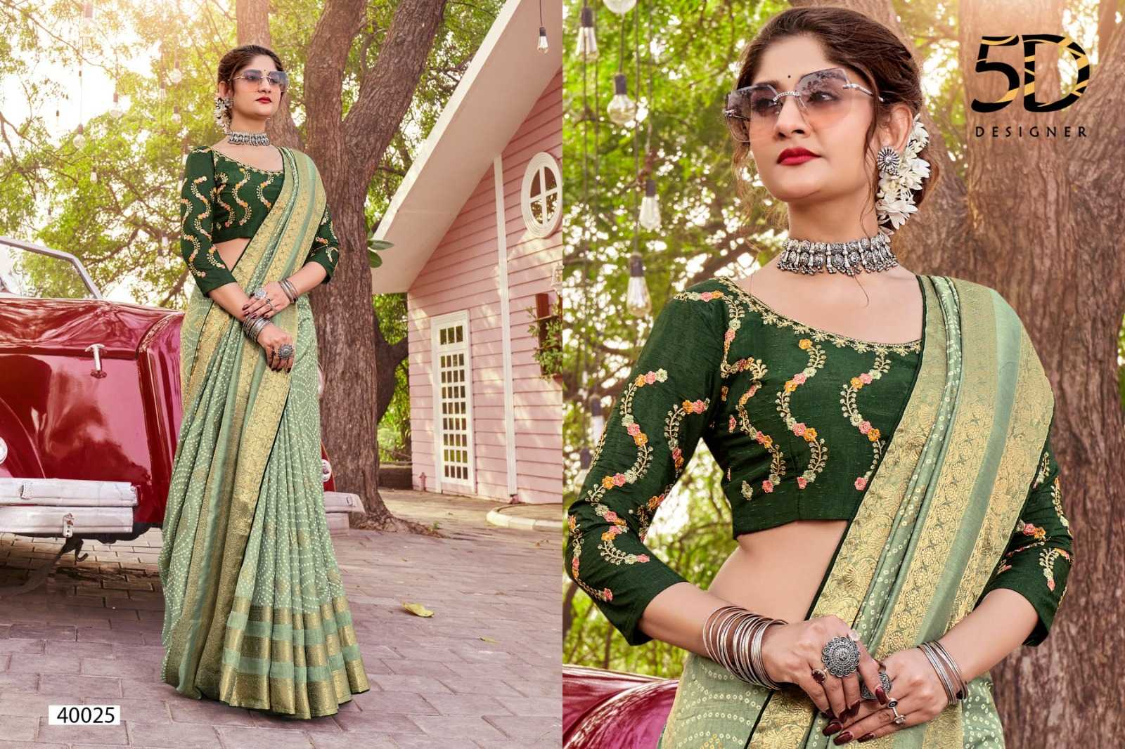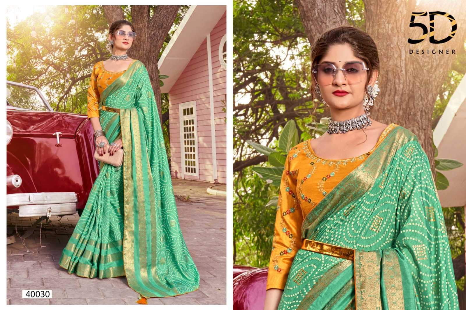 Looking for kalavati 5d designer 40023-40030 classy look soft silk jacquard border with foil print saree Full Catalouge at Best Price? Buy Now kalavati 5d designer 40023-40030 classy look soft silk jacquard border with foil print saree at Wholesale Rate of Rs 6360 with Total 8 Pcs from authroized dealer and supplier of 5D Designer Brand. Cost of Each piece is just only Rs 795 which is very low and affordable price to resale the product in your retail store. rrgandhi is Surat based Wholesale Supplier & Dealer of 5D Designer Brand. Click on Brand name to Know more about Brand's products.
