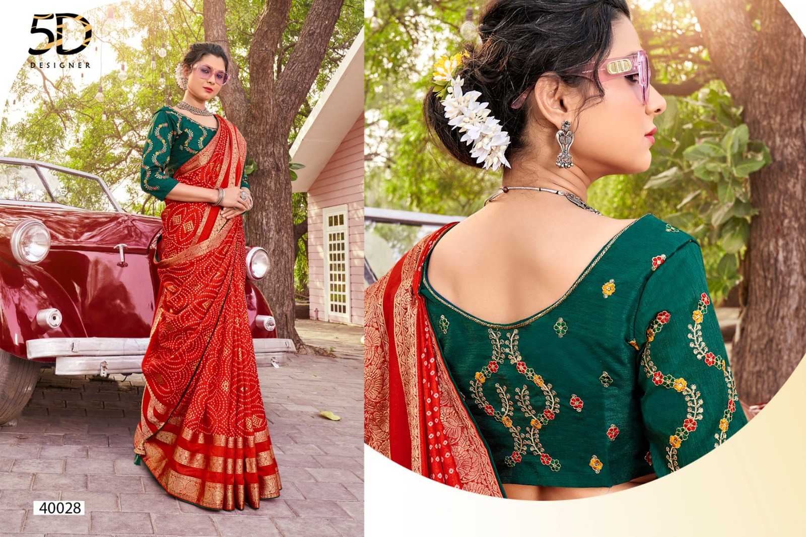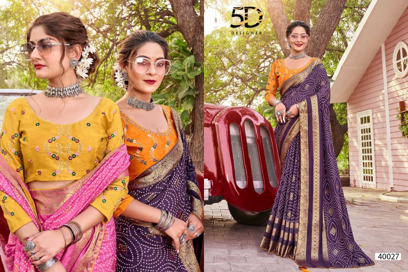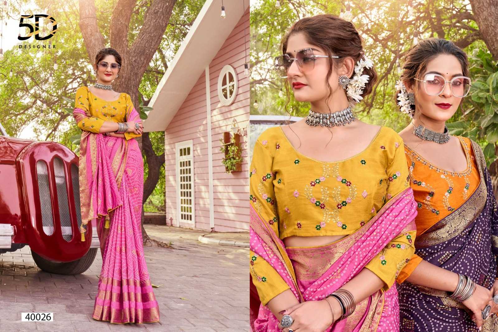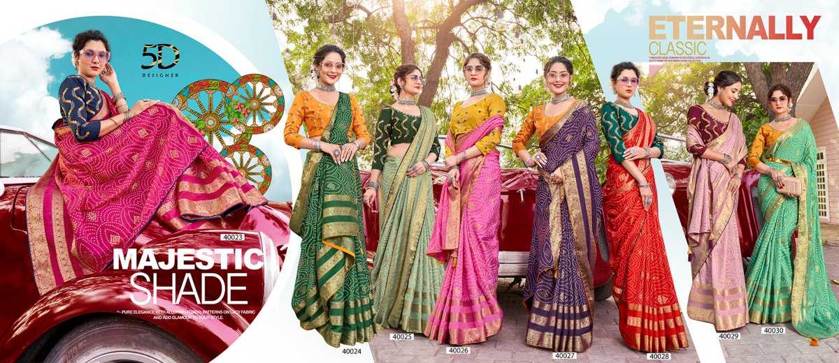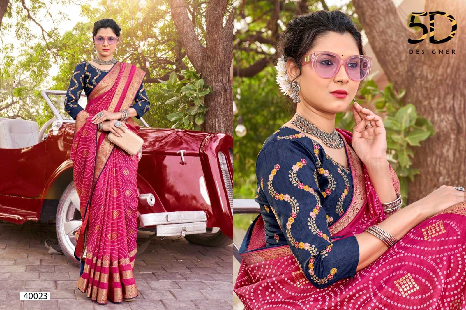 Looking for kalavati 5d designer 40023-40030 classy look soft silk jacquard border with foil print saree Full Catalouge at Best Price? Buy Now kalavati 5d designer 40023-40030 classy look soft silk jacquard border with foil print saree at Wholesale Rate of Rs 6360 with Total 8 Pcs from authroized dealer and supplier of 5D Designer Brand. Cost of Each piece is just only Rs 795 which is very low and affordable price to resale the product in your retail store. rrgandhi is Surat based Wholesale Supplier & Dealer of 5D Designer Brand. Click on Brand name to Know more about Brand's products.