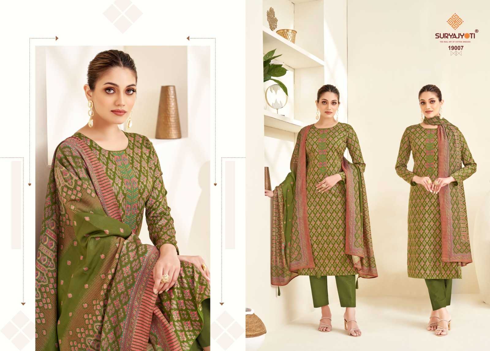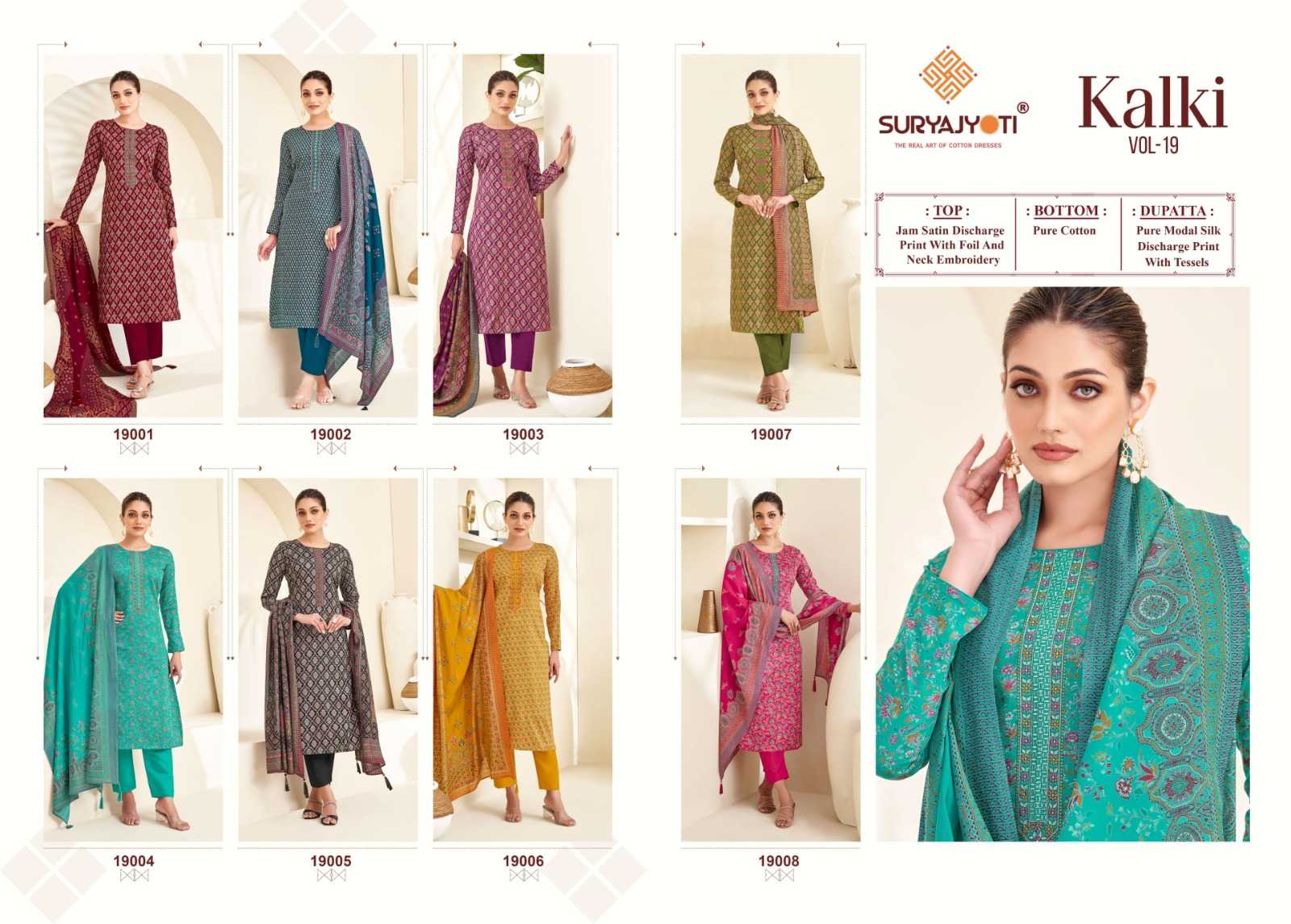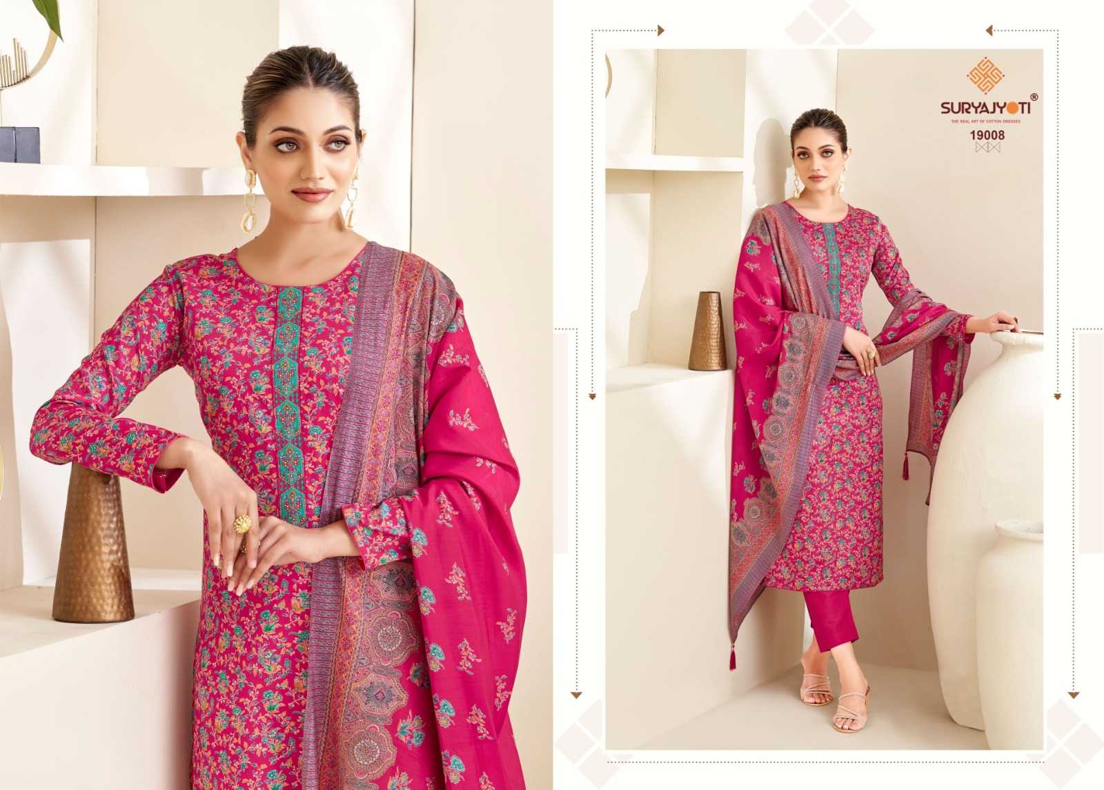 Looking for kalki vol 19 by suryajyoti jam satin unique print emboidery suits Full Catalouge at Best Price? Buy Now kalki vol 19 by suryajyoti jam satin unique print emboidery suits at Wholesale Rate of Rs 6120 with Total 8 Pcs from authroized dealer and supplier of Suryajyoti Cotton Brand. Cost of Each piece is just only Rs 765 which is very low and affordable price to resale the product in your retail store. rrgandhi is Surat based Wholesale Supplier & Dealer of Suryajyoti Cotton Brand. Click on Brand name to Know more about Brand's products.