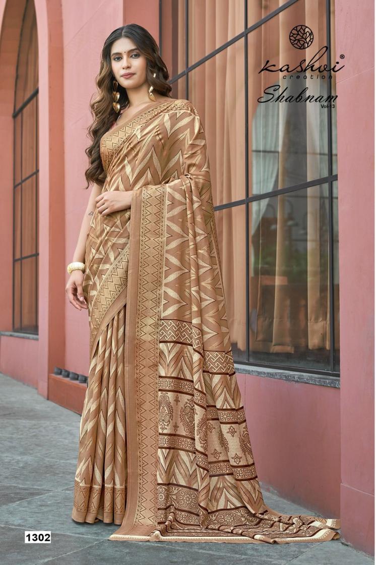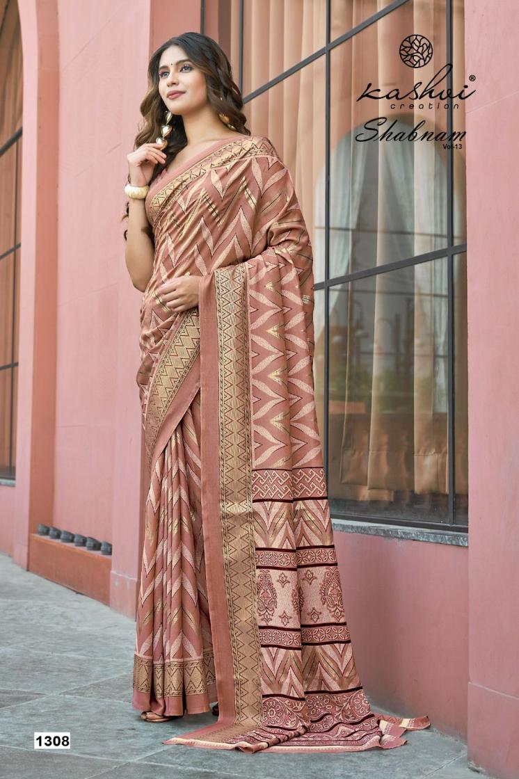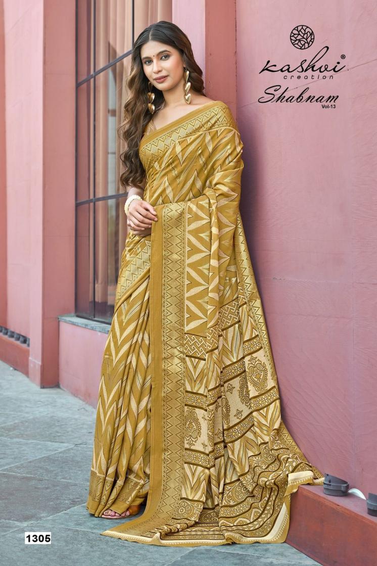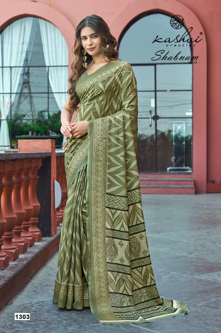 Looking for KASHVI CREATION SHABNAM VOL 13 DULL MOSS SAREE EXPORTS Full Catalouge at Best Price? Buy Now KASHVI CREATION SHABNAM VOL 13 DULL MOSS SAREE EXPORTS at Wholesale Rate of Rs 4360 with Total 8 Pcs from authroized dealer and supplier of Kashvi Creation Brand. Cost of Each piece is just only Rs 545 which is very low and affordable price to resale the product in your retail store. rrgandhi is Surat based Wholesale Supplier & Dealer of Kashvi Creation Brand. Click on Brand name to Know more about Brand's products.