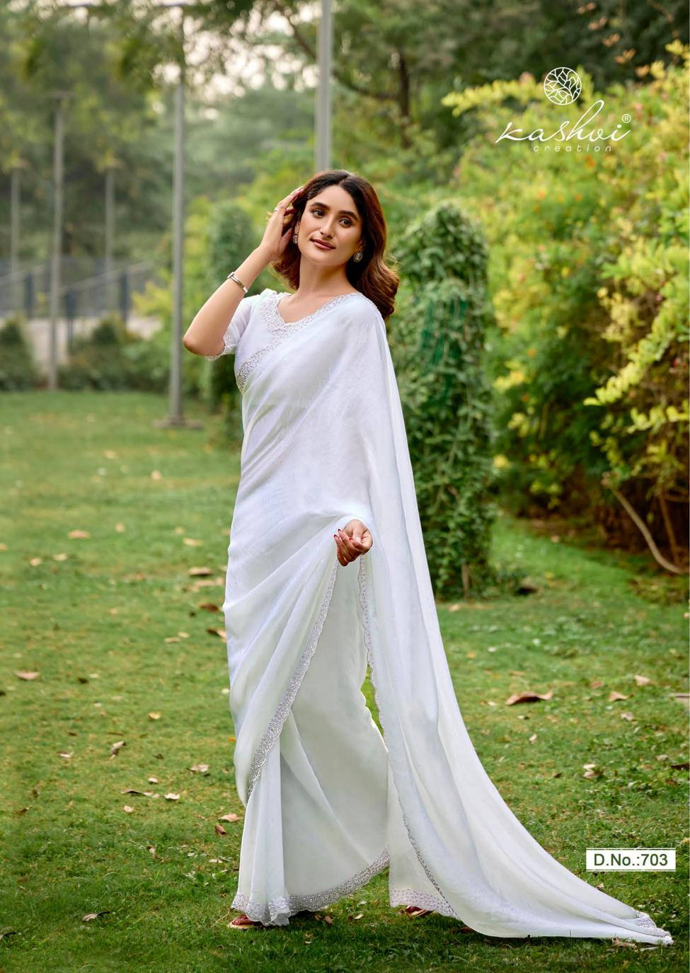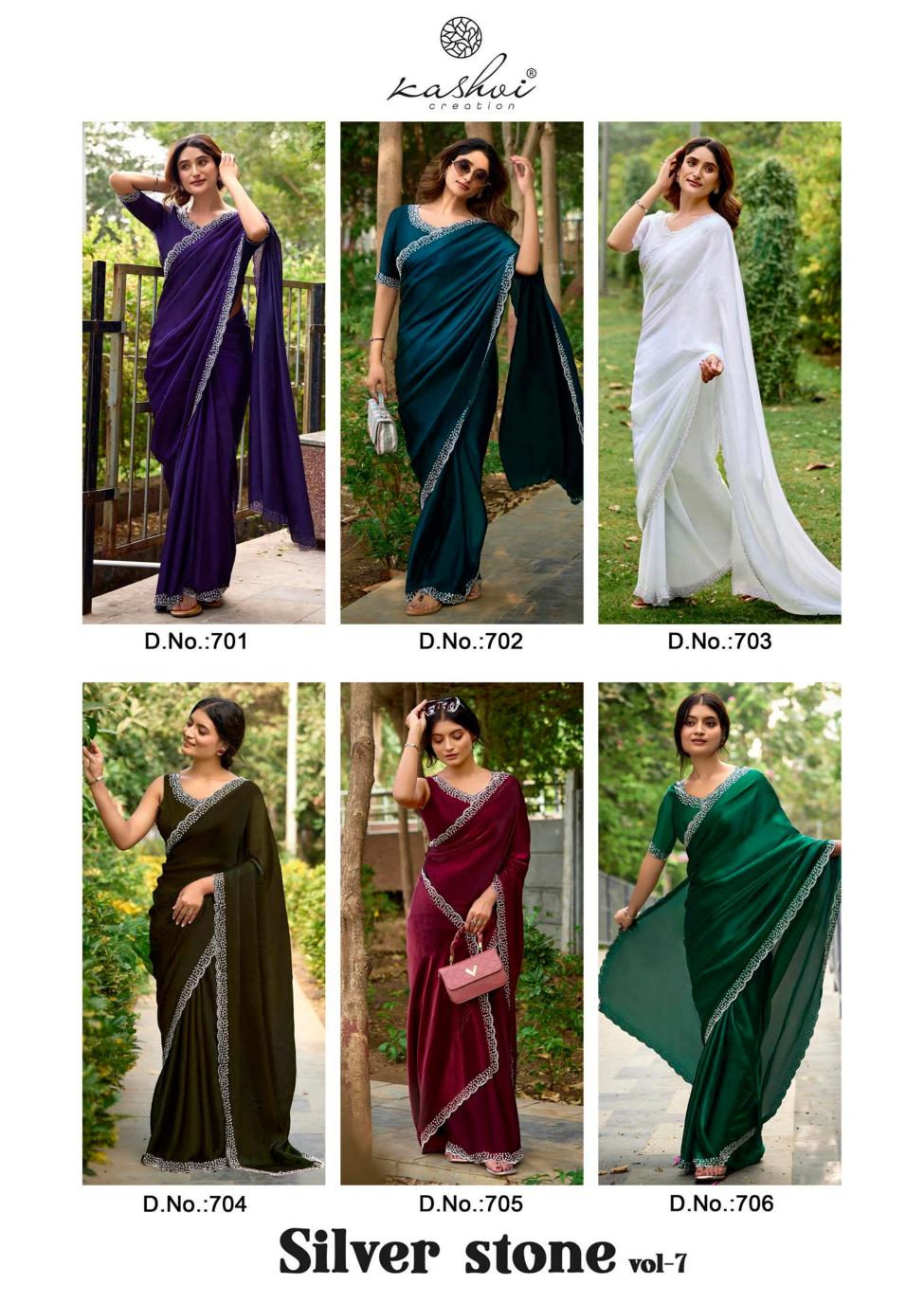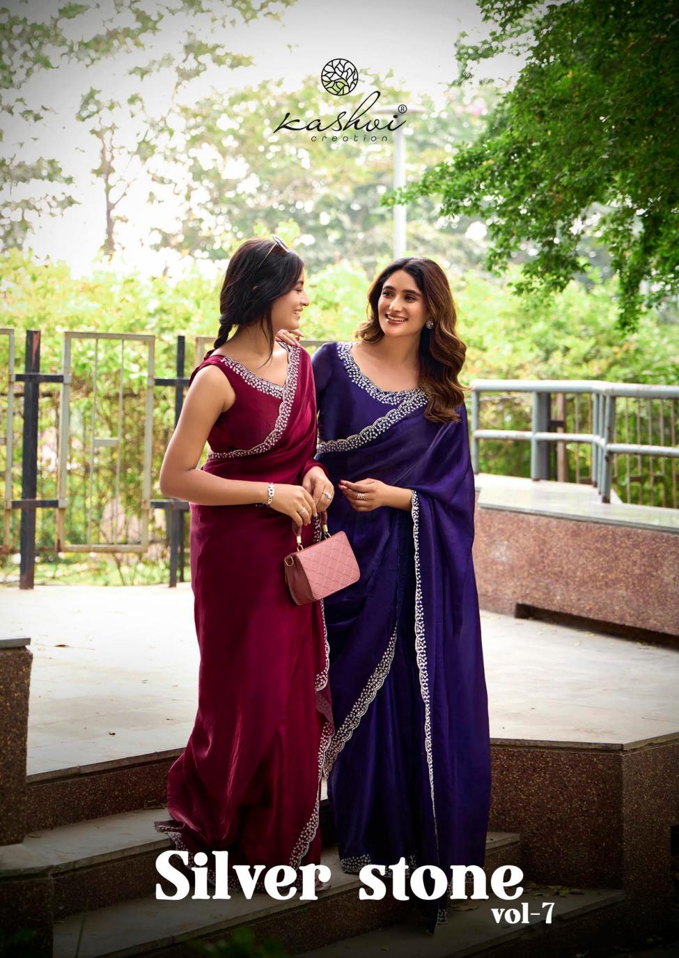 Looking for kashvi creation silver stone vol 7 fancy jharkan work latest saree design 2025 Full Catalouge at Best Price? Buy Now kashvi creation silver stone vol 7 fancy jharkan work latest saree design 2025 at Wholesale Rate of Rs 6870 with Total 6 Pcs from authroized dealer and supplier of Kashvi Creation Brand. Cost of Each piece is just only Rs 1145 which is very low and affordable price to resale the product in your retail store. rrgandhi is Surat based Wholesale Supplier & Dealer of Kashvi Creation Brand. Click on Brand name to Know more about Brand's products.