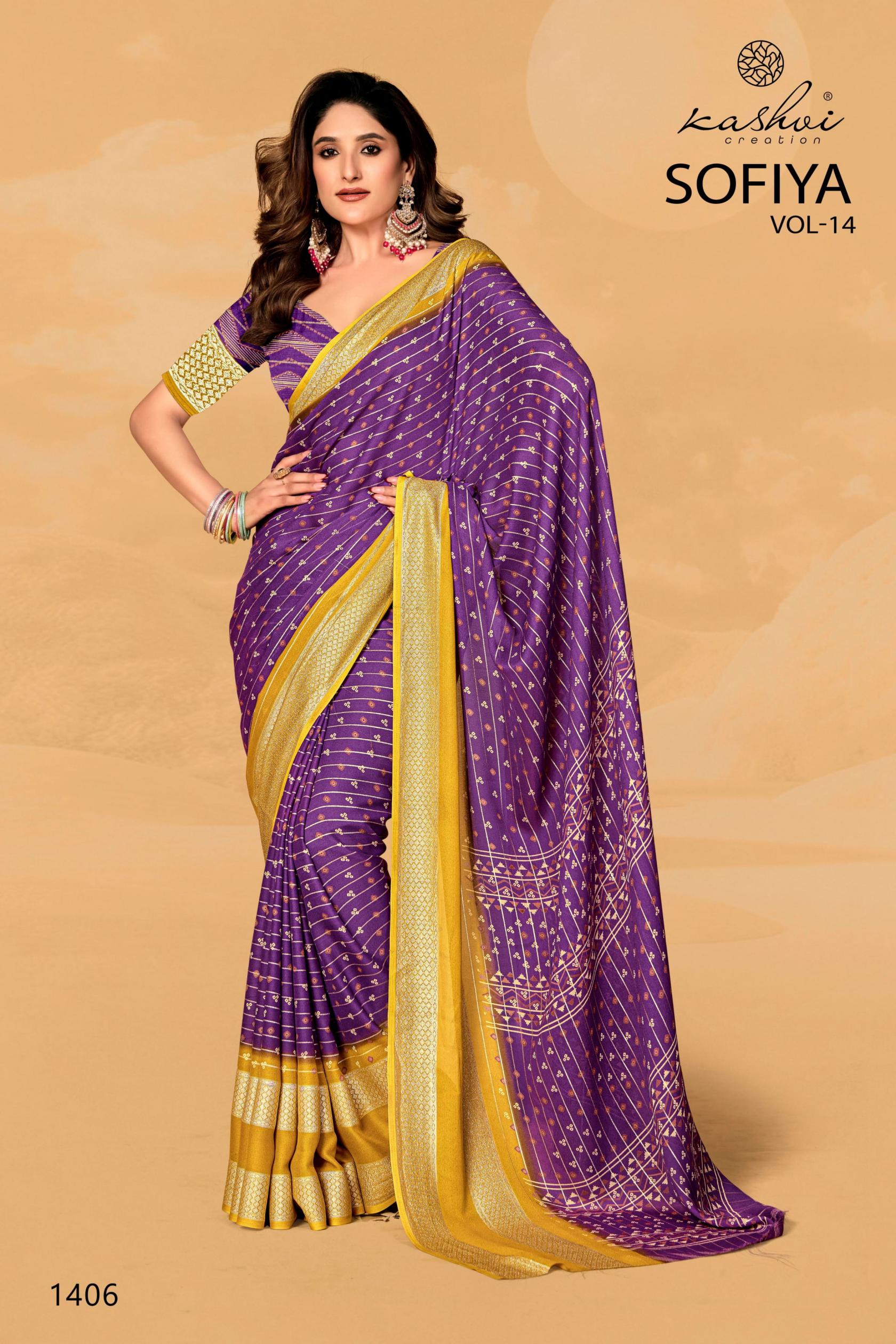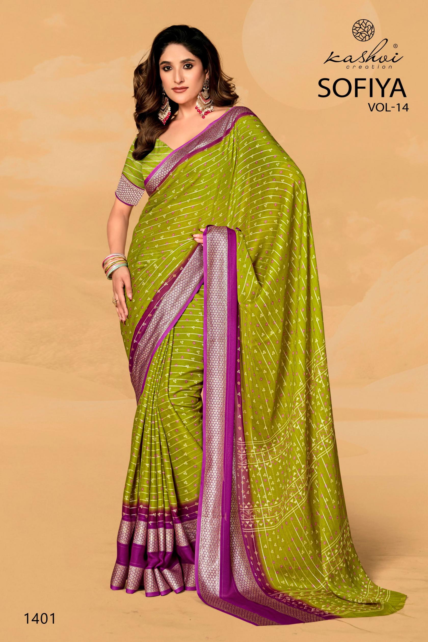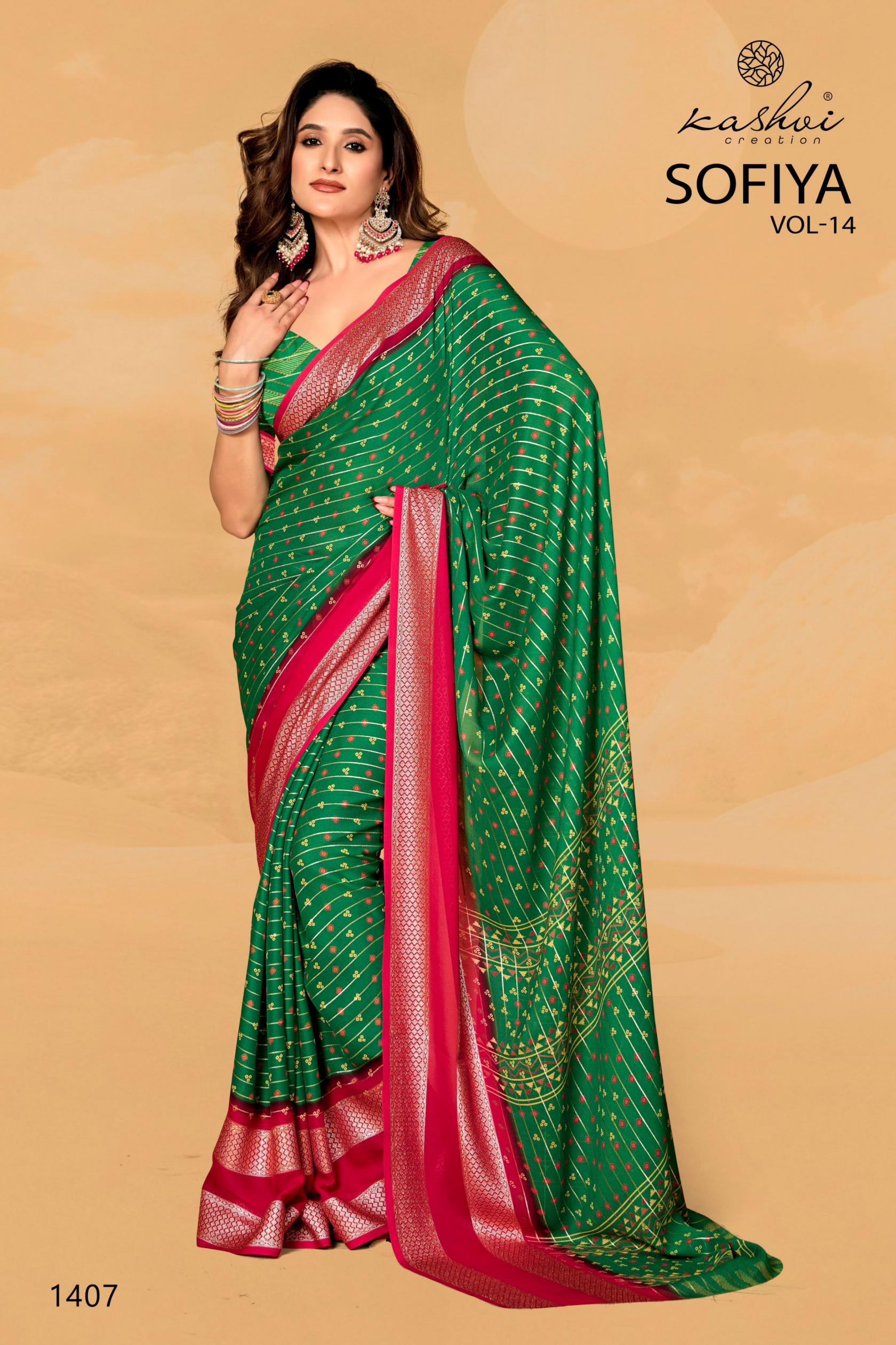 Looking for KASHVI CREATION SOFIYA VOL 14 ELEGANT STYLE DULL MOSS SAREES Full Catalouge at Best Price? Buy Now KASHVI CREATION SOFIYA VOL 14 ELEGANT STYLE DULL MOSS SAREES at Wholesale Rate of Rs 6360 with Total 8 Pcs from authroized dealer and supplier of Kashvi Creation Brand. Cost of Each piece is just only Rs 795 which is very low and affordable price to resale the product in your retail store. rrgandhi is Surat based Wholesale Supplier & Dealer of Kashvi Creation Brand. Click on Brand name to Know more about Brand's products.