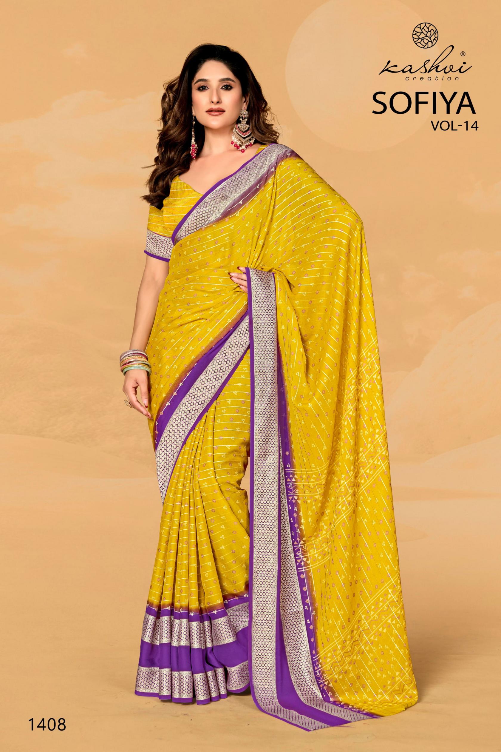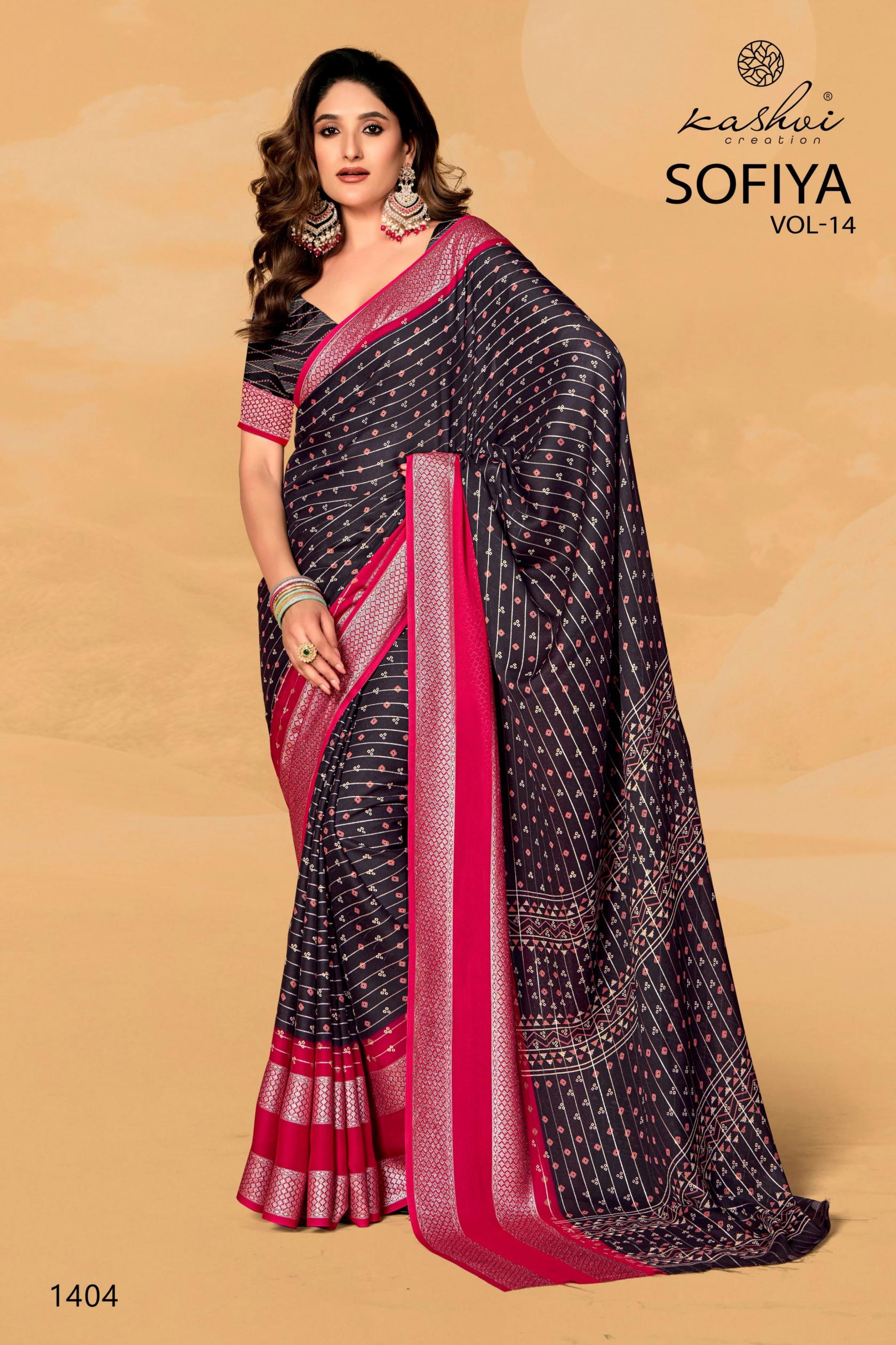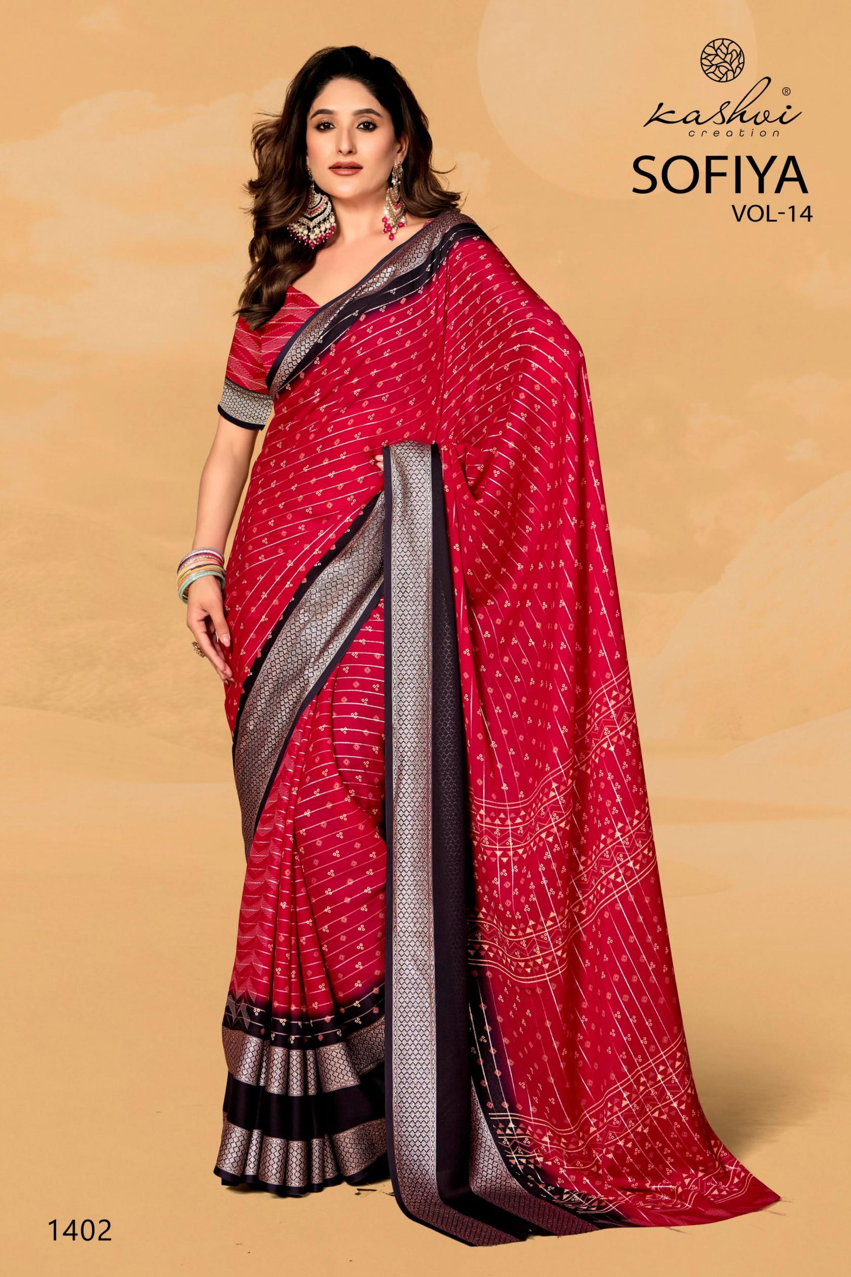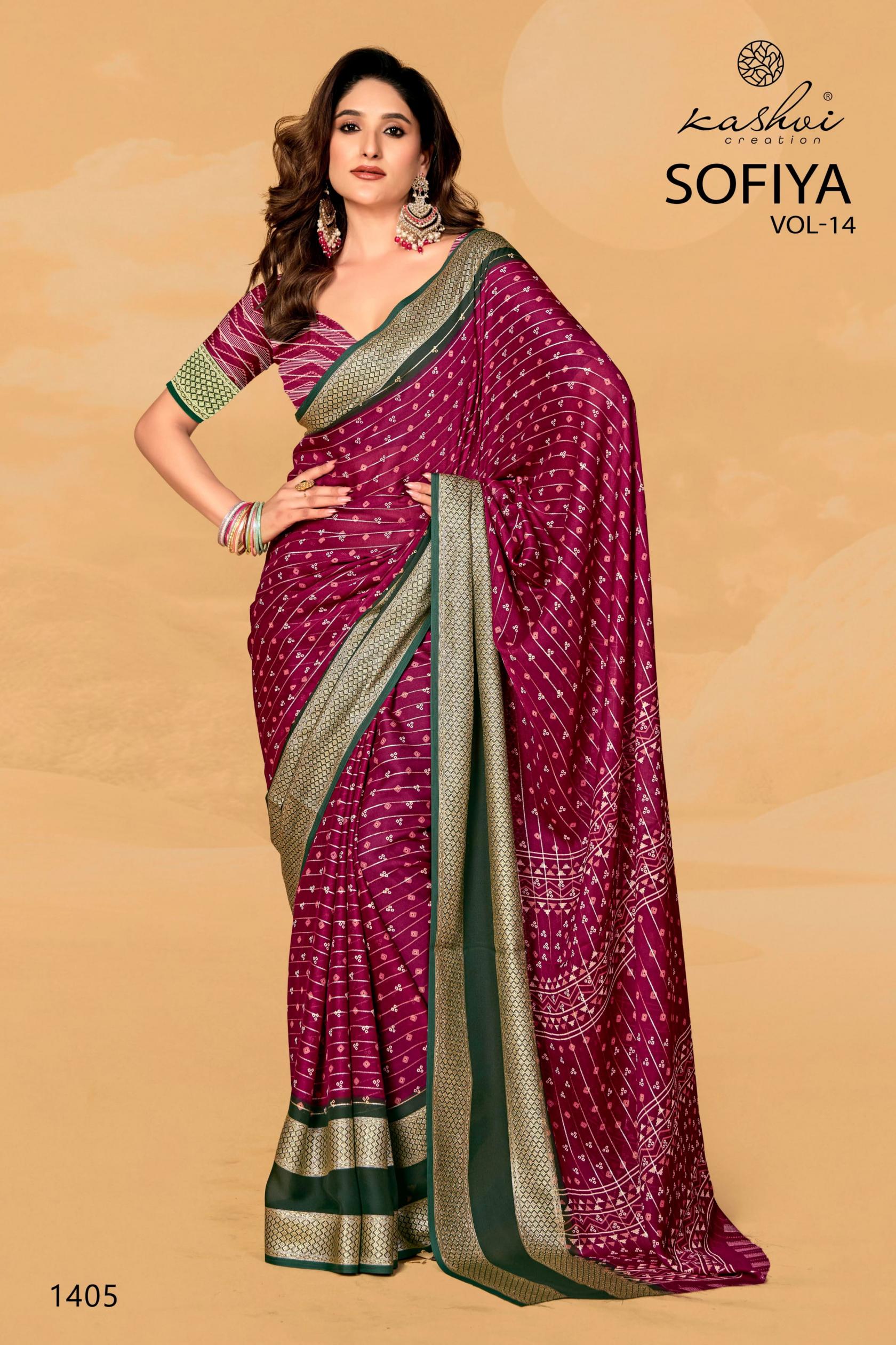 Looking for KASHVI CREATION SOFIYA VOL 14 ELEGANT STYLE DULL MOSS SAREES Full Catalouge at Best Price? Buy Now KASHVI CREATION SOFIYA VOL 14 ELEGANT STYLE DULL MOSS SAREES at Wholesale Rate of Rs 6360 with Total 8 Pcs from authroized dealer and supplier of Kashvi Creation Brand. Cost of Each piece is just only Rs 795 which is very low and affordable price to resale the product in your retail store. rrgandhi is Surat based Wholesale Supplier & Dealer of Kashvi Creation Brand. Click on Brand name to Know more about Brand's products.