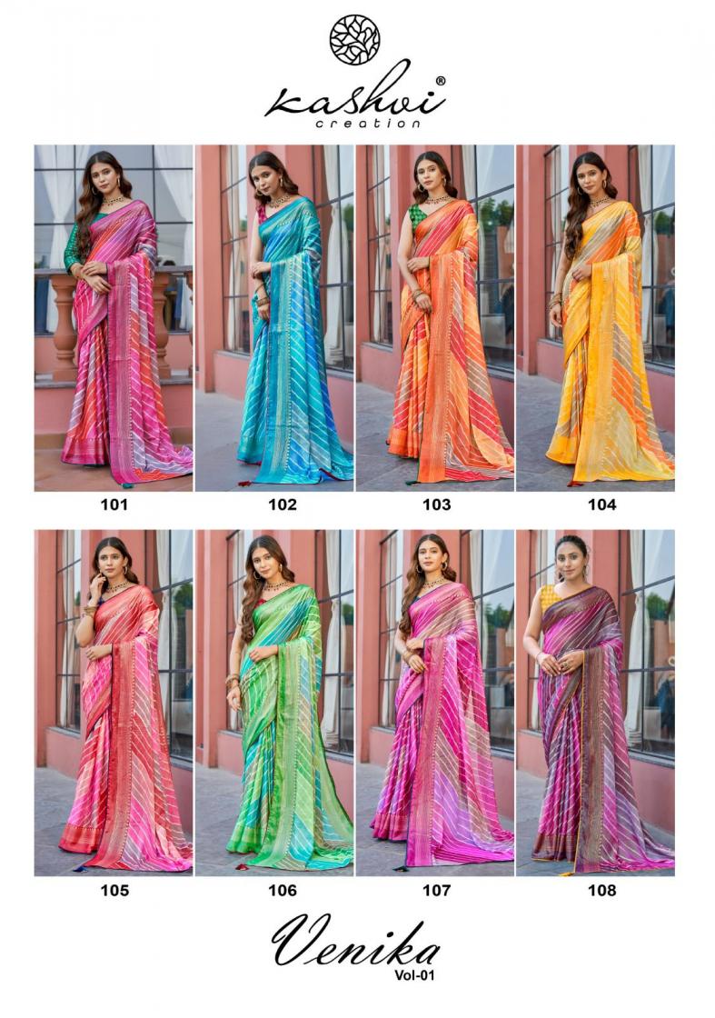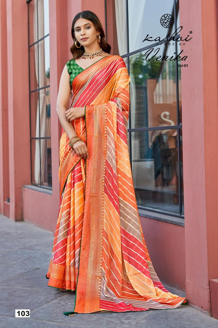 Looking for KASHVI CREATION VENIKA VOL 1 AMAZING CHIFFON BRASSO SAREES Full Catalouge at Best Price? Buy Now KASHVI CREATION VENIKA VOL 1 AMAZING CHIFFON BRASSO SAREES at Wholesale Rate of Rs 6360 with Total 8 Pcs from authroized dealer and supplier of Kashvi Creation Brand. Cost of Each piece is just only Rs 795 which is very low and affordable price to resale the product in your retail store. rrgandhi is Surat based Wholesale Supplier & Dealer of Kashvi Creation Brand. Click on Brand name to Know more about Brand's products.