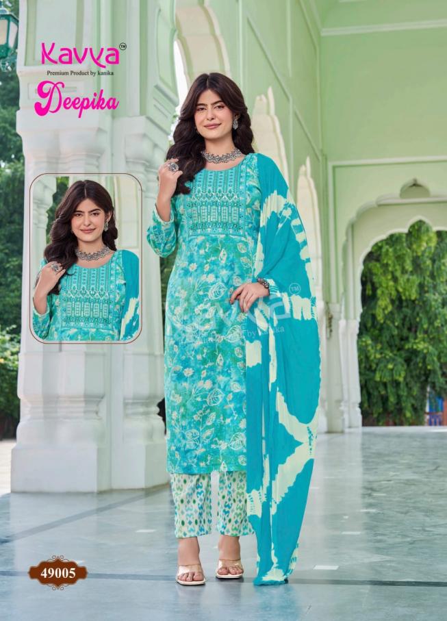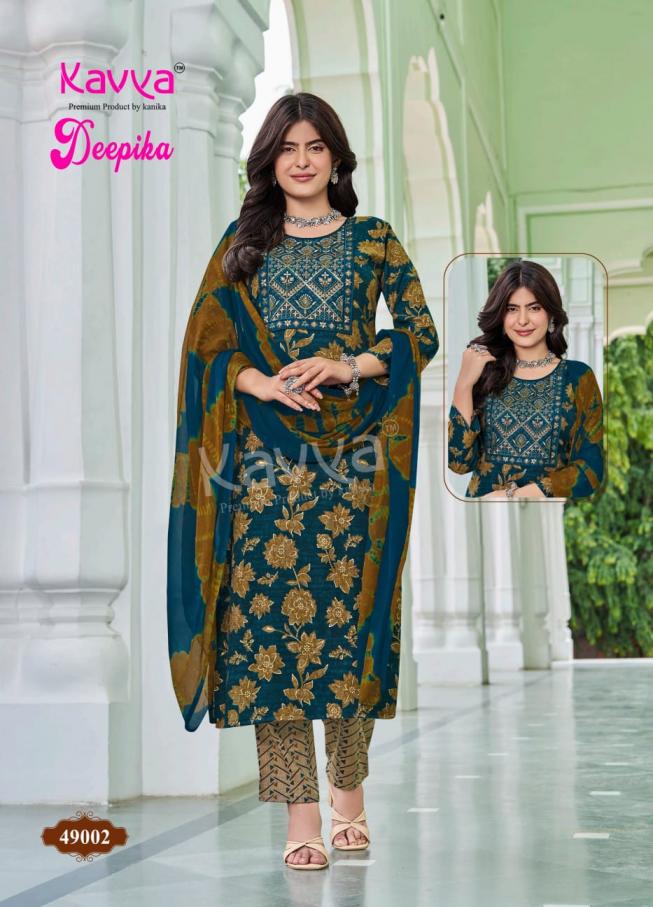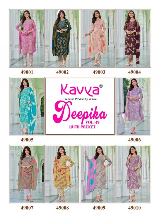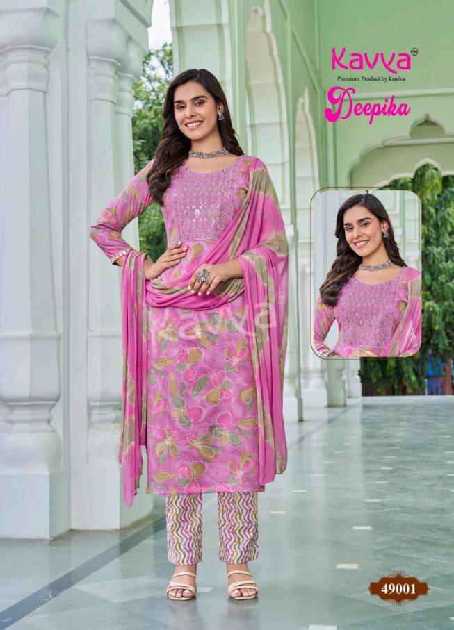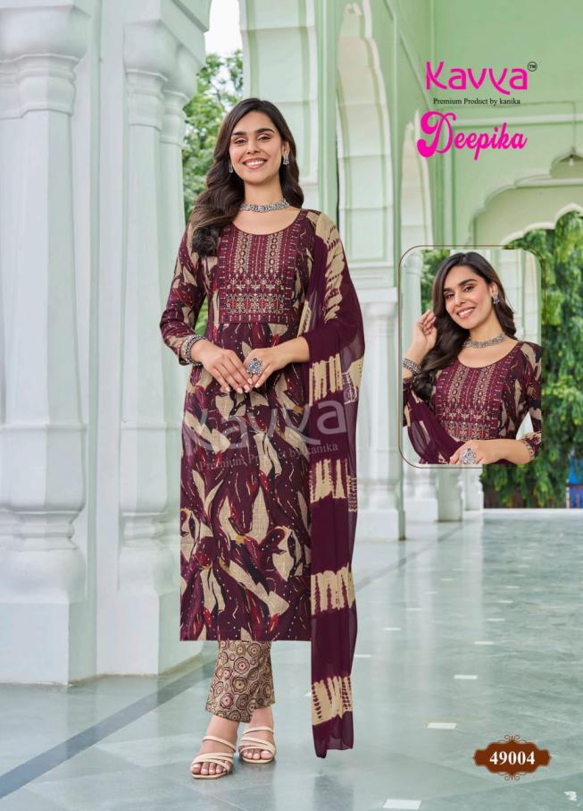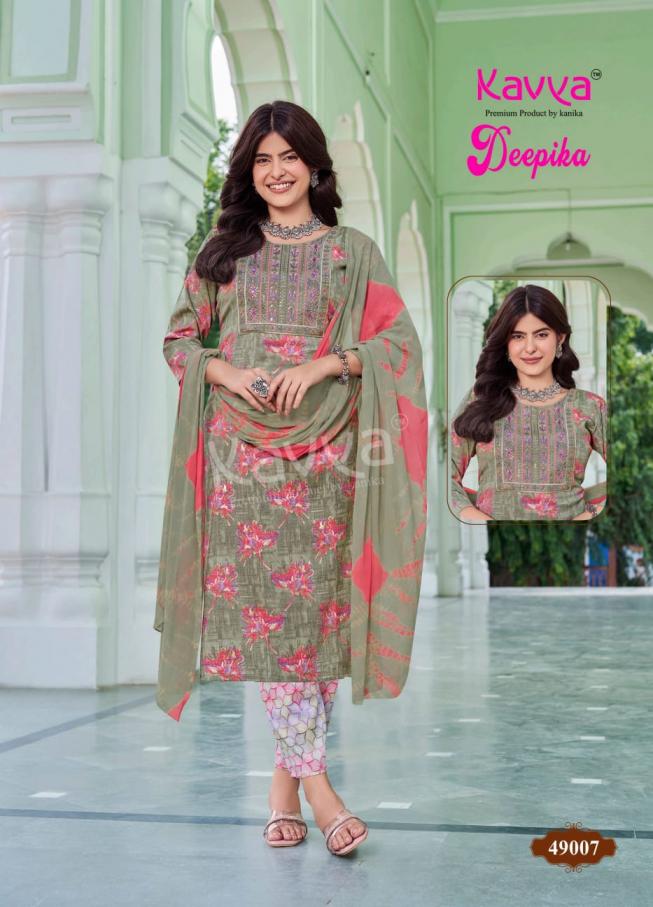Looking for KAVYA DEEPIKA VOL 49 READYMADE STYLISH CAPSULE PRINT 3PCS DRESS Full Catalouge at Best Price? Buy Now KAVYA DEEPIKA VOL 49 READYMADE STYLISH CAPSULE PRINT 3PCS DRESS at Wholesale Rate of Rs 5000 with Total 10 Pcs from authroized dealer and supplier of Kavya by Kanika Brand. Cost of Each piece is just only Rs 500 which is very low and affordable price to resale the product in your retail store. rrgandhi is Surat based Wholesale Supplier & Dealer of Kavya by Kanika Brand. Click on Brand name to Know more about Brand's products.