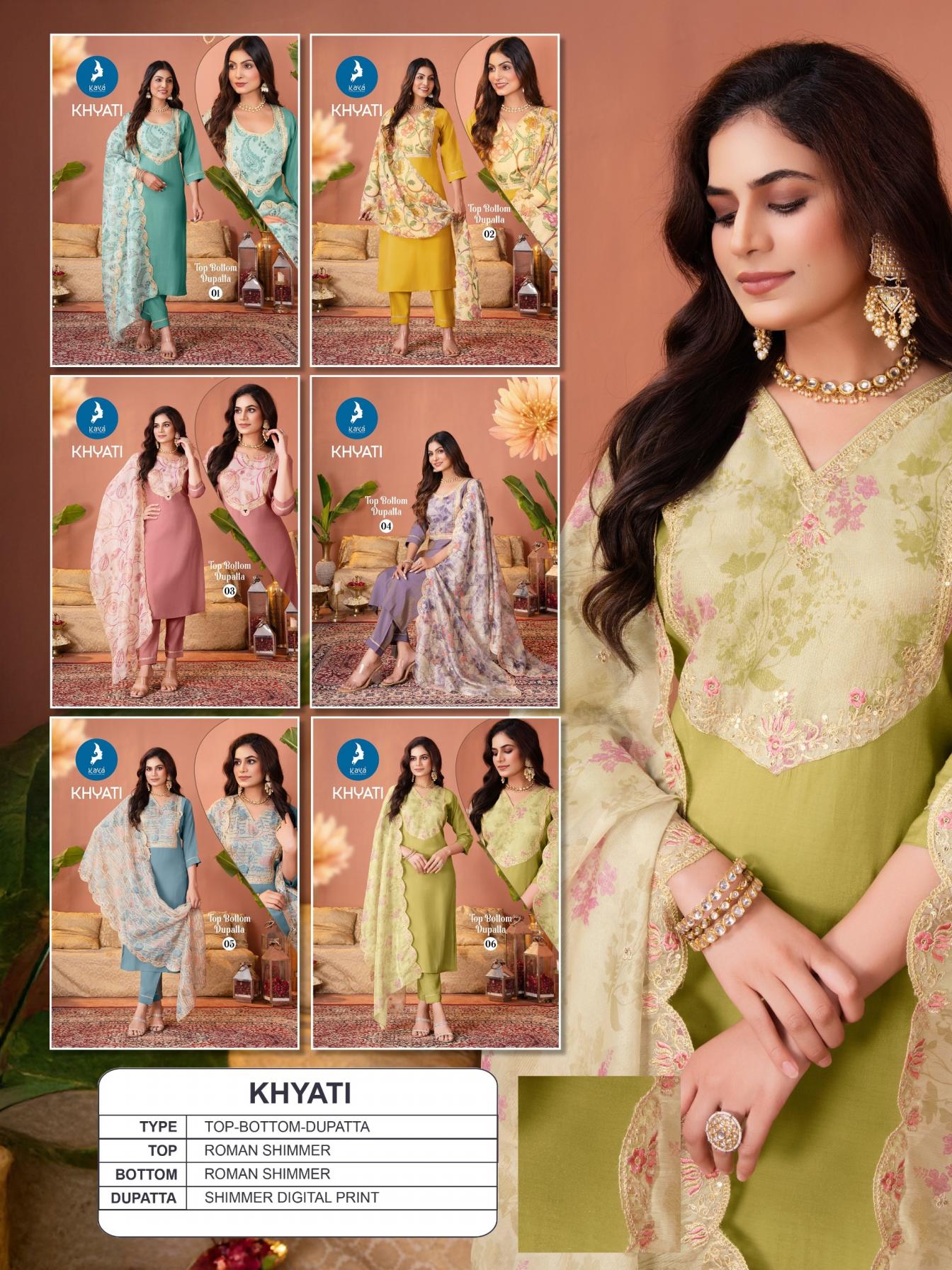 Looking for KAYA KHYATI READYMADE ROMAN SHIMMER BIG SIZE SALWAR KAMEEZ SET Full Catalouge at Best Price? Buy Now KAYA KHYATI READYMADE ROMAN SHIMMER BIG SIZE SALWAR KAMEEZ SET at Wholesale Rate of Rs 5970 with Total 6 Pcs from authroized dealer and supplier of Kaya Brand. Cost of Each piece is just only Rs 995 which is very low and affordable price to resale the product in your retail store. rrgandhi is Surat based Wholesale Supplier & Dealer of Kaya Brand. Click on Brand name to Know more about Brand's products.