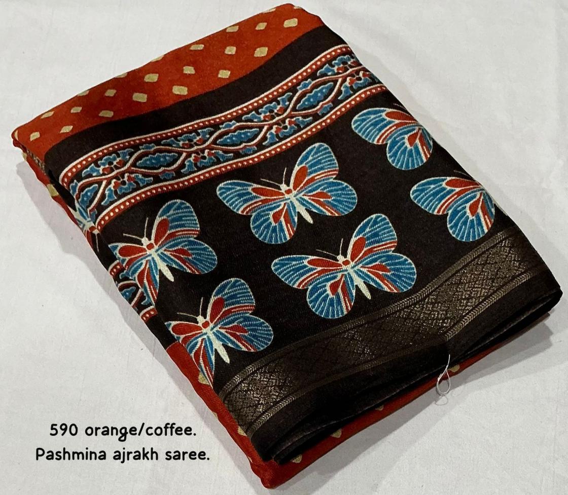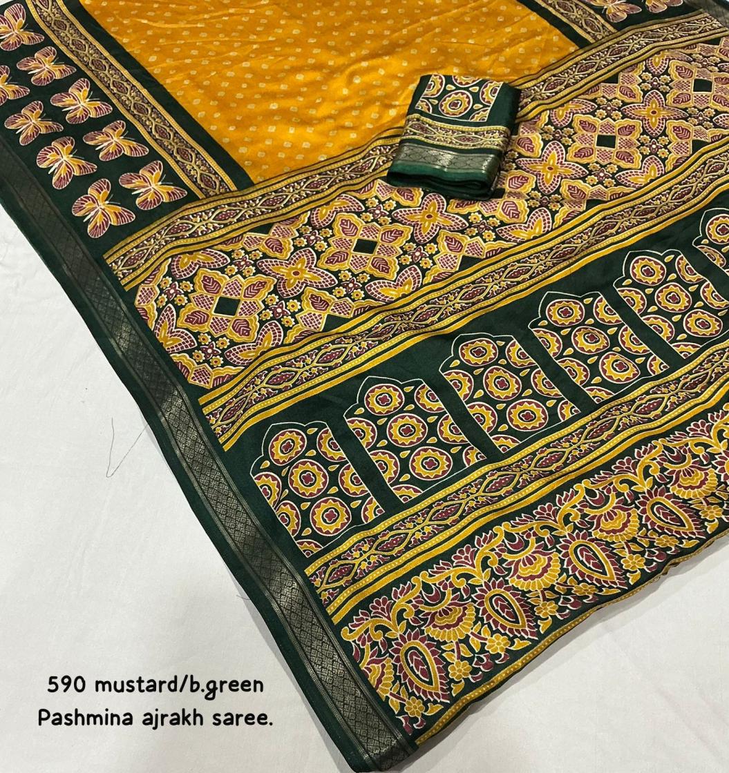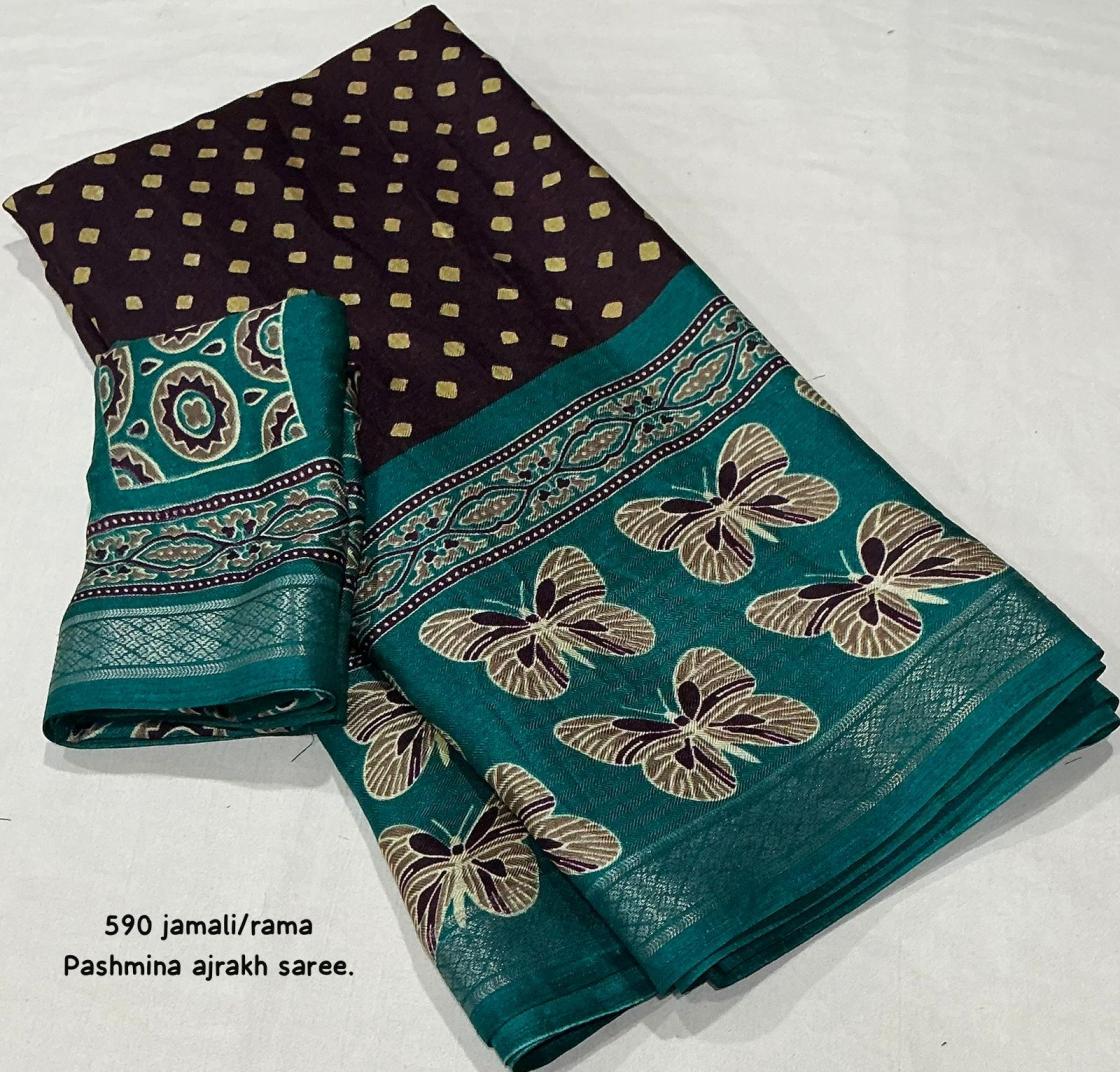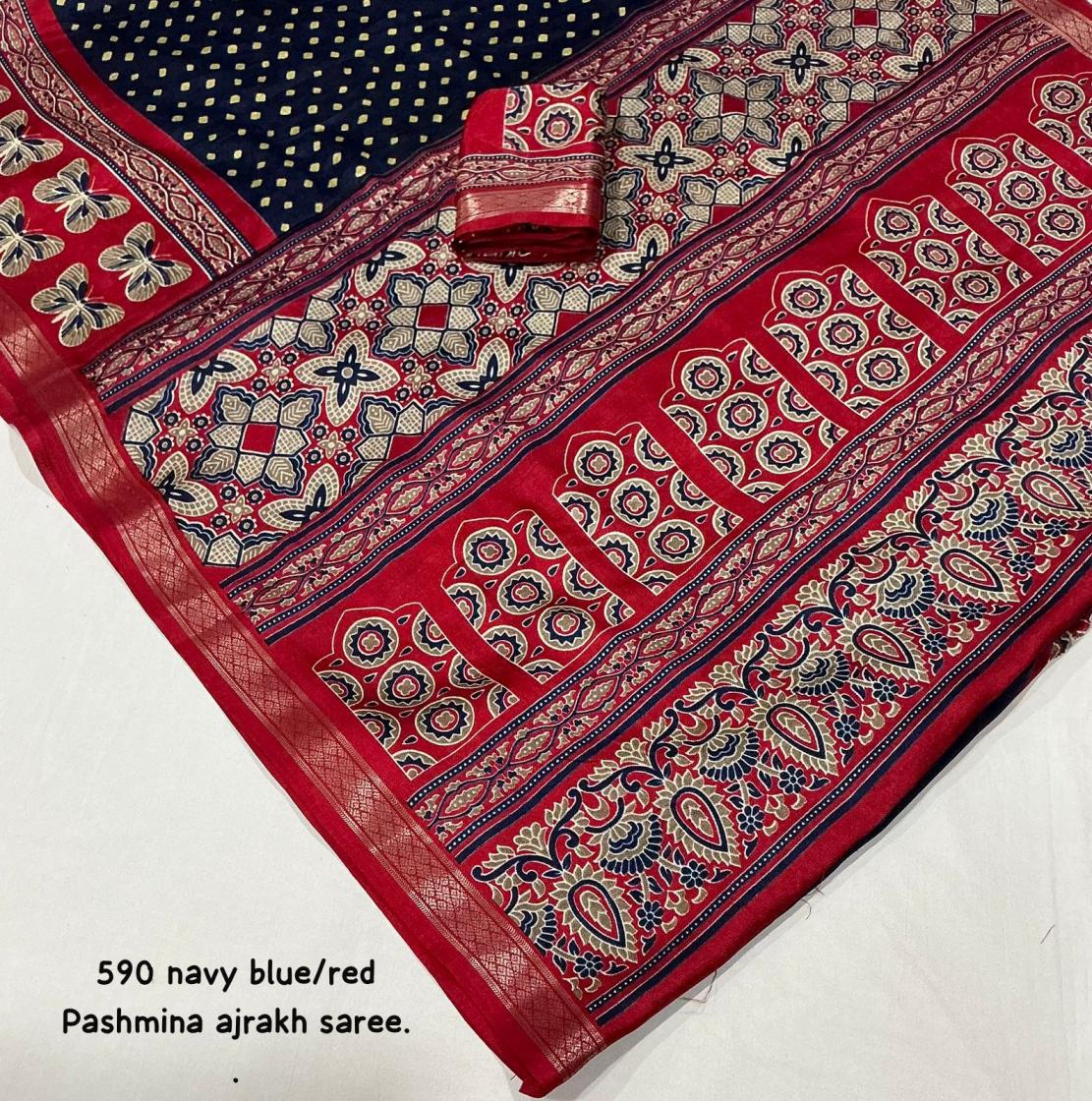 Looking for KC 590 HIT DESIGN PASHMINA AJRAKH SAREES ONLINE Full Catalouge at Best Price? Buy Now KC 590 HIT DESIGN PASHMINA AJRAKH SAREES ONLINE at Wholesale Rate of Rs 3540 with Total 6 Pcs from authroized dealer and supplier of P R Clothing Brand. Cost of Each piece is just only Rs 590 which is very low and affordable price to resale the product in your retail store. rrgandhi is Surat based Wholesale Supplier & Dealer of P R Clothing Brand. Click on Brand name to Know more about Brand's products.