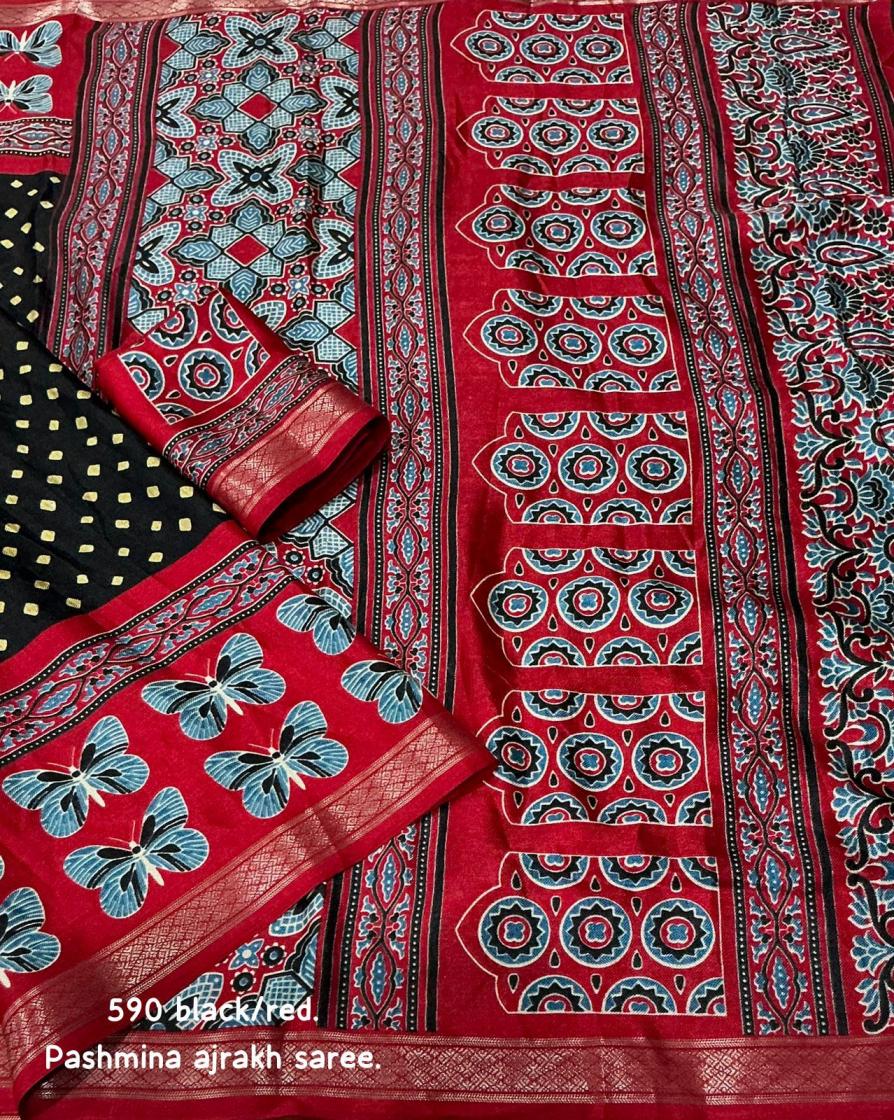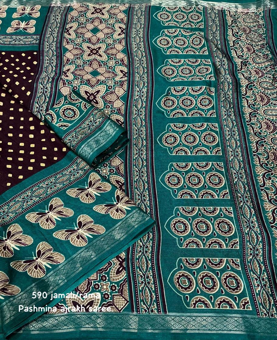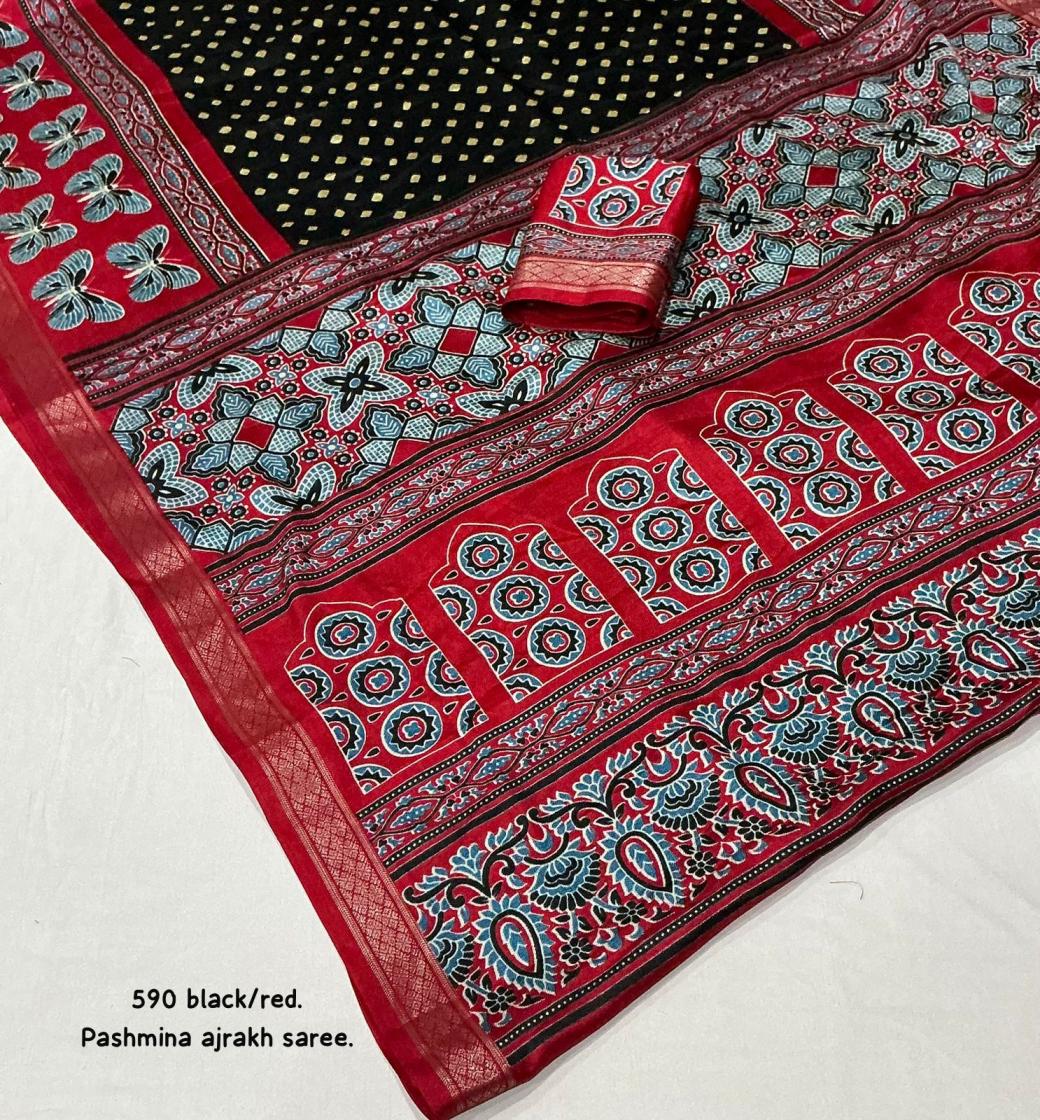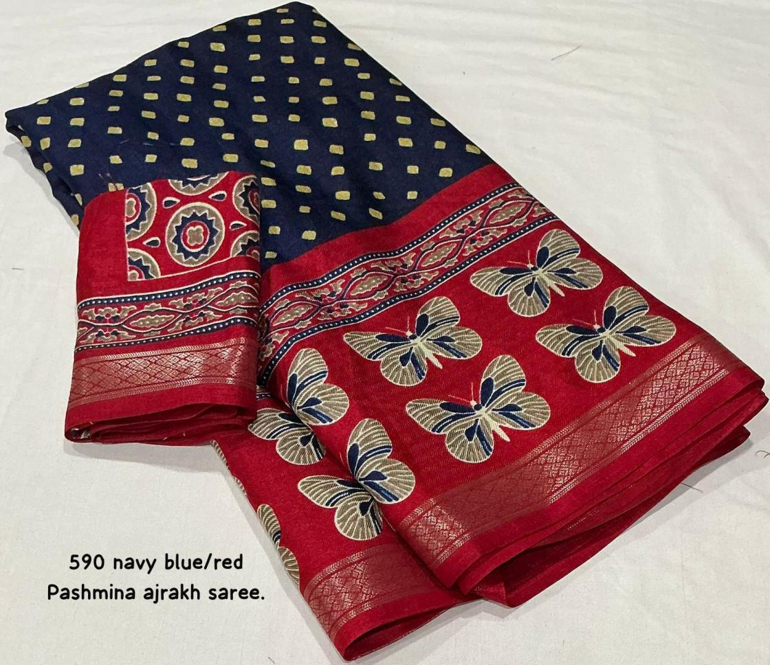 Looking for KC 590 HIT DESIGN PASHMINA AJRAKH SAREES ONLINE Full Catalouge at Best Price? Buy Now KC 590 HIT DESIGN PASHMINA AJRAKH SAREES ONLINE at Wholesale Rate of Rs 3540 with Total 6 Pcs from authroized dealer and supplier of P R Clothing Brand. Cost of Each piece is just only Rs 590 which is very low and affordable price to resale the product in your retail store. rrgandhi is Surat based Wholesale Supplier & Dealer of P R Clothing Brand. Click on Brand name to Know more about Brand's products.