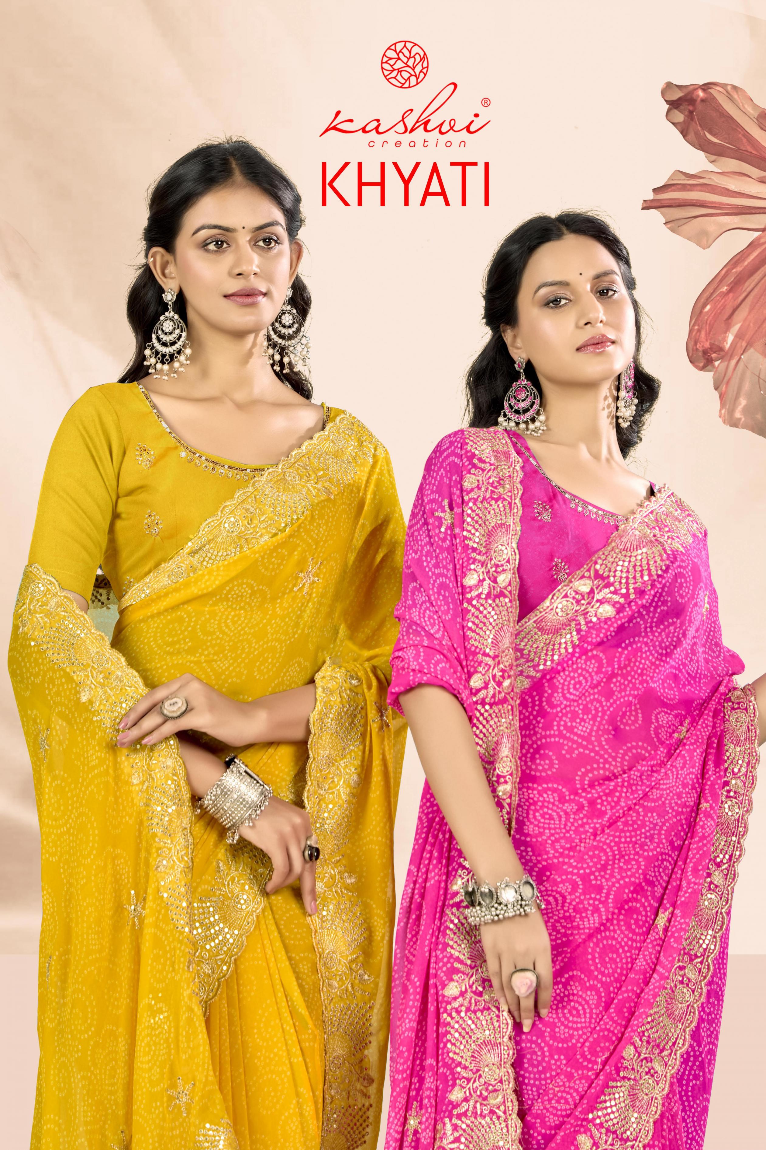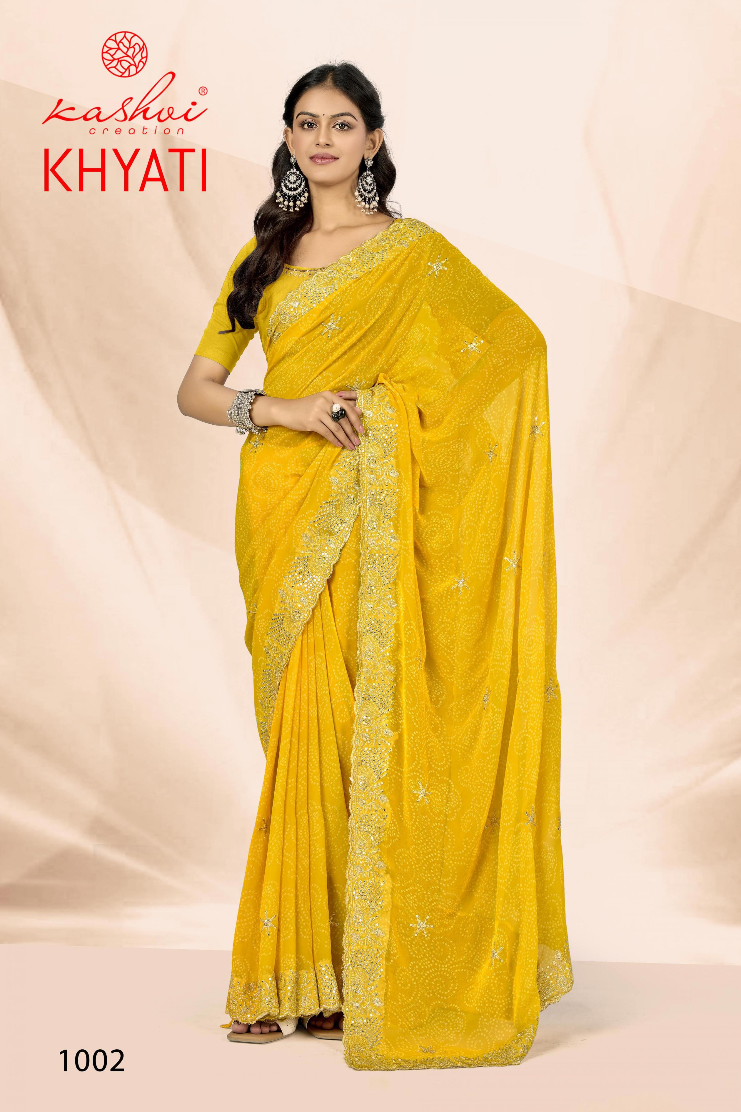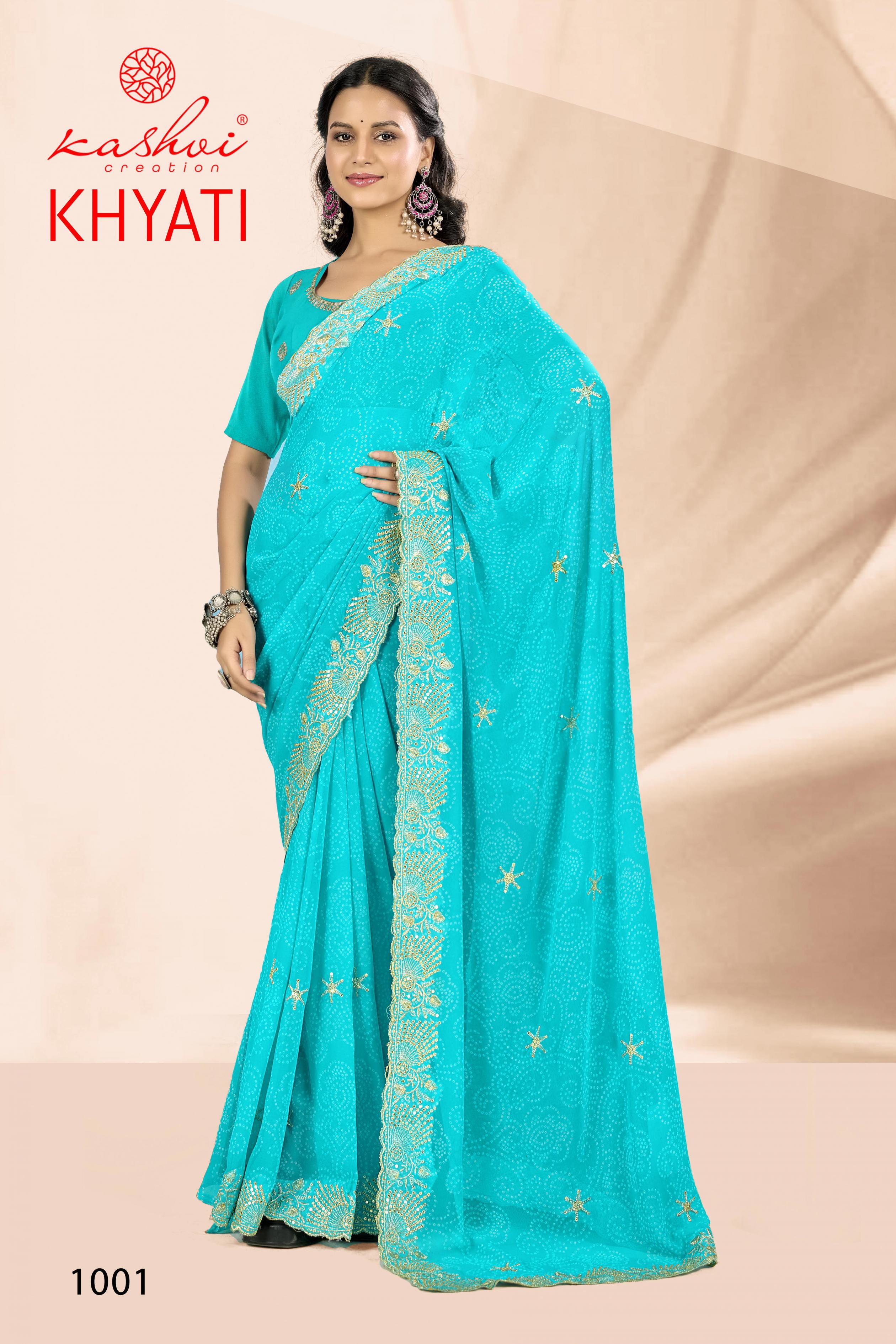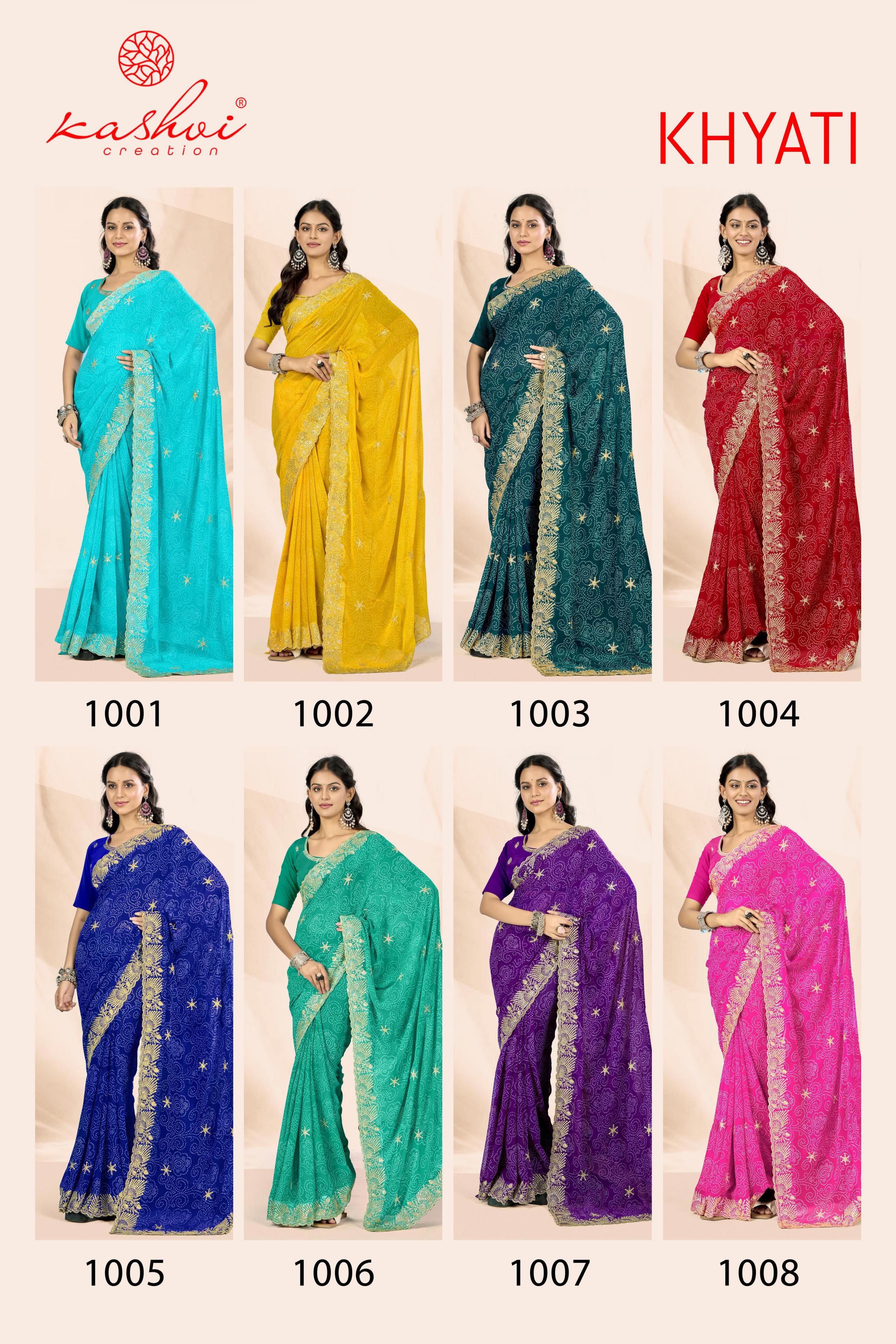 Looking for KHYATI BY KASHVI CREATION GORGETTE CASUAL WEAR SAREE Full Catalouge at Best Price? Buy Now KHYATI BY KASHVI CREATION GORGETTE CASUAL WEAR SAREE at Wholesale Rate of Rs 7320 with Total 8 Pcs from authroized dealer and supplier of Kashvi Creation Brand. Cost of Each piece is just only Rs 915 which is very low and affordable price to resale the product in your retail store. rrgandhi is Surat based Wholesale Supplier & Dealer of Kashvi Creation Brand. Click on Brand name to Know more about Brand's products.
