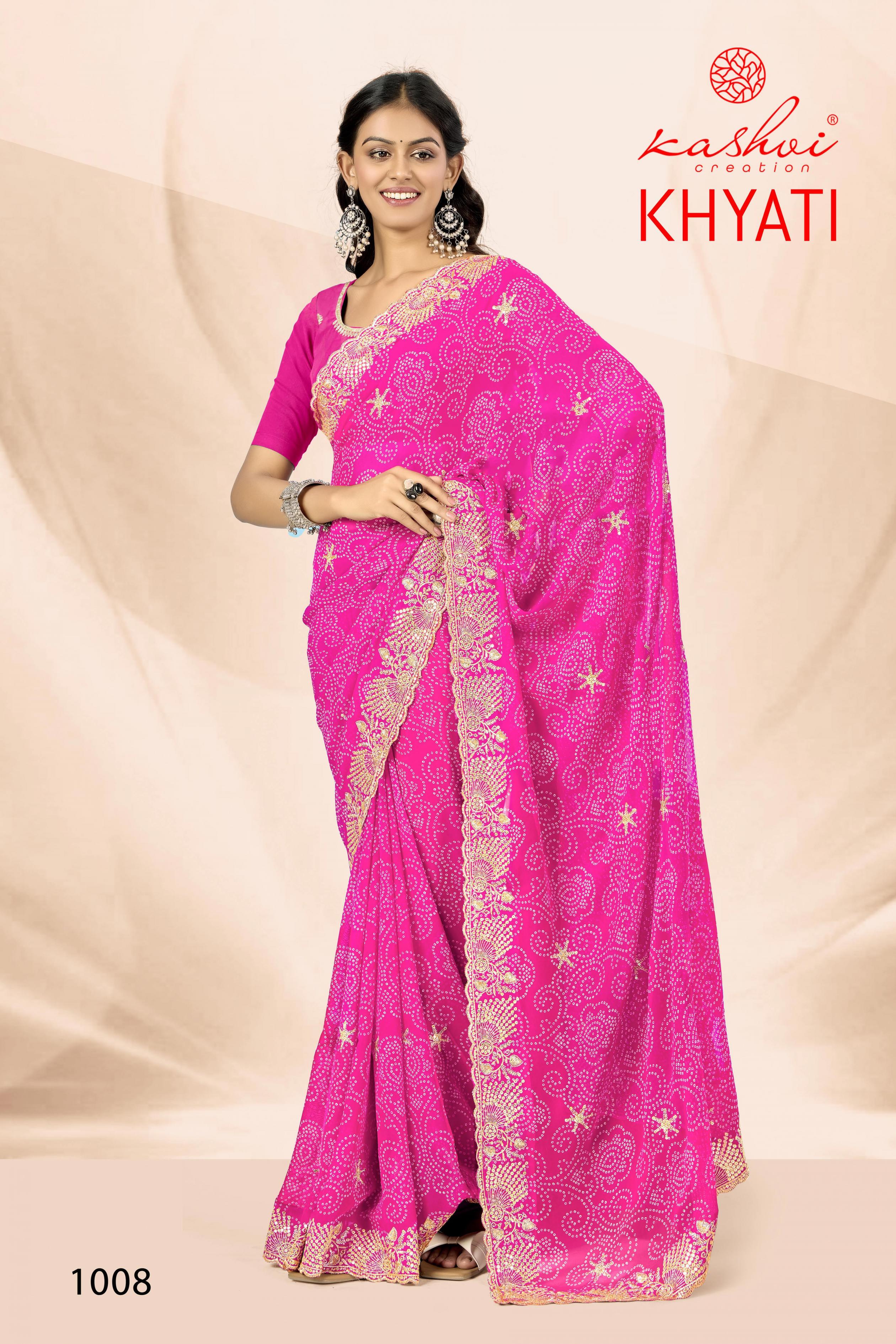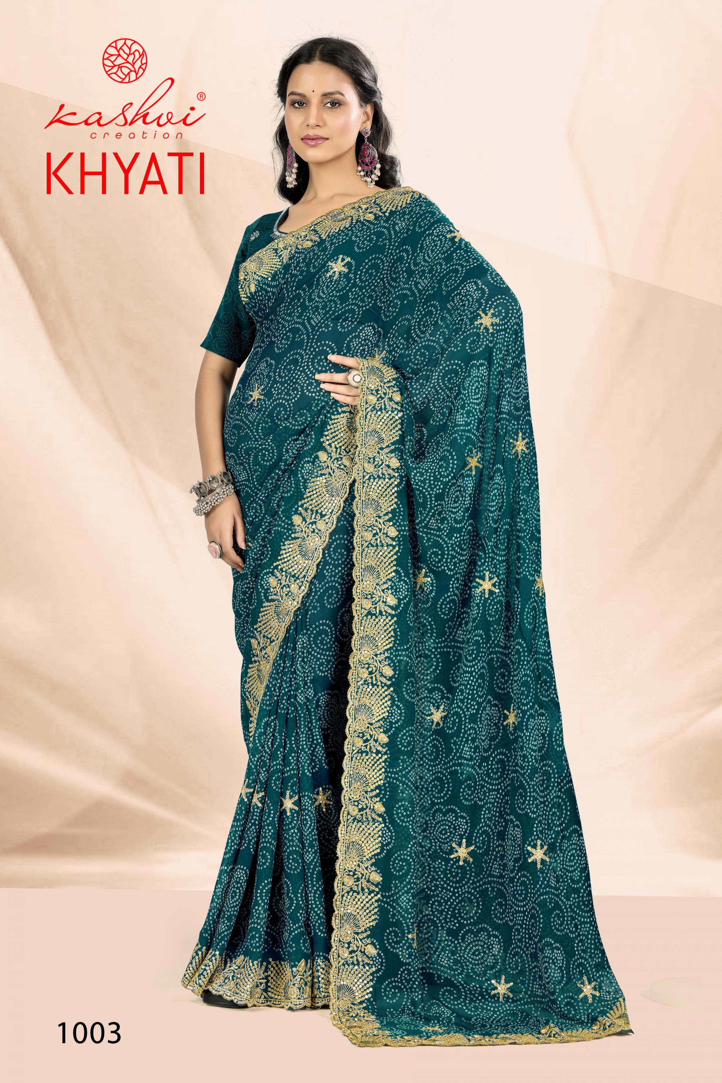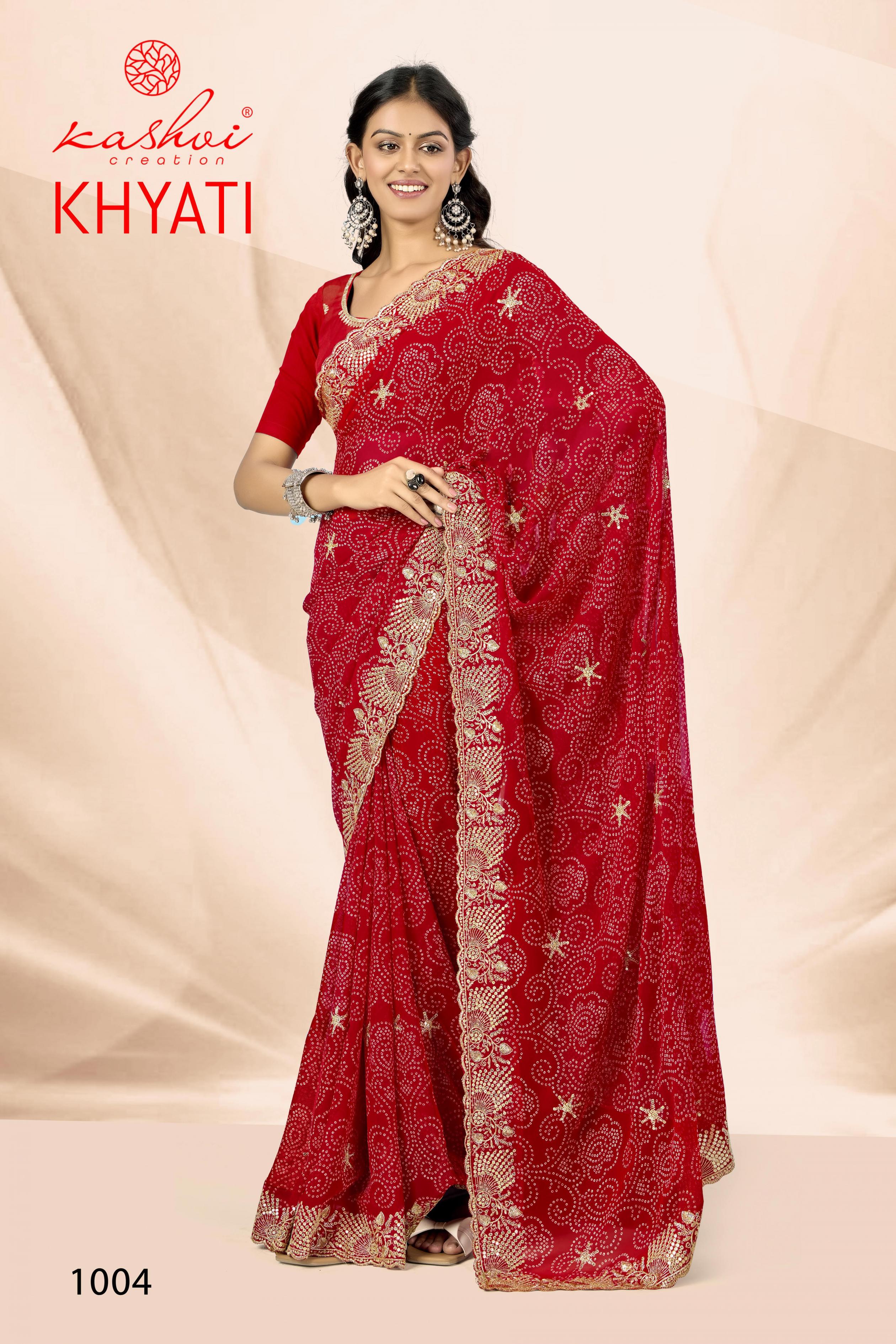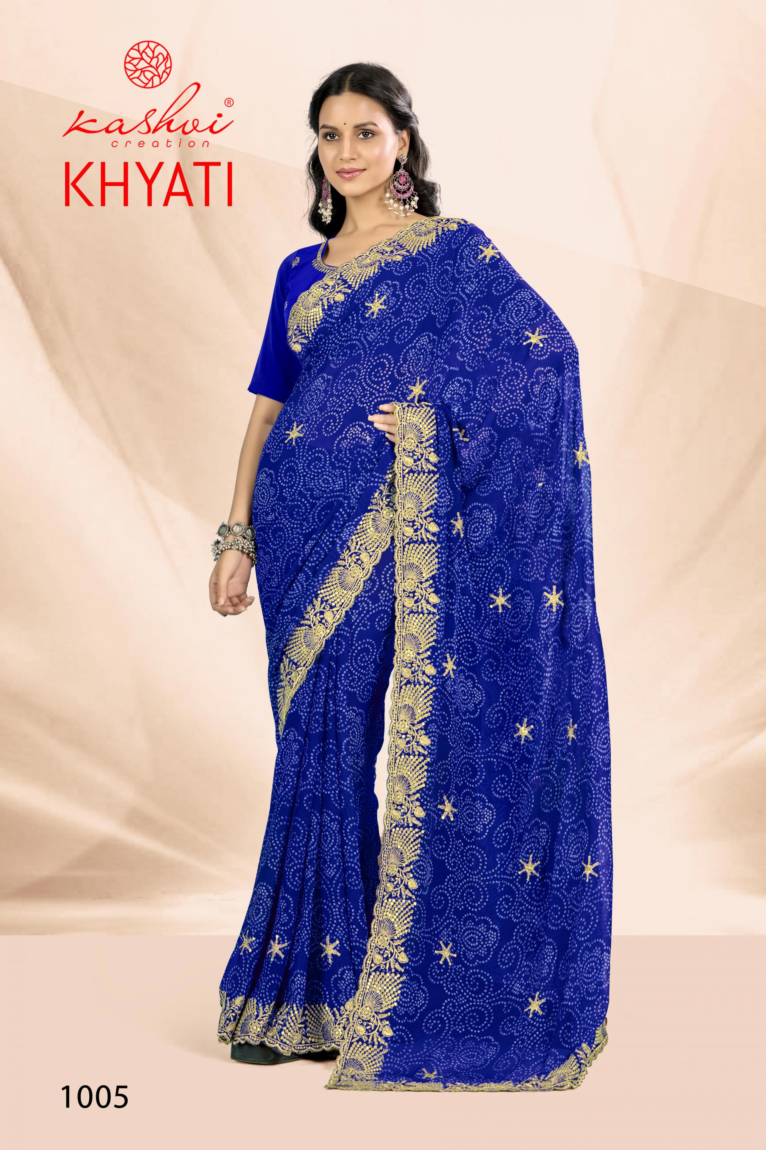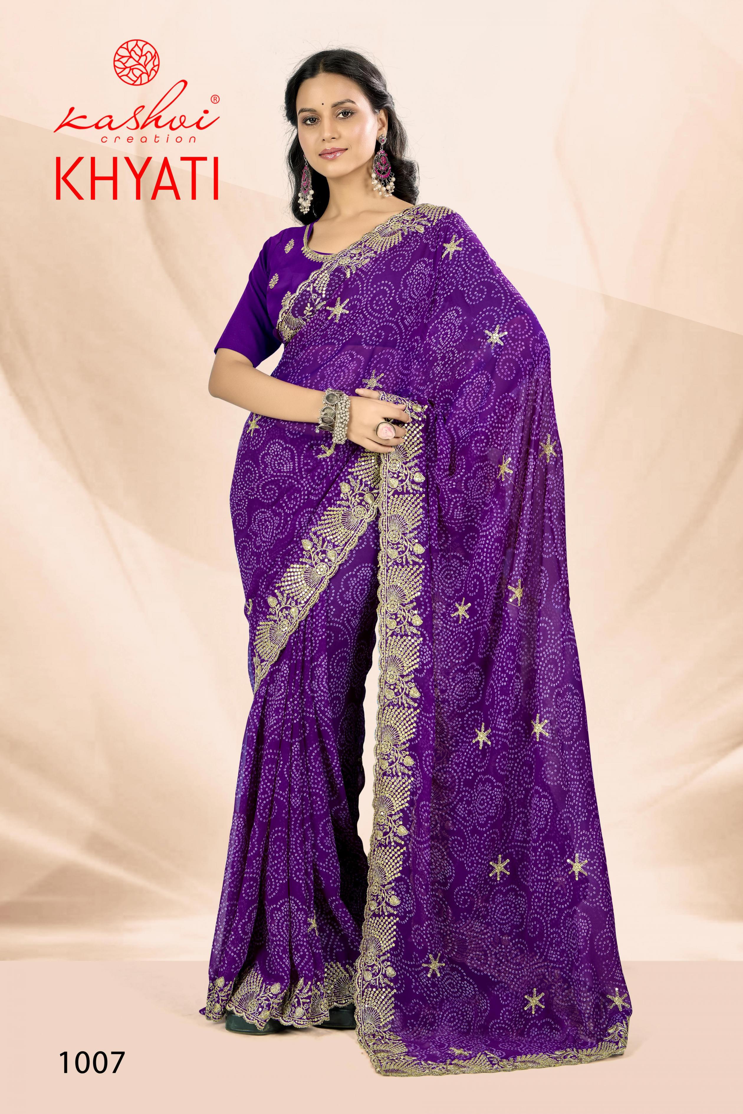 Looking for KHYATI BY KASHVI CREATION GORGETTE CASUAL WEAR SAREE Full Catalouge at Best Price? Buy Now KHYATI BY KASHVI CREATION GORGETTE CASUAL WEAR SAREE at Wholesale Rate of Rs 7320 with Total 8 Pcs from authroized dealer and supplier of Kashvi Creation Brand. Cost of Each piece is just only Rs 915 which is very low and affordable price to resale the product in your retail store. rrgandhi is Surat based Wholesale Supplier & Dealer of Kashvi Creation Brand. Click on Brand name to Know more about Brand's products.