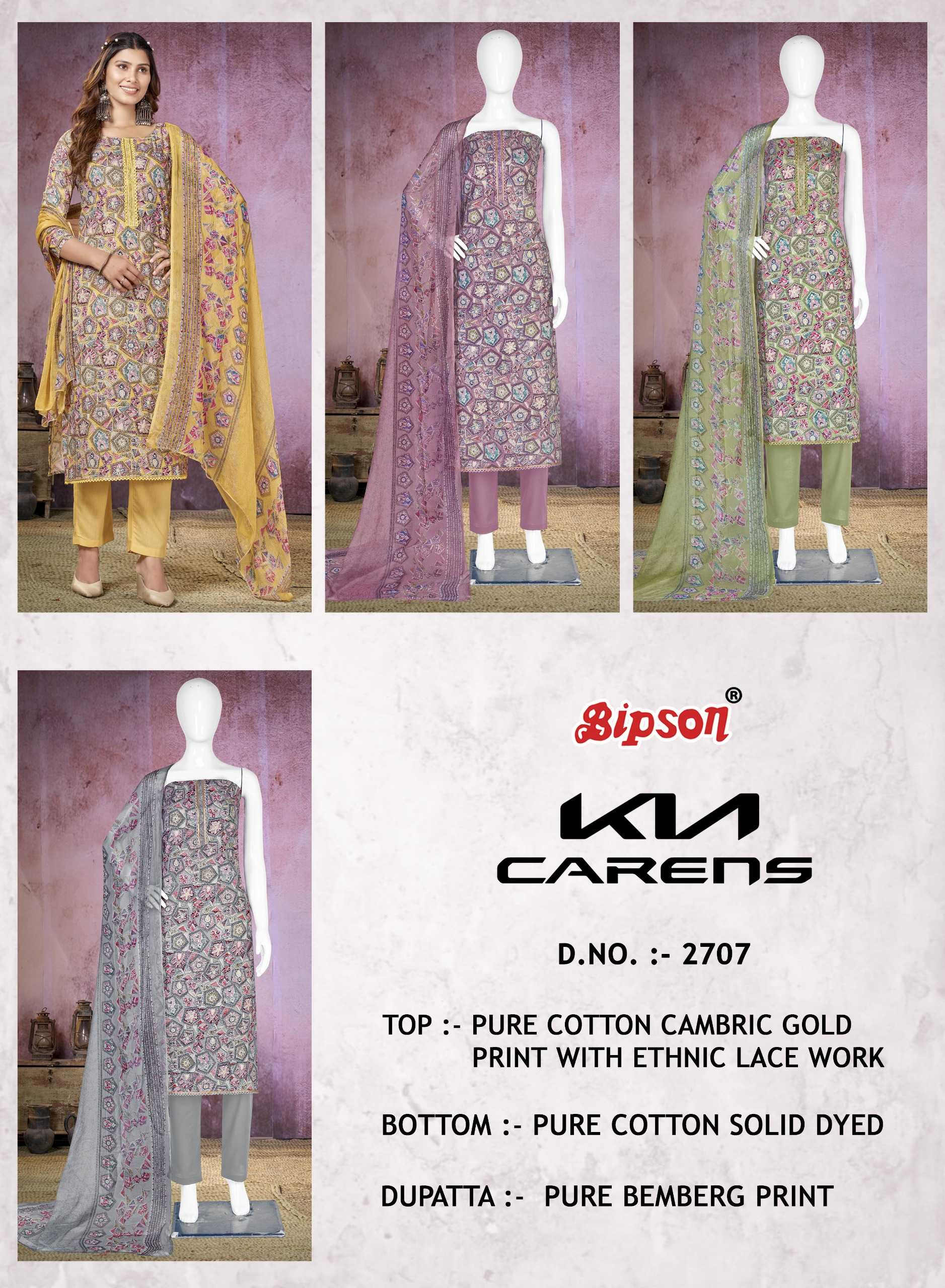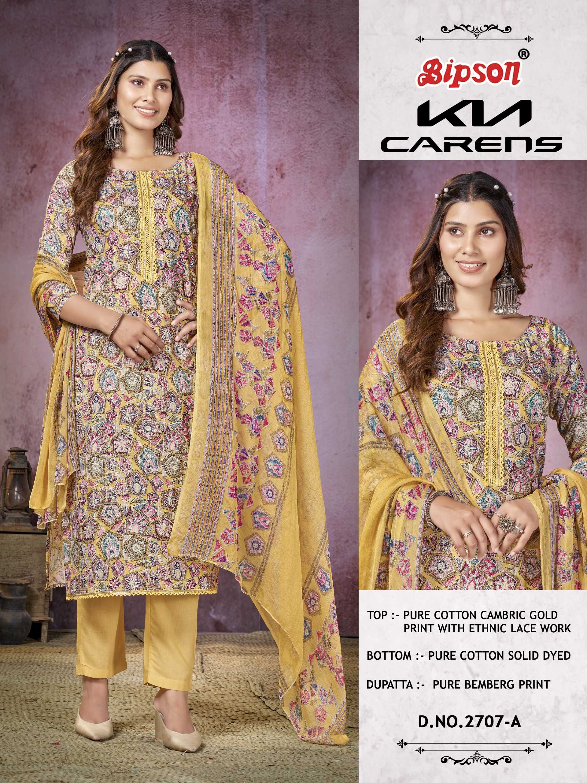 Looking for kia carens 2707 by bipson prints cotton gold print comfy wear dress material Full Catalouge at Best Price? Buy Now kia carens 2707 by bipson prints cotton gold print comfy wear dress material at Wholesale Rate of Rs 2900 with Total 4 Pcs from authroized dealer and supplier of Bipson Fashion Brand. Cost of Each piece is just only Rs 725 which is very low and affordable price to resale the product in your retail store. rrgandhi is Surat based Wholesale Supplier & Dealer of Bipson Fashion Brand. Click on Brand name to Know more about Brand's products.