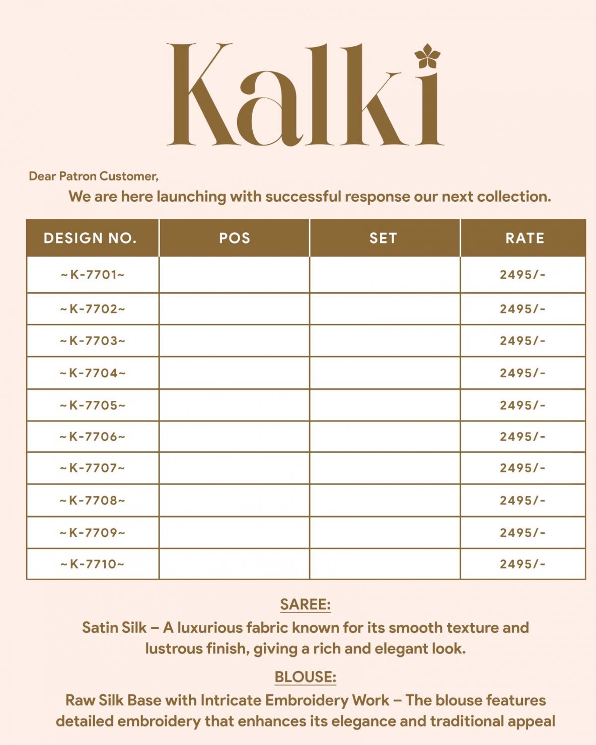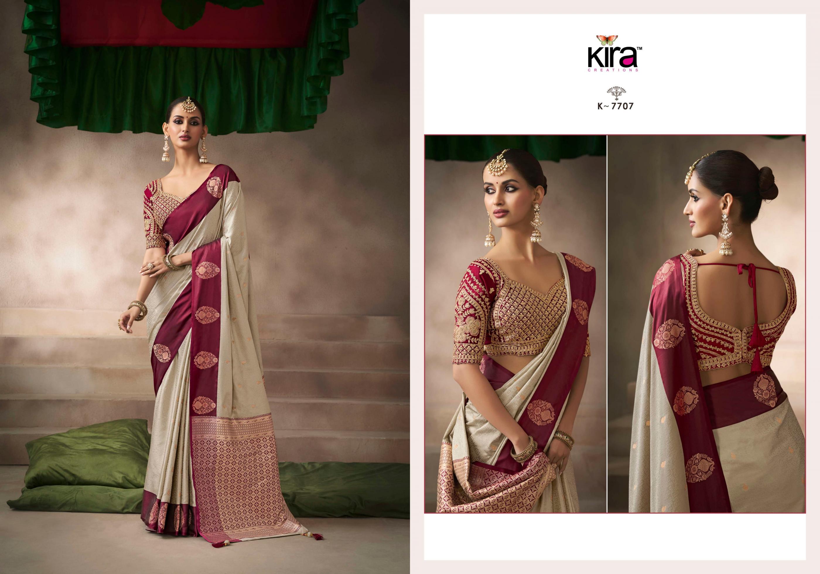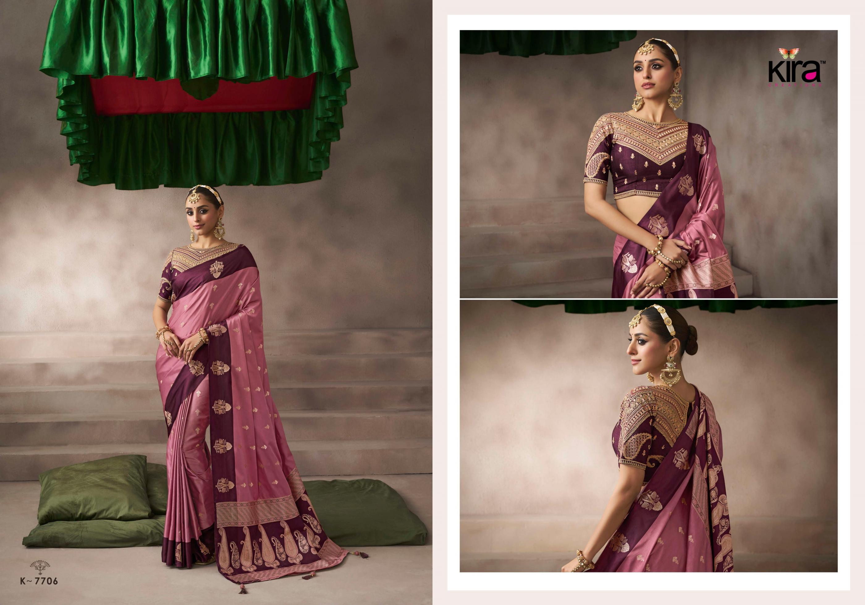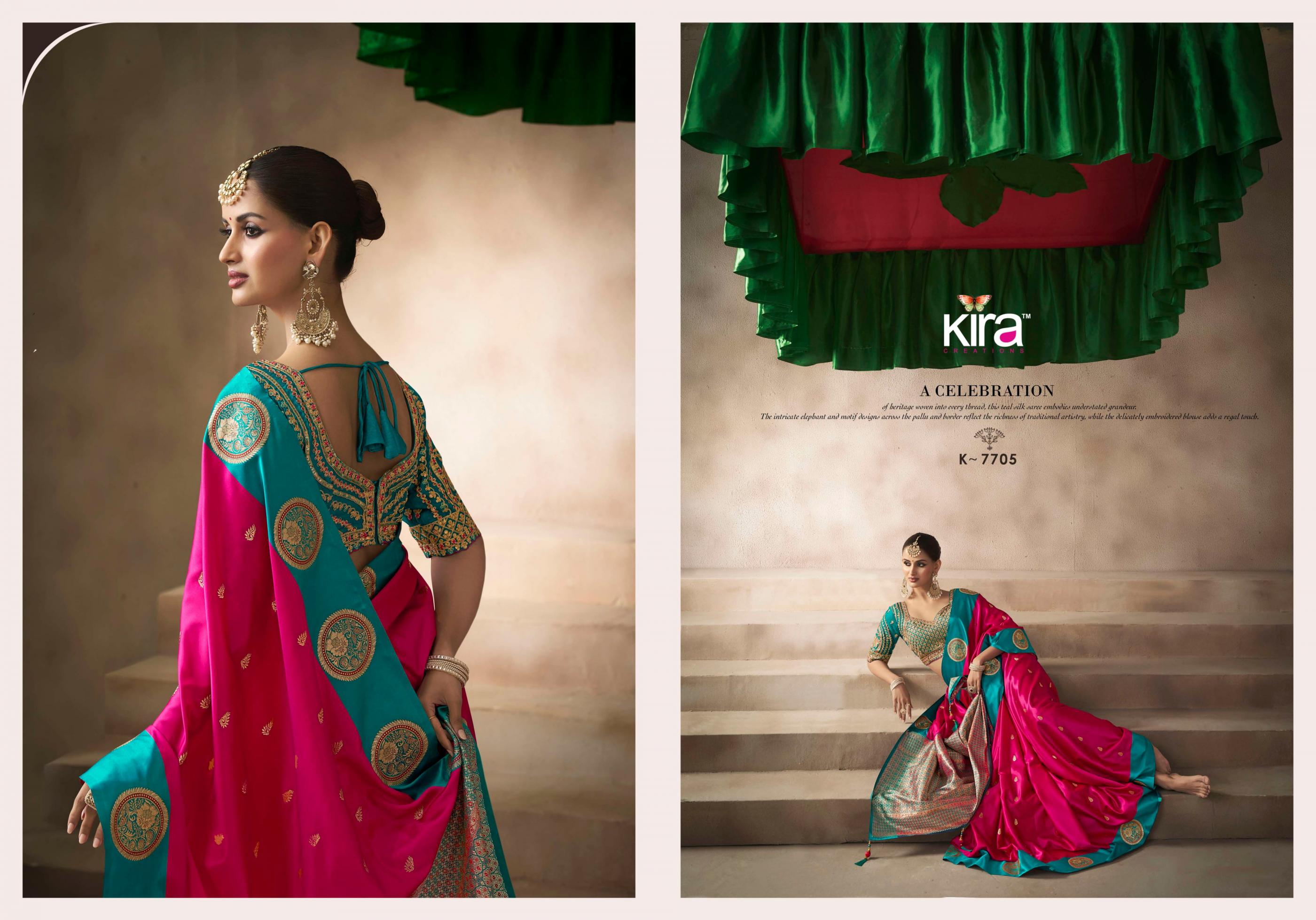 Looking for KIRA CREATION KALKI TRADITIONAL SATIN SILK 7701- 7710 SAREE FOR WOMENS Full Catalouge at Best Price? Buy Now KIRA CREATION KALKI TRADITIONAL SATIN SILK 7701- 7710 SAREE FOR WOMENS at Wholesale Rate of Rs 24950 with Total 10 Pcs from authroized dealer and supplier of Kira Creation Brand. Cost of Each piece is just only Rs 2495 which is very low and affordable price to resale the product in your retail store. rrgandhi is Surat based Wholesale Supplier & Dealer of Kira Creation Brand. Click on Brand name to Know more about Brand's products.