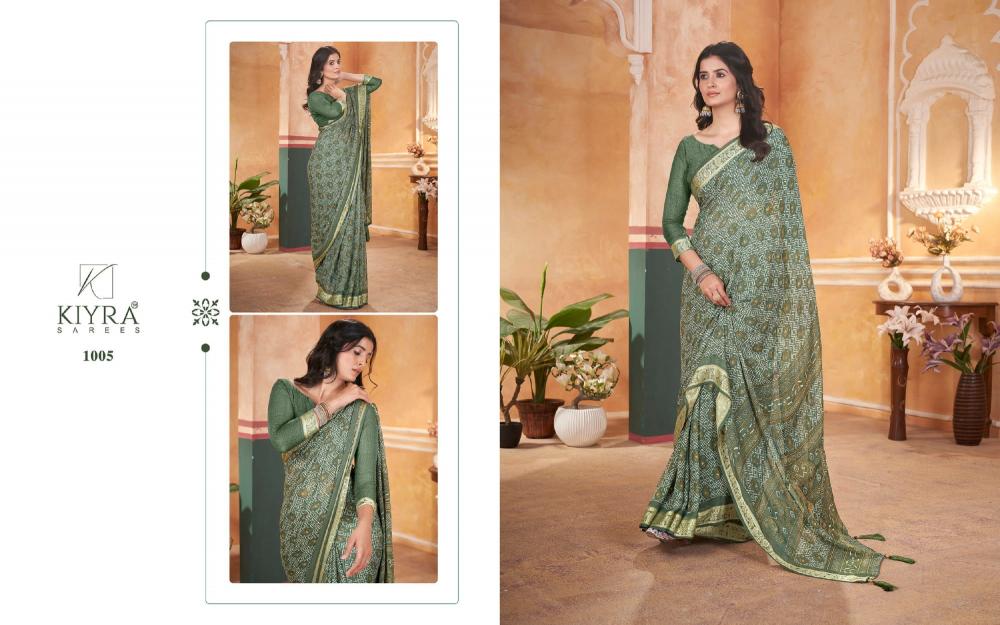 Looking for kiyra launch vrinda vol 1 dull moss attractive look sarees online Full Catalouge at Best Price? Buy Now kiyra launch vrinda vol 1 dull moss attractive look sarees online at Wholesale Rate of Rs 4350 with Total 6 Pcs from authroized dealer and supplier of Kiyra Sarees Brand. Cost of Each piece is just only Rs 725 which is very low and affordable price to resale the product in your retail store. rrgandhi is Surat based Wholesale Supplier & Dealer of Kiyra Sarees Brand. Click on Brand name to Know more about Brand's products.