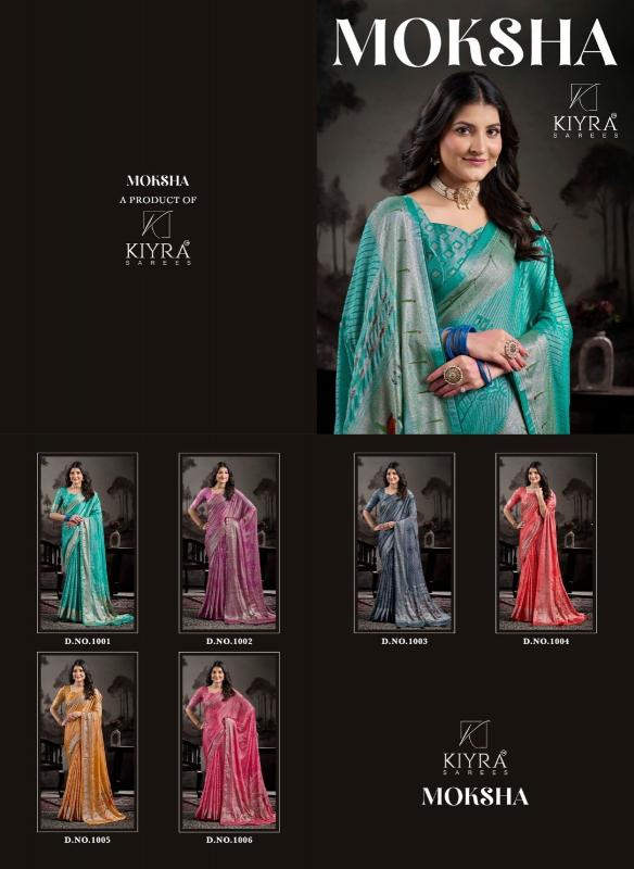 Looking for kiyra moksha vol 1 unique colours dull moss brasso saree wholesaler Full Catalouge at Best Price? Buy Now kiyra moksha vol 1 unique colours dull moss brasso saree wholesaler at Wholesale Rate of Rs 6180 with Total 6 Pcs from authroized dealer and supplier of Kiyra Sarees Brand. Cost of Each piece is just only Rs 1030 which is very low and affordable price to resale the product in your retail store. rrgandhi is Surat based Wholesale Supplier & Dealer of Kiyra Sarees Brand. Click on Brand name to Know more about Brand's products.