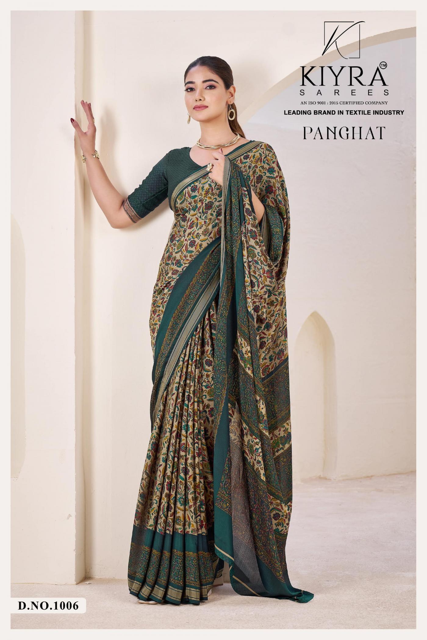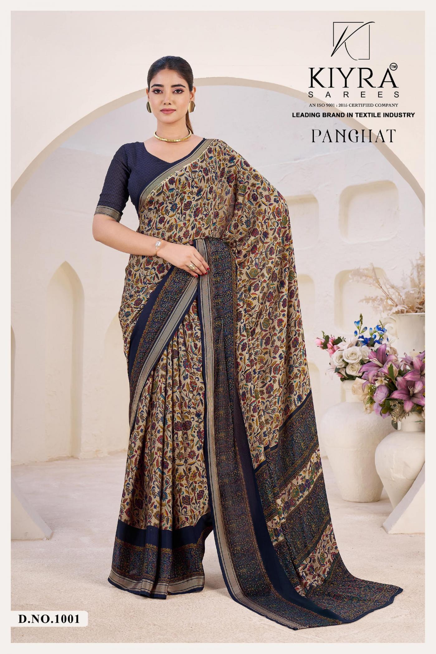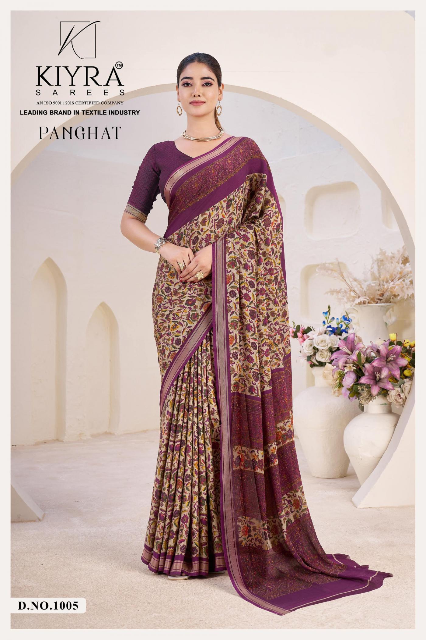 Looking for KIYRA PANGHAT VOL 1 VENILLA SILK HIT DESIGN SAREES Full Catalouge at Best Price? Buy Now KIYRA PANGHAT VOL 1 VENILLA SILK HIT DESIGN SAREES at Wholesale Rate of Rs 4470 with Total 6 Pcs from authroized dealer and supplier of Kiyra Sarees Brand. Cost of Each piece is just only Rs 745 which is very low and affordable price to resale the product in your retail store. rrgandhi is Surat based Wholesale Supplier & Dealer of Kiyra Sarees Brand. Click on Brand name to Know more about Brand's products.