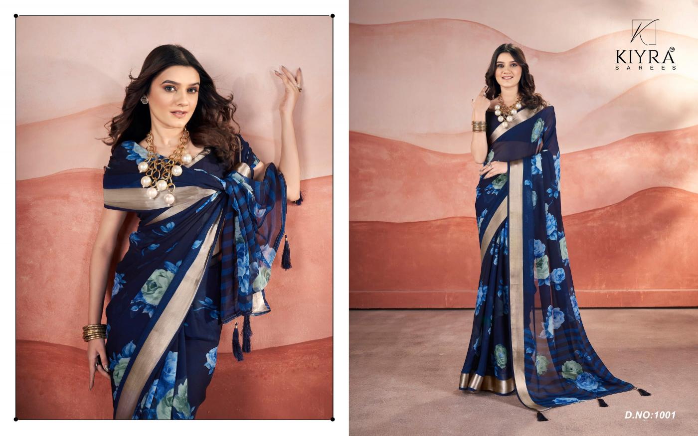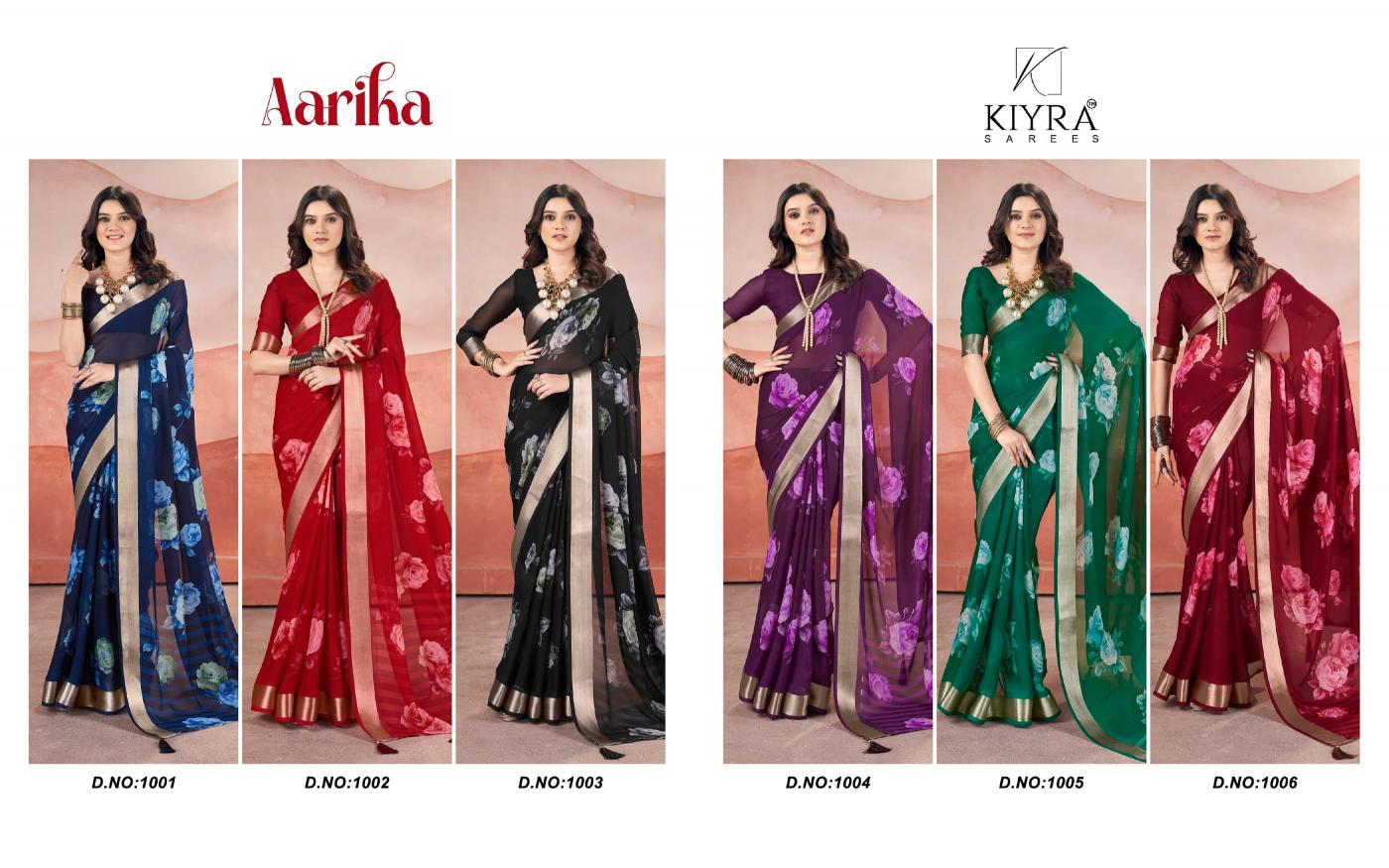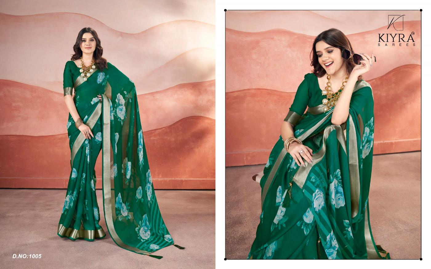 Looking for kiyra presents aarika vol 1 dull moss fancy saree collection Full Catalouge at Best Price? Buy Now kiyra presents aarika vol 1 dull moss fancy saree collection at Wholesale Rate of Rs 3570 with Total 6 Pcs from authroized dealer and supplier of Kiyra Sarees Brand. Cost of Each piece is just only Rs 595 which is very low and affordable price to resale the product in your retail store. rrgandhi is Surat based Wholesale Supplier & Dealer of Kiyra Sarees Brand. Click on Brand name to Know more about Brand's products.