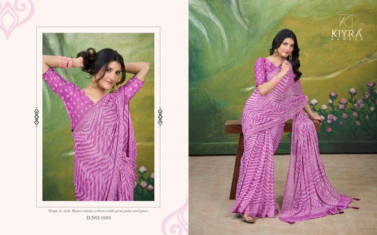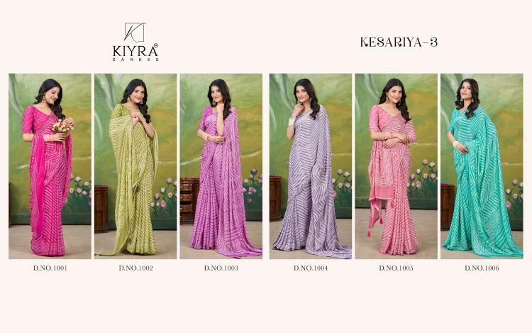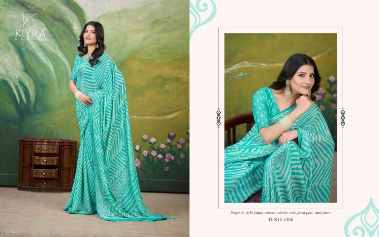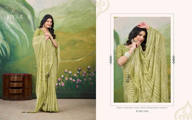 Looking for kiyra presents kesariya vol 3 dull moss hit design saree with fancy blouse Full Catalouge at Best Price? Buy Now kiyra presents kesariya vol 3 dull moss hit design saree with fancy blouse at Wholesale Rate of Rs 3420 with Total 6 Pcs from authroized dealer and supplier of Kiyra Sarees Brand. Cost of Each piece is just only Rs 570 which is very low and affordable price to resale the product in your retail store. rrgandhi is Surat based Wholesale Supplier & Dealer of Kiyra Sarees Brand. Click on Brand name to Know more about Brand's products.