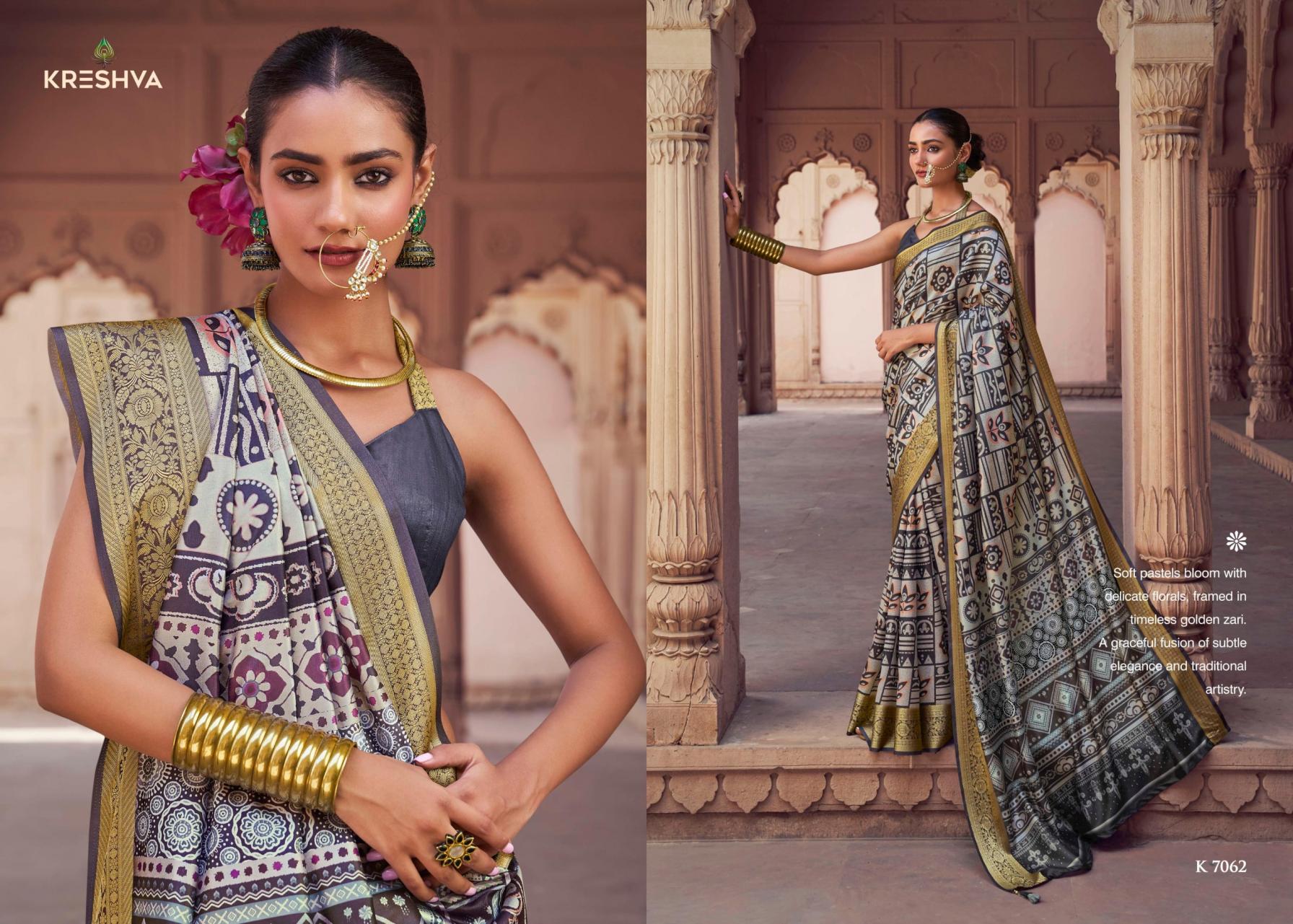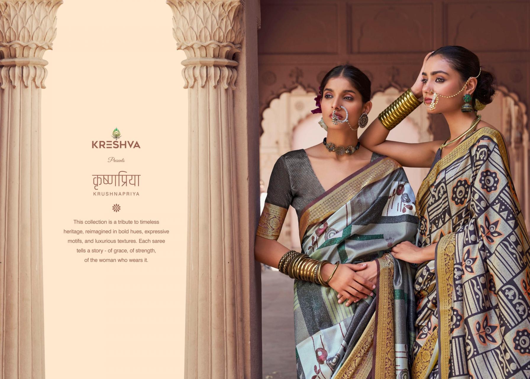 Looking for KRESHVA KRUSHNAPRIYA UNIQUE SILK SAREES Full Catalouge at Best Price? Buy Now KRESHVA KRUSHNAPRIYA UNIQUE SILK SAREES at Wholesale Rate of Rs 10360 with Total 8 Pcs from authroized dealer and supplier of Kreshva Brand. Cost of Each piece is just only Rs 1295 which is very low and affordable price to resale the product in your retail store. rrgandhi is Surat based Wholesale Supplier & Dealer of Kreshva Brand. Click on Brand name to Know more about Brand's products.