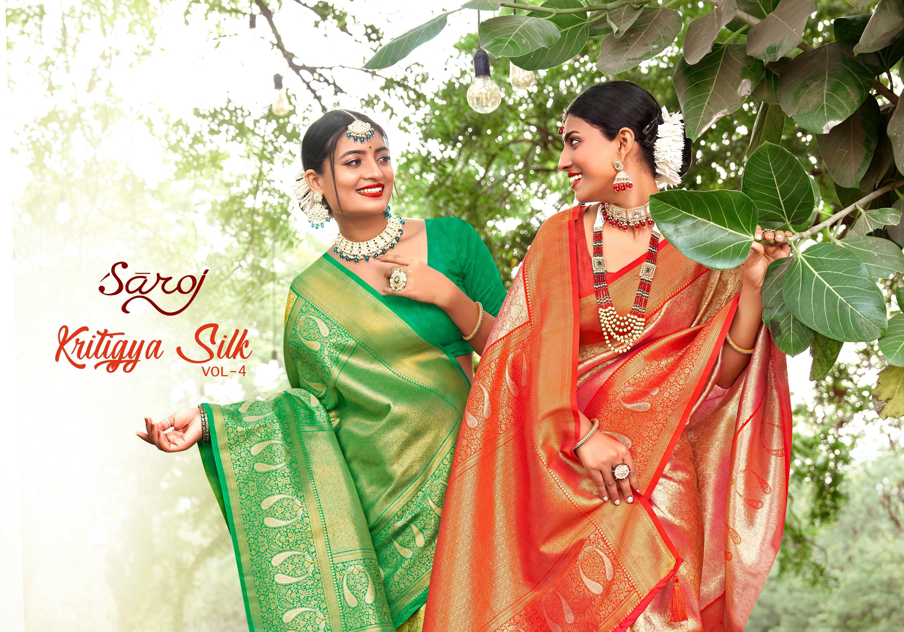 Looking for Kritigya Silk Saroj vol.4 Silk saree Full Catalouge at Best Price? Buy Now Kritigya Silk Saroj vol.4 Silk saree at Wholesale Rate of Rs 5300 with Total 5 Pcs from authroized dealer and supplier of Saroj Textiles Brand. Cost of Each piece is just only Rs 1060 which is very low and affordable price to resale the product in your retail store. rrgandhi is Surat based Wholesale Supplier & Dealer of Saroj Textiles Brand. Click on Brand name to Know more about Brand's products.